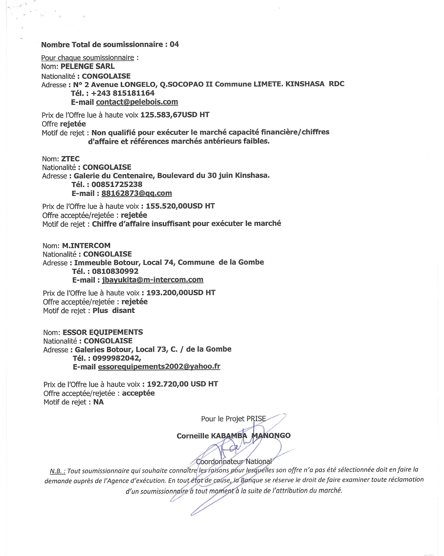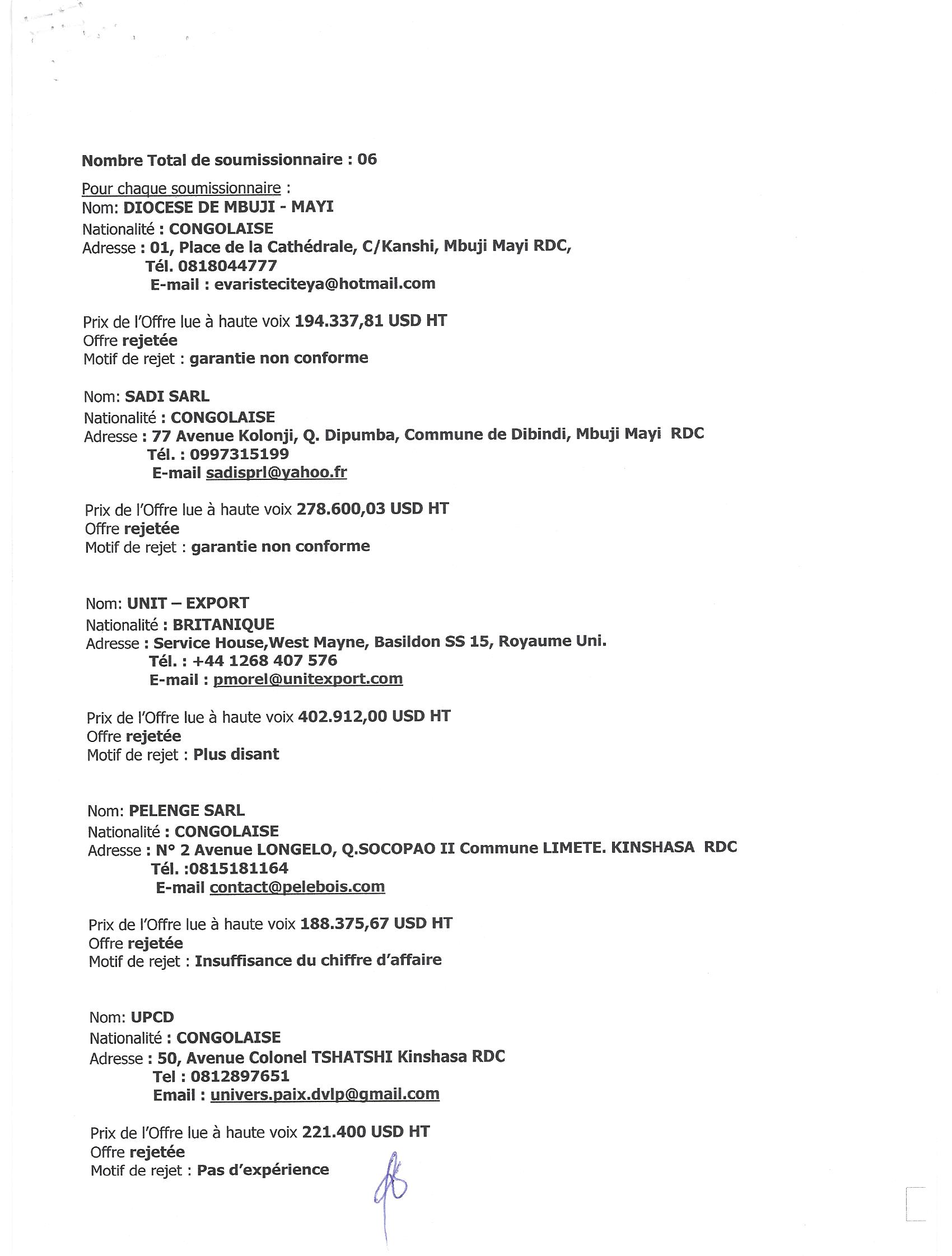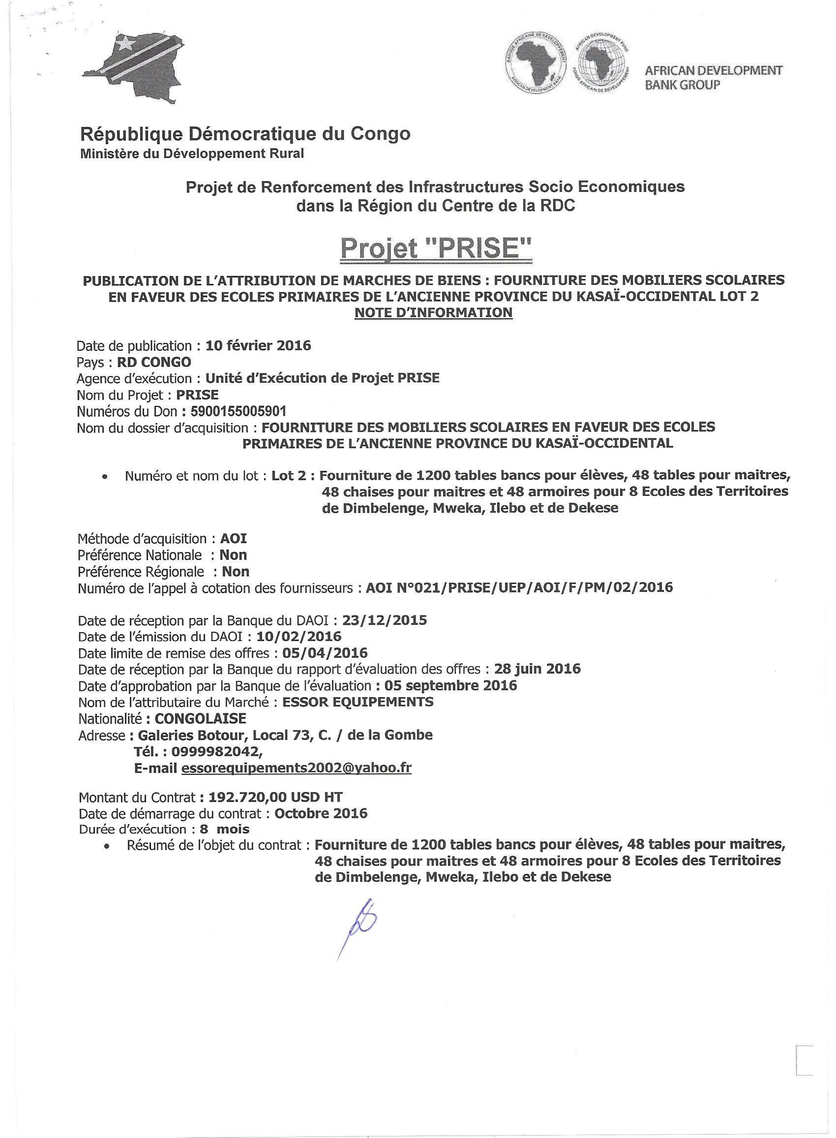 Attribution de marché de fourniture des mobiliers scolaires en faveur des écoles primaires de l’ancienne province du Kasaï-Occidental LOT 2
