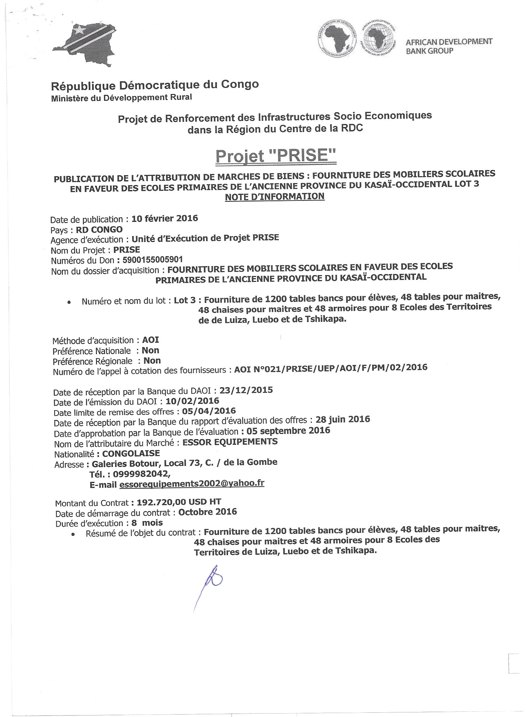 Attribution de marché de fourniture des mobiliers scolaires en faveur des écoles primaires de l’ancienne province du Kasaï-Occidental LOT 3