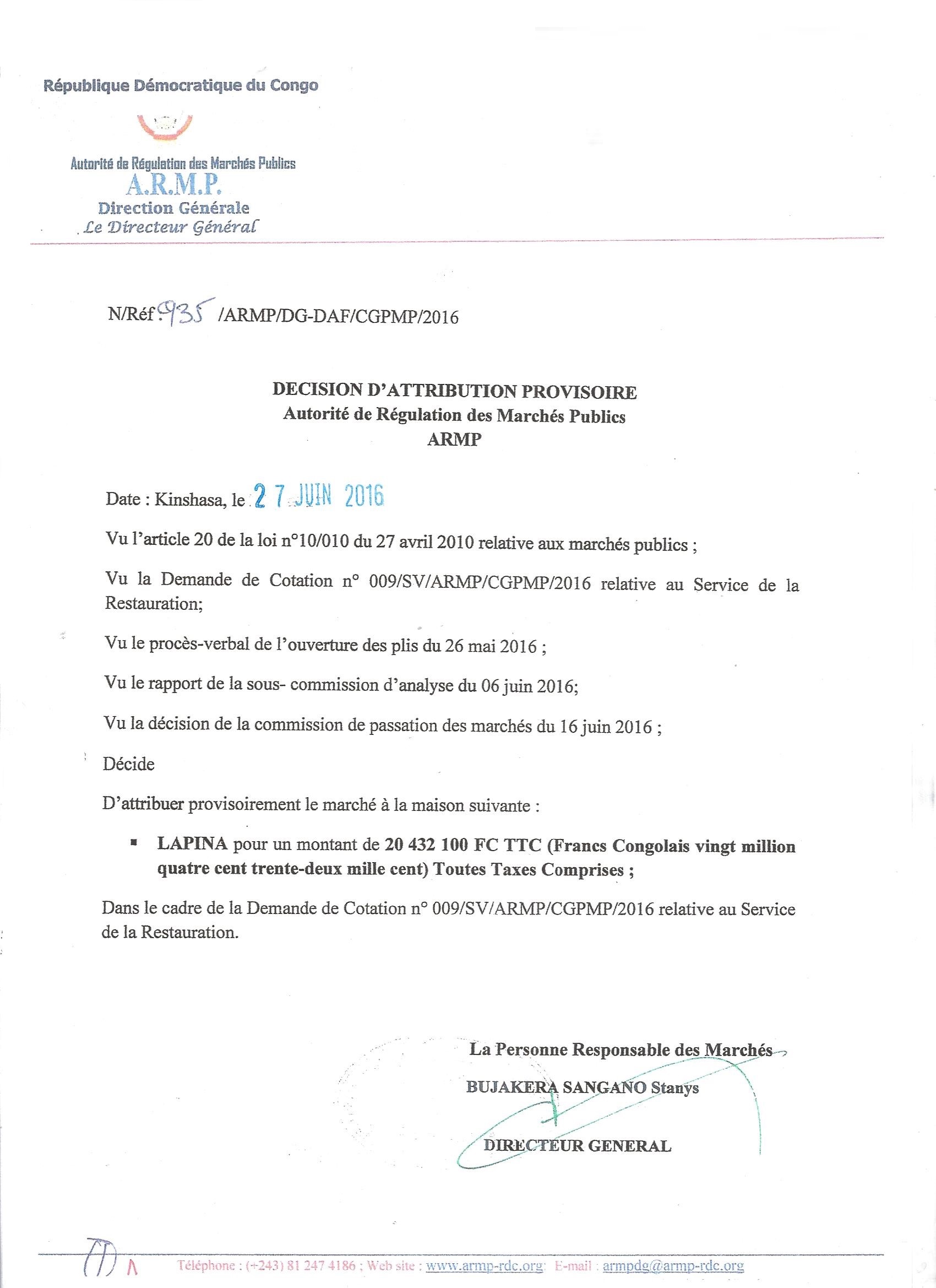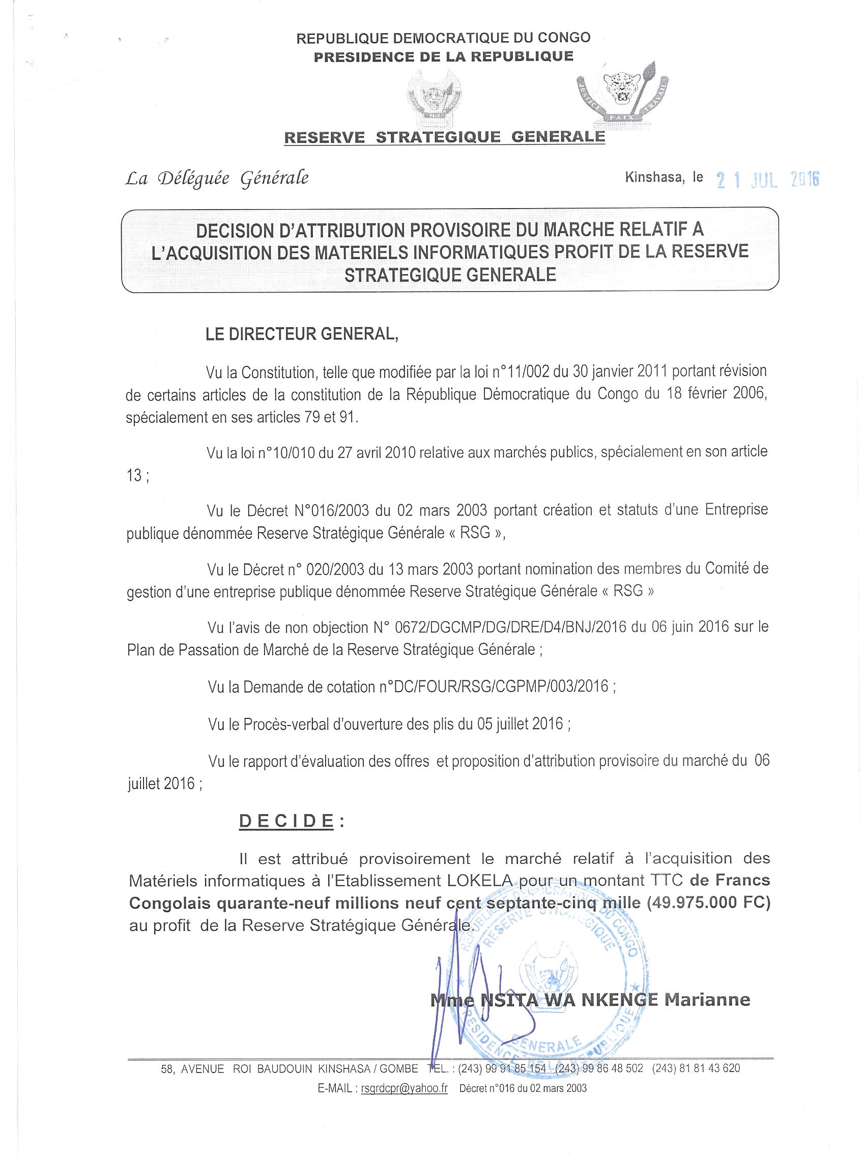 Attribution provisoire du marché relatif à l’acquisition des matériels informatiques au profit de la réserve stratégique générale à L’ETABLISSEMENT LOKELA.