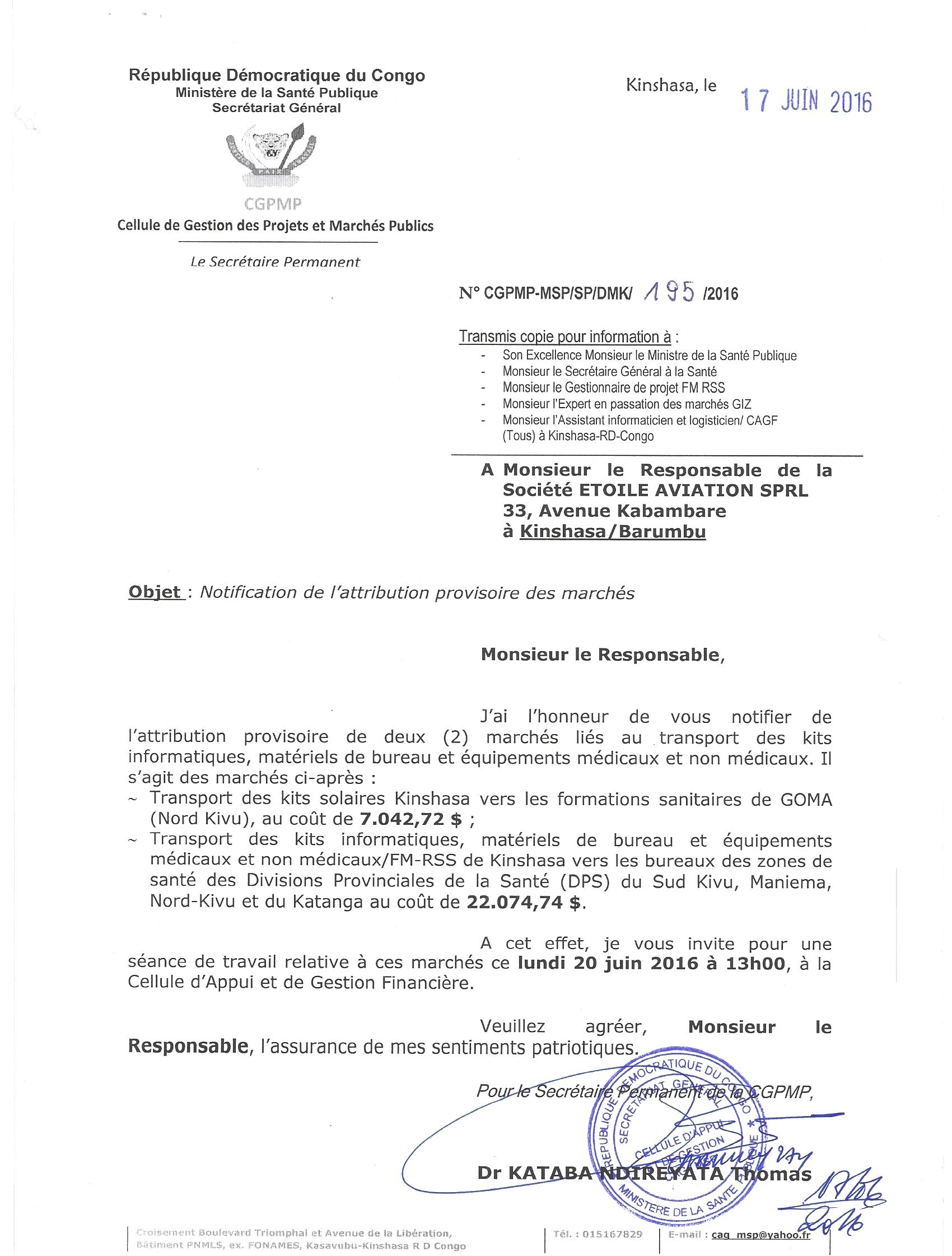 Attribution provisoire de trois (3) marchés liés au transport des kits informatiques, matériels de bureau et équipements médicaux et non médicaux à la société ETOILE AVIATION SPRL.