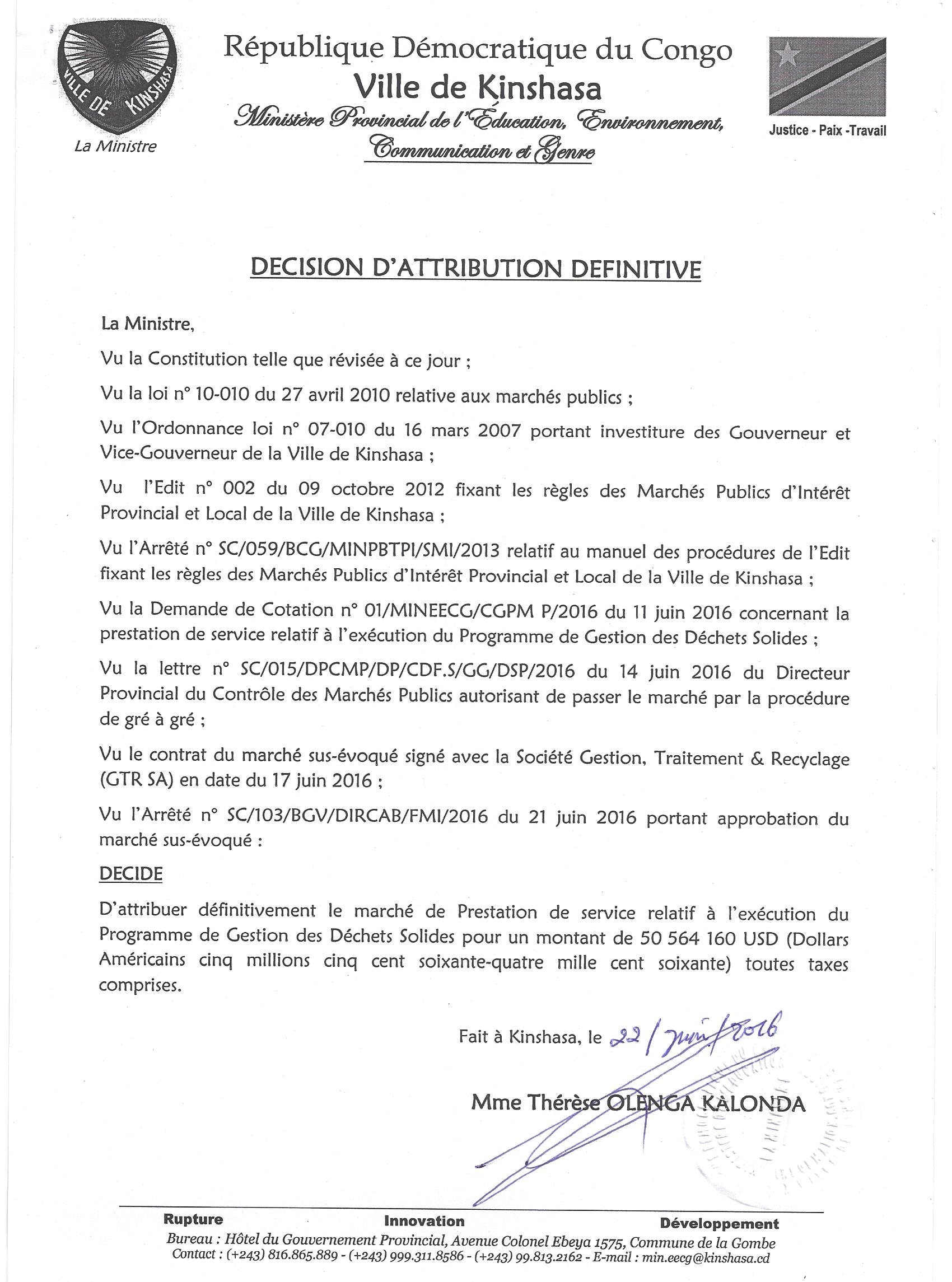 Marché de prestation de service relatif à l’exécution du programme de gestion des déchets solides à la société gestion, traitement & recyclage (gtr sa)
