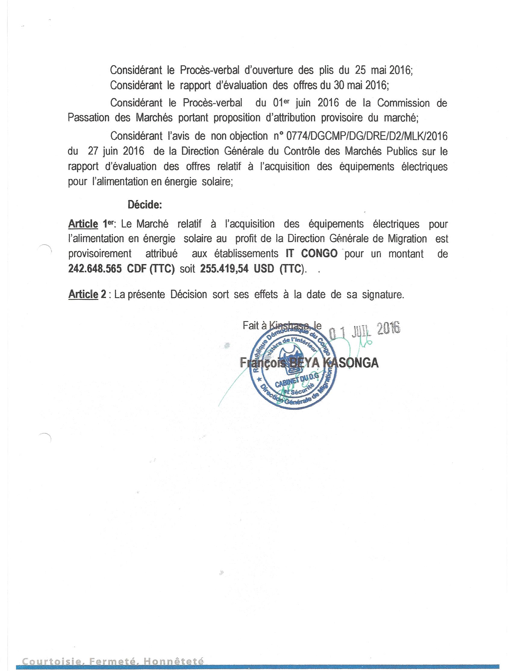 Attribution provisoire du marché relatif à l’acquisition des équipements électriques pour l’alimentation en énergie solaire au profit de la direction générale de migration attribué aux ÉTABLISSEMENTS IT CONGO.