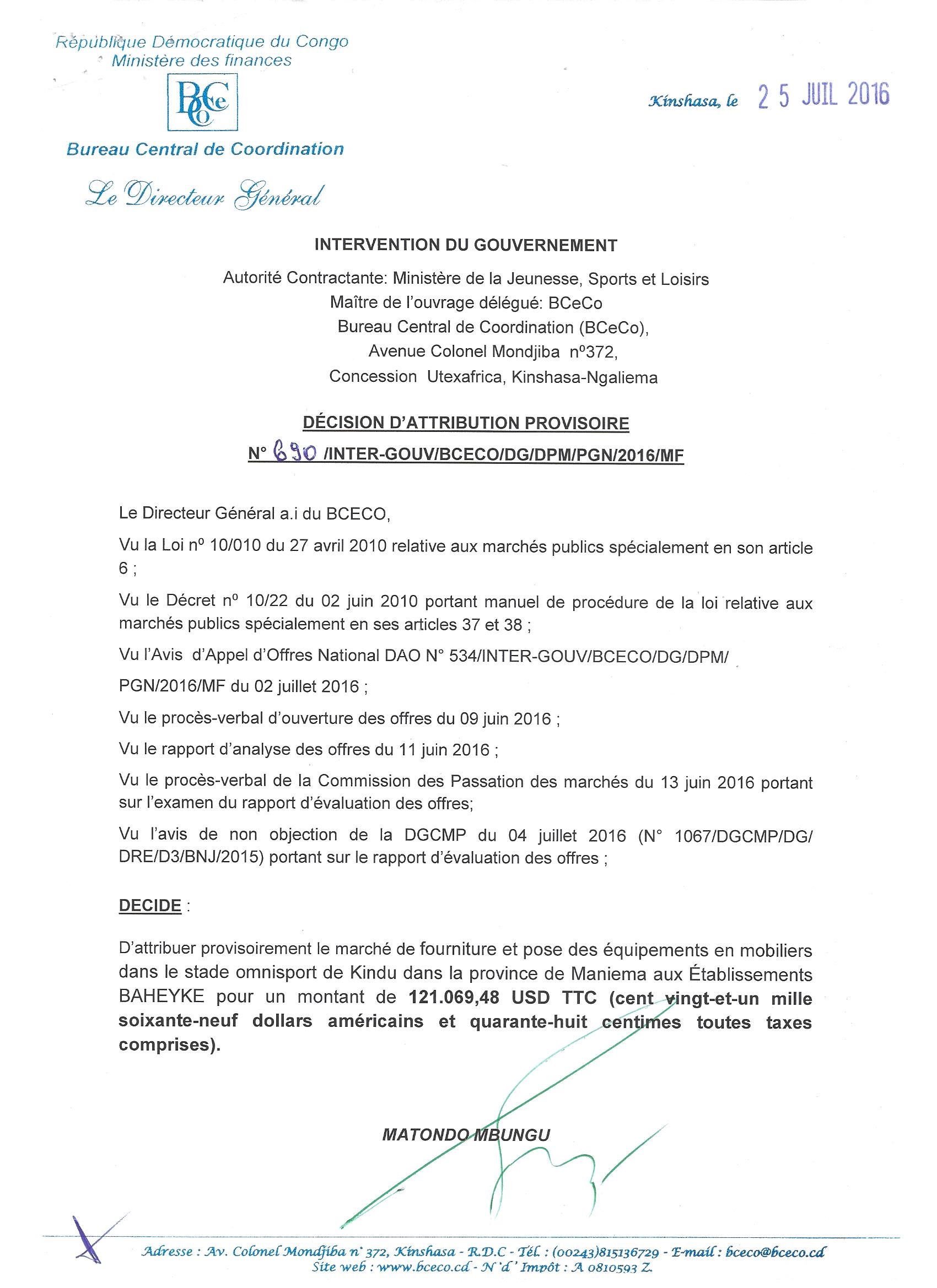 Attribution provisoire du marché de fourniture et pose des équipements en mobiliers dans le stade omnisport de Kindu dans la province de Maniema aux ETABLISSEMENTS BAHEYKE.