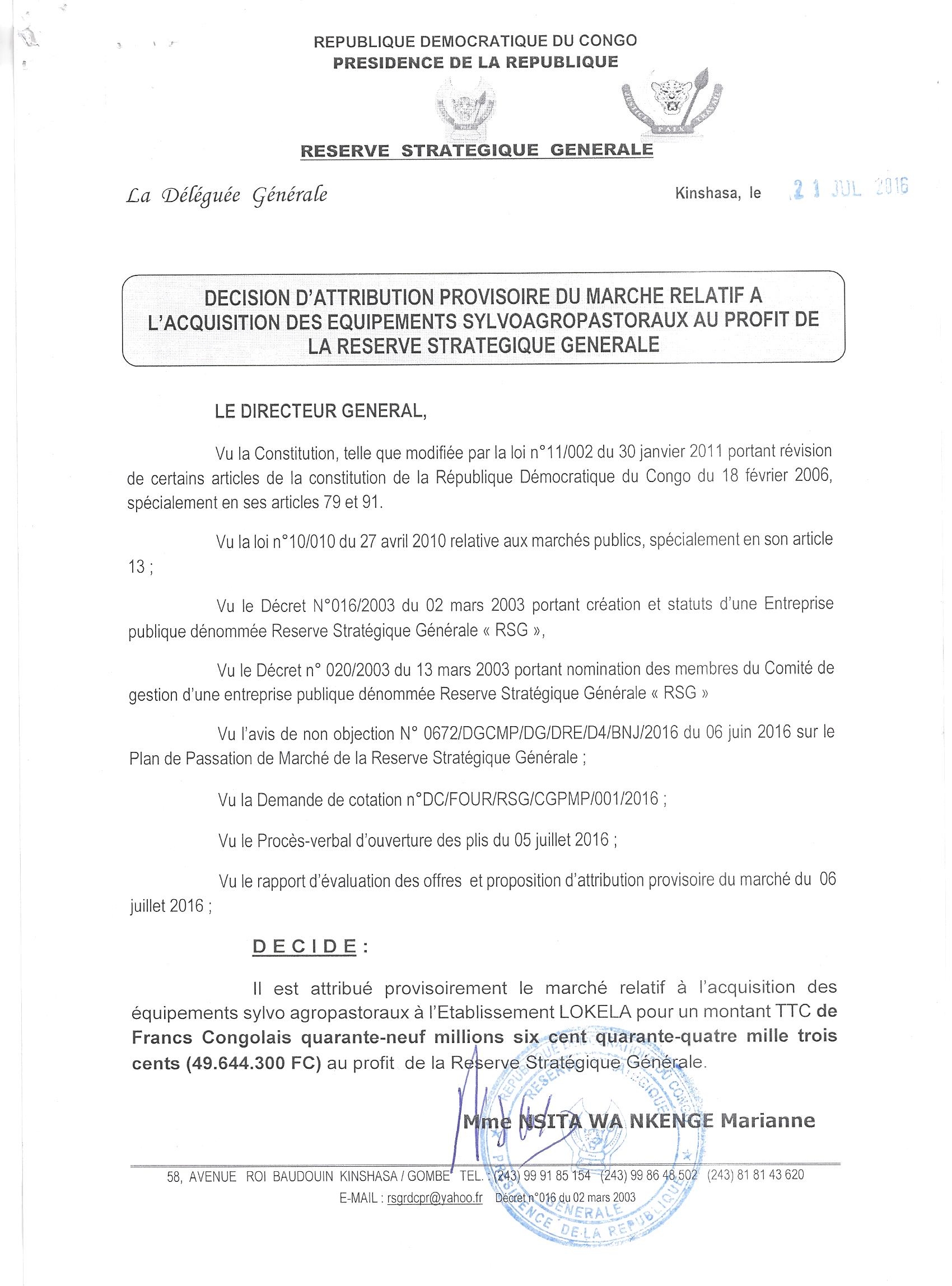 Attribution provisoire du marché relatif à l’acquisition des matériels aratoires au profit de la réserve stratégique générale à L’ETABLISSEMENT LOKELA.