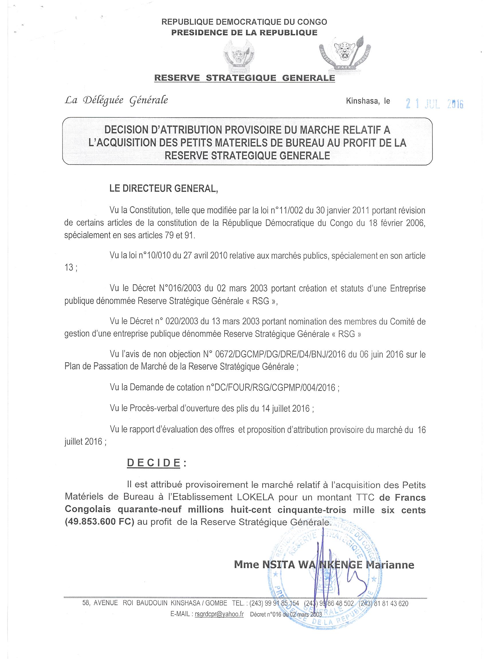 Attribution provisoire du marché relatif à l’acquisition des petits matériels de bureau au profit de la réserve stratégique générale à L’ETABLISSEMENT LOKELA.