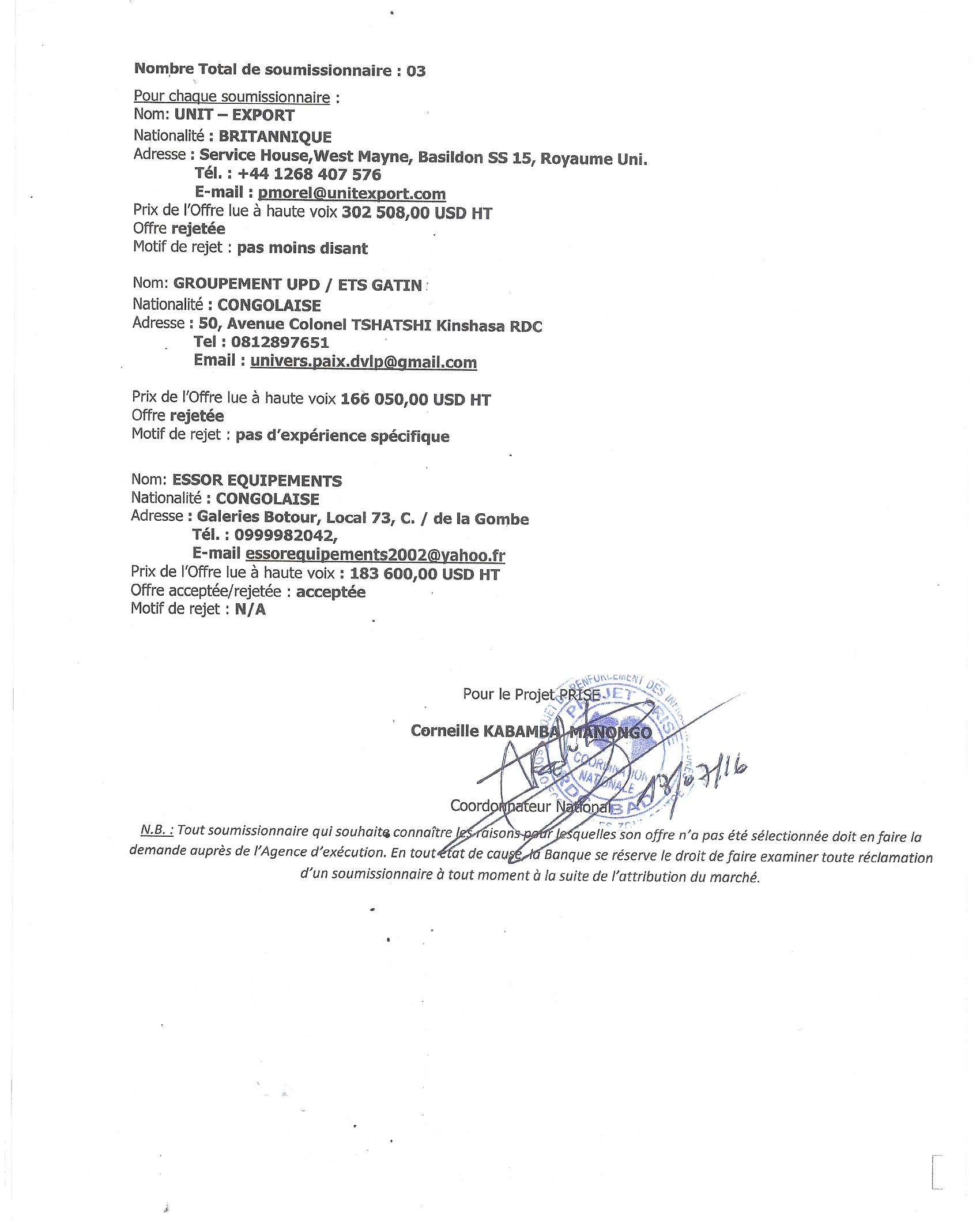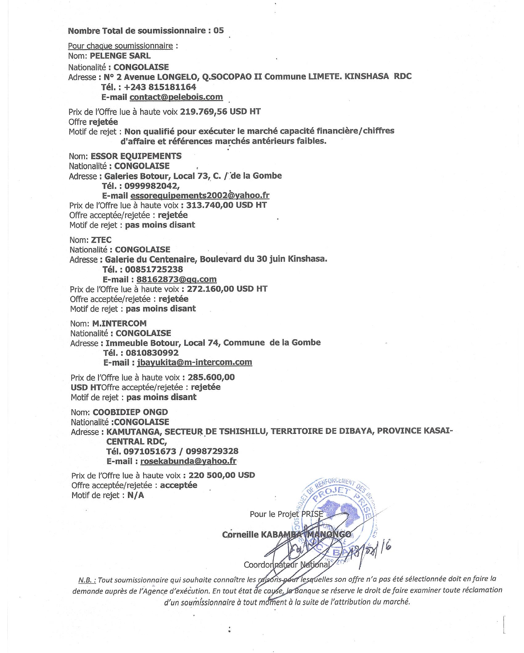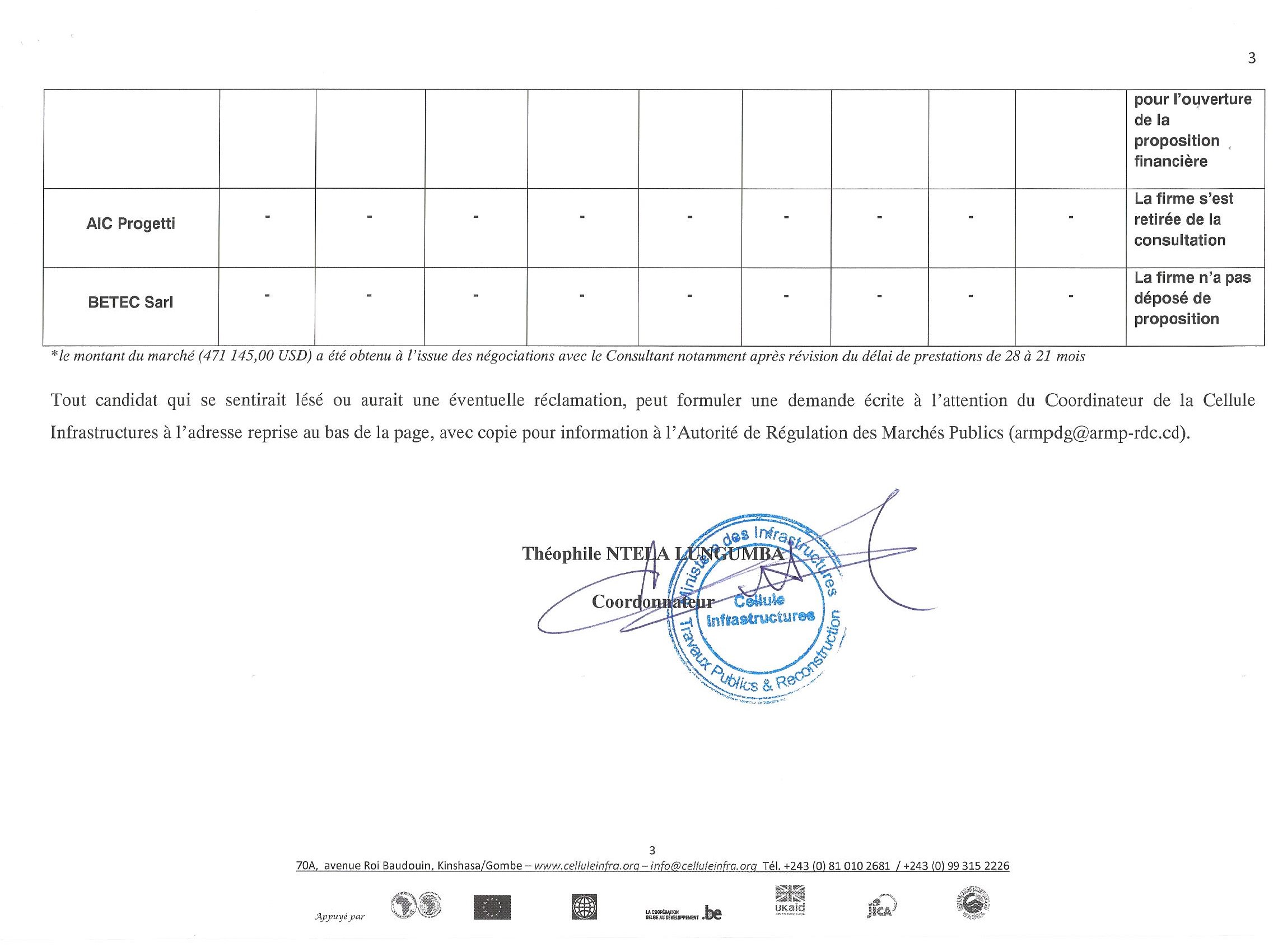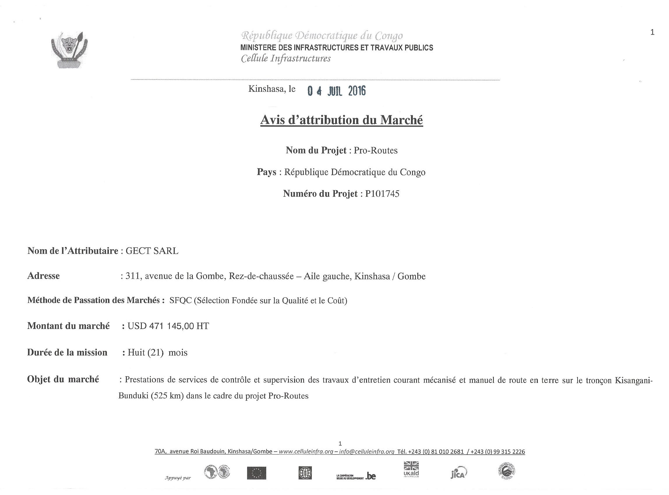 marché de prestation de service de contrôle et supervision des travaux d’entretien courant mécanisé et manuel de route en terre sur le tronçon kisangani-bunduki dans le cadre du projet pro-routes à la firme GECT SARL.