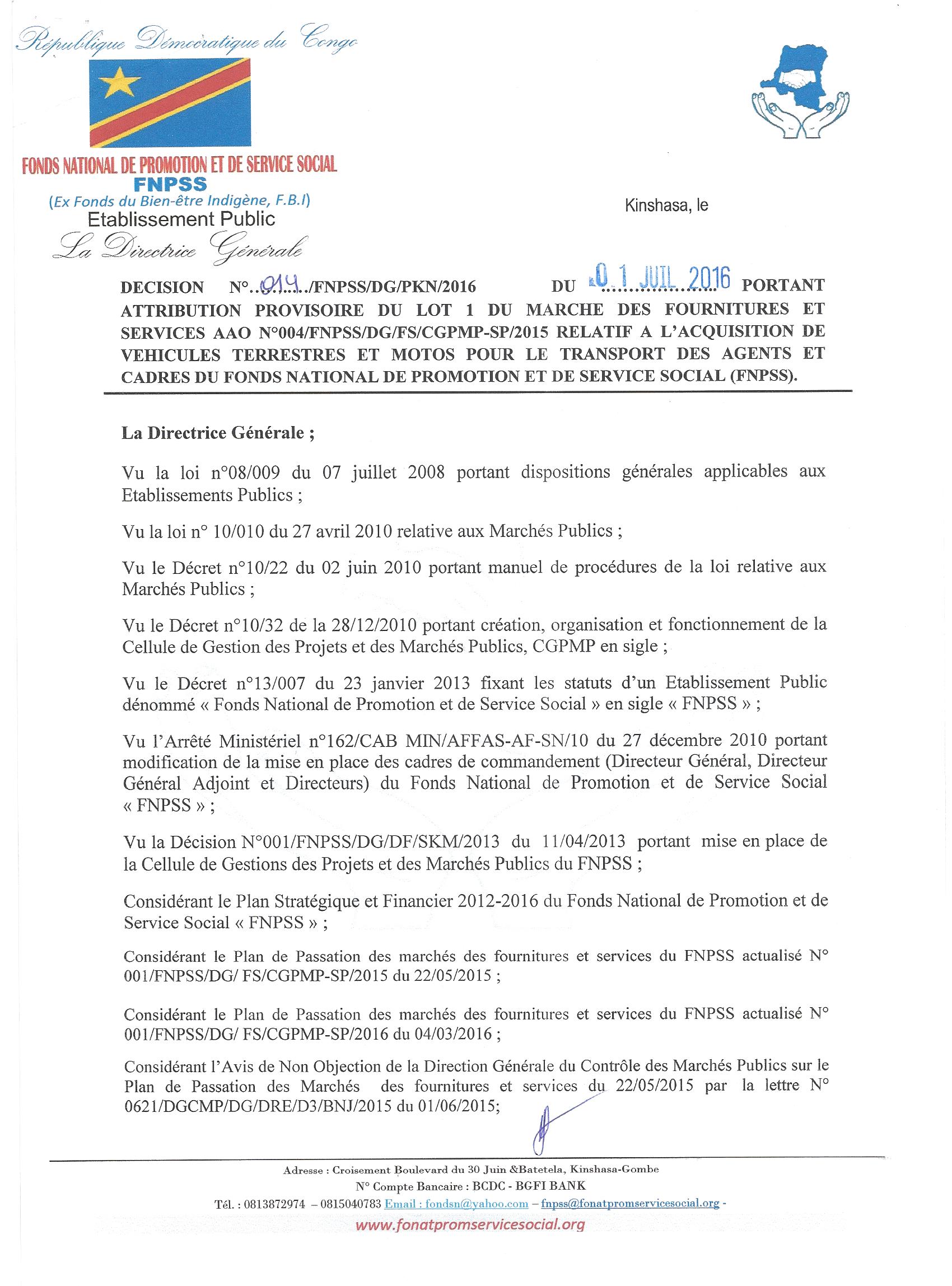 Attribution provisoire du marché des fournitures et services relatif à l’acquisition de véhicules terrestres et motos pour le transport des agents et cadres du fonds national de promotion et de service social (FNPSS).LOT 1