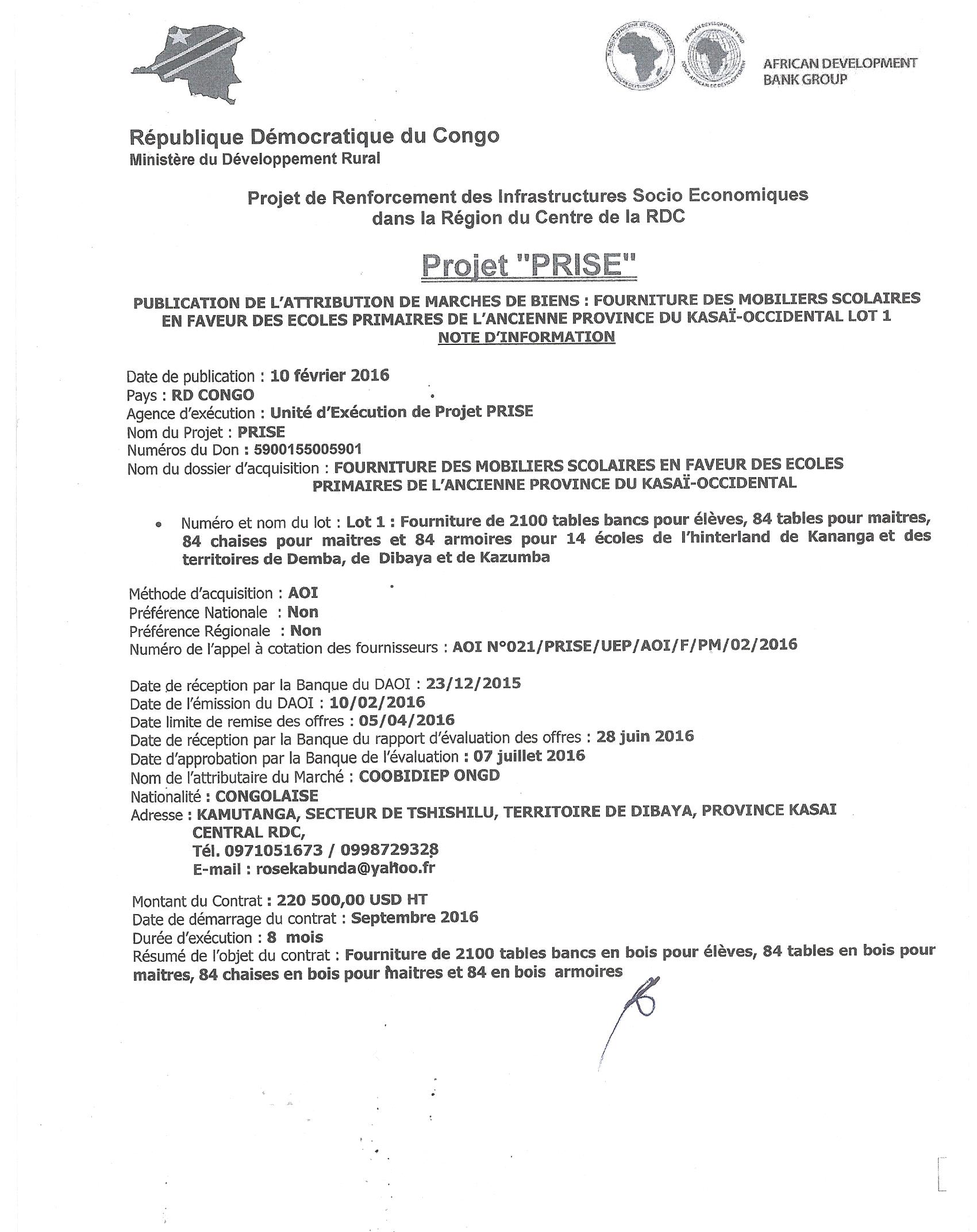 Attribution de marchés de fourniture des mobiliers scolaires en faveur des écoles primaires de l’ancienne province du Kasaï-Occidental LOT 1 à COOBIDIEP ONGD.