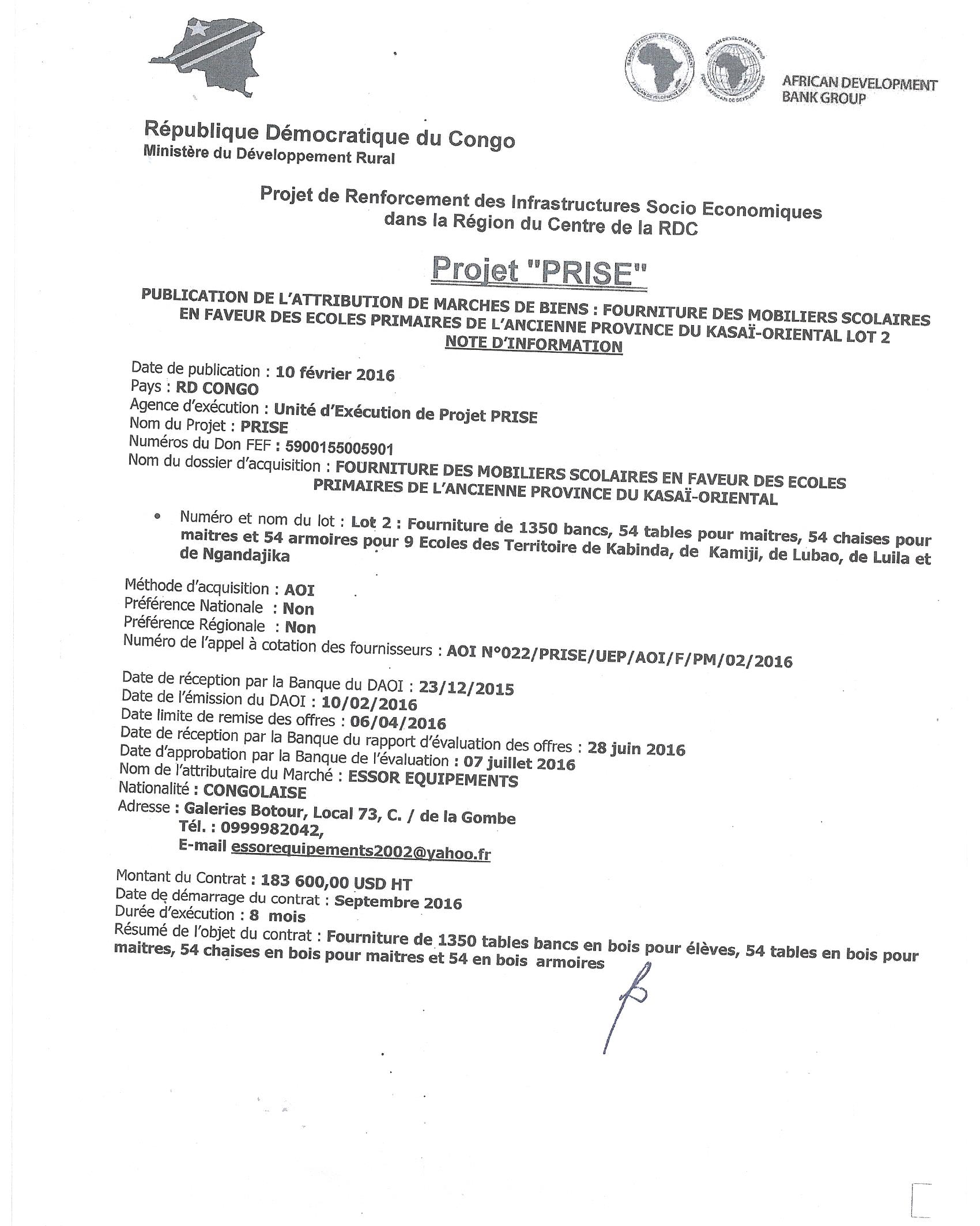 Attribution de marchés de fourniture des mobiliers scolaires en faveur des écoles primaires de l’ancienne province du Kasaï-Oriental lot 2 à ESSOR EQUIPEMENTS.
