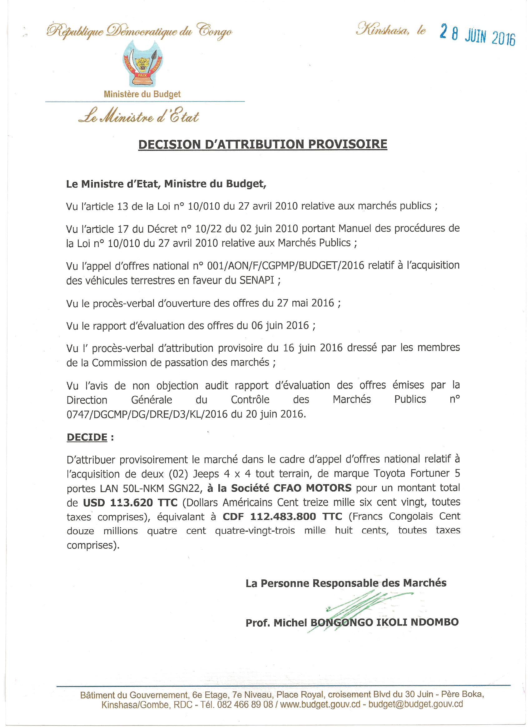 Attribution provisoire du marché relatif à l’acquisition de deux (02) jeeps 4×4 tout terrain, de marque Toyota fortuner 5 portes land 50l-nkm sgn22, à LA SOCIÉTÉ CFAO MOTORS.