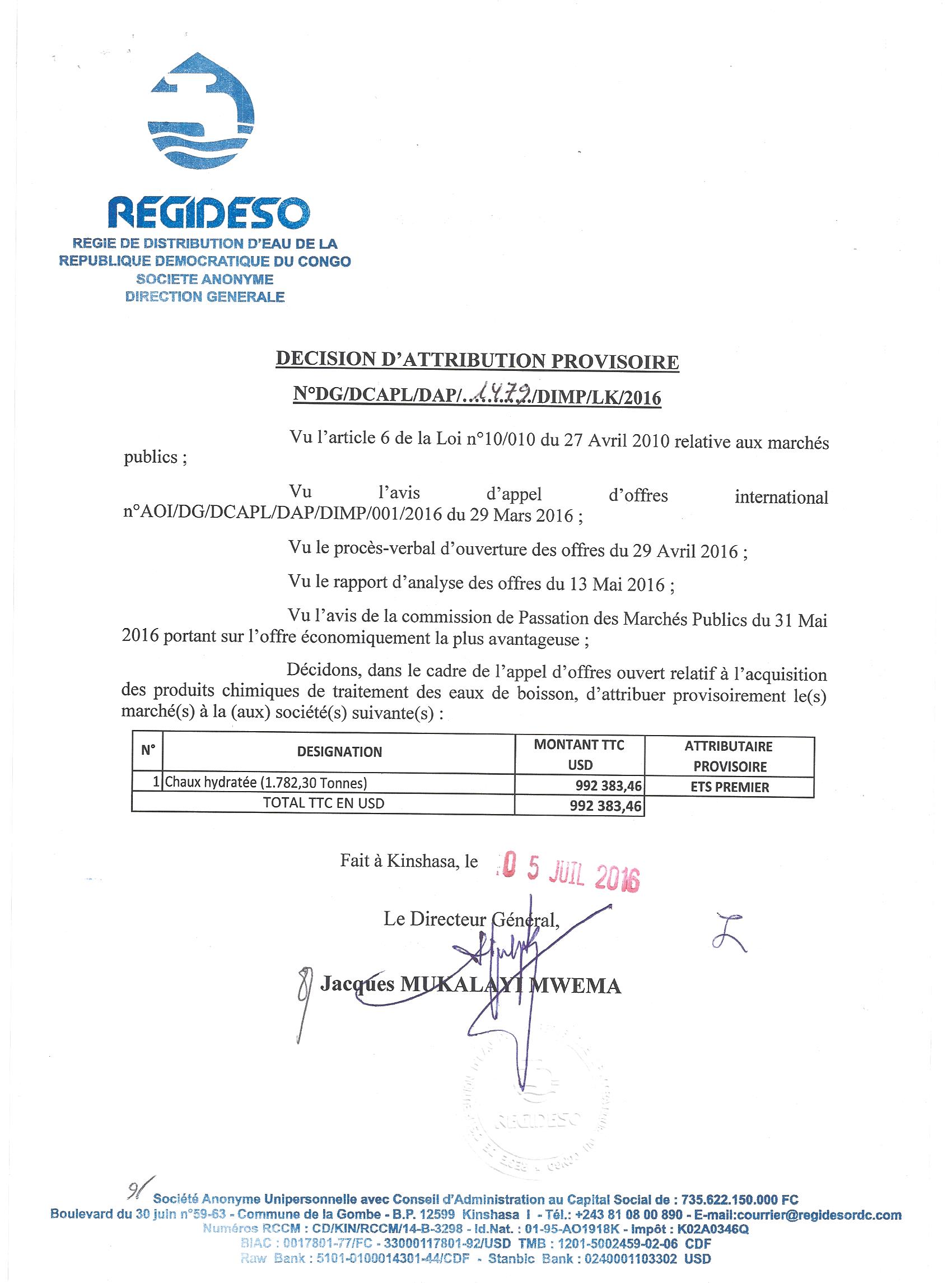Attribution provisoire de marché relatif à l’acquisition des produits chimiques de traitement des eaux de boisson à LA SOCIÉTÉ ETS PREMIER.