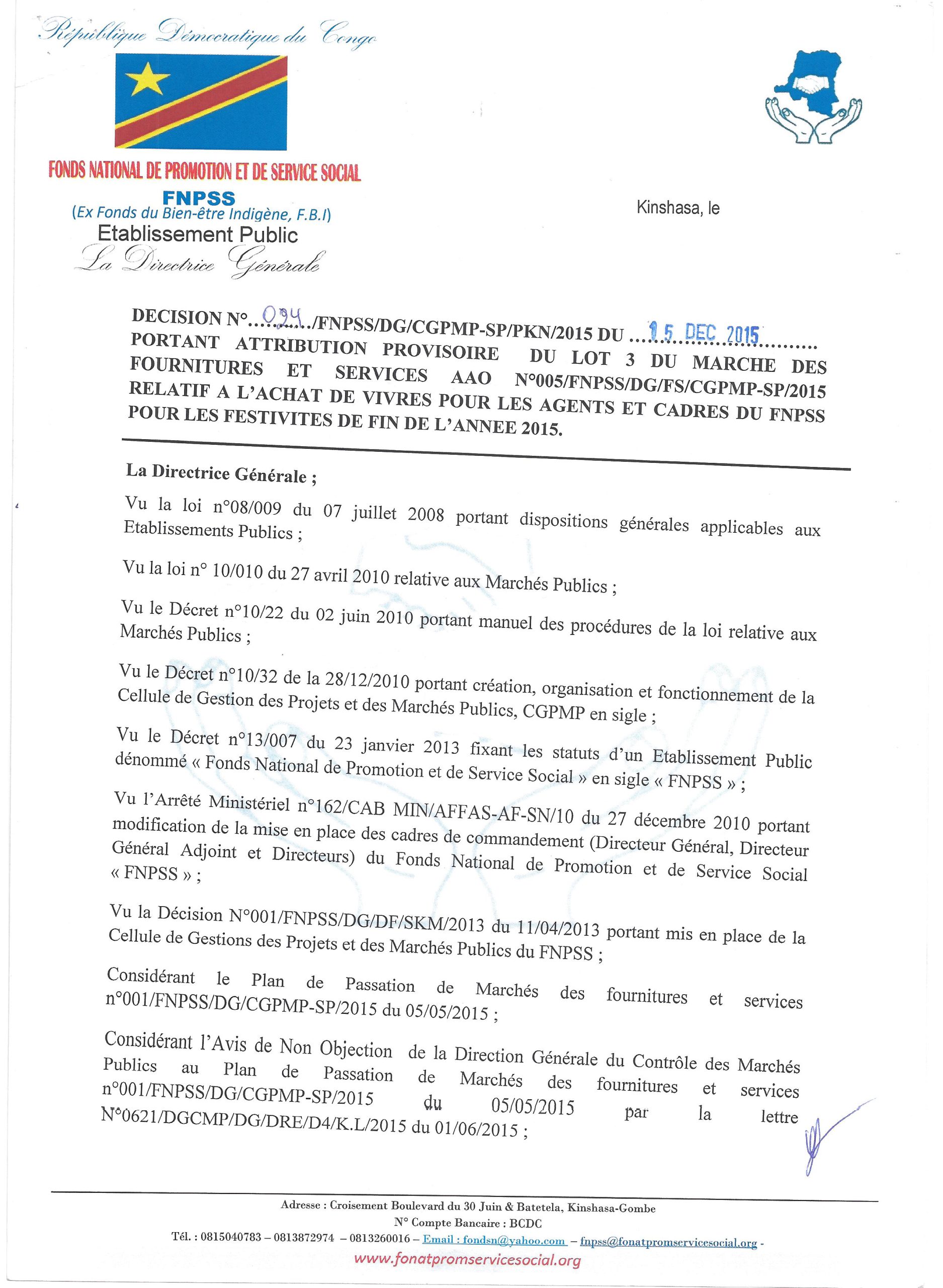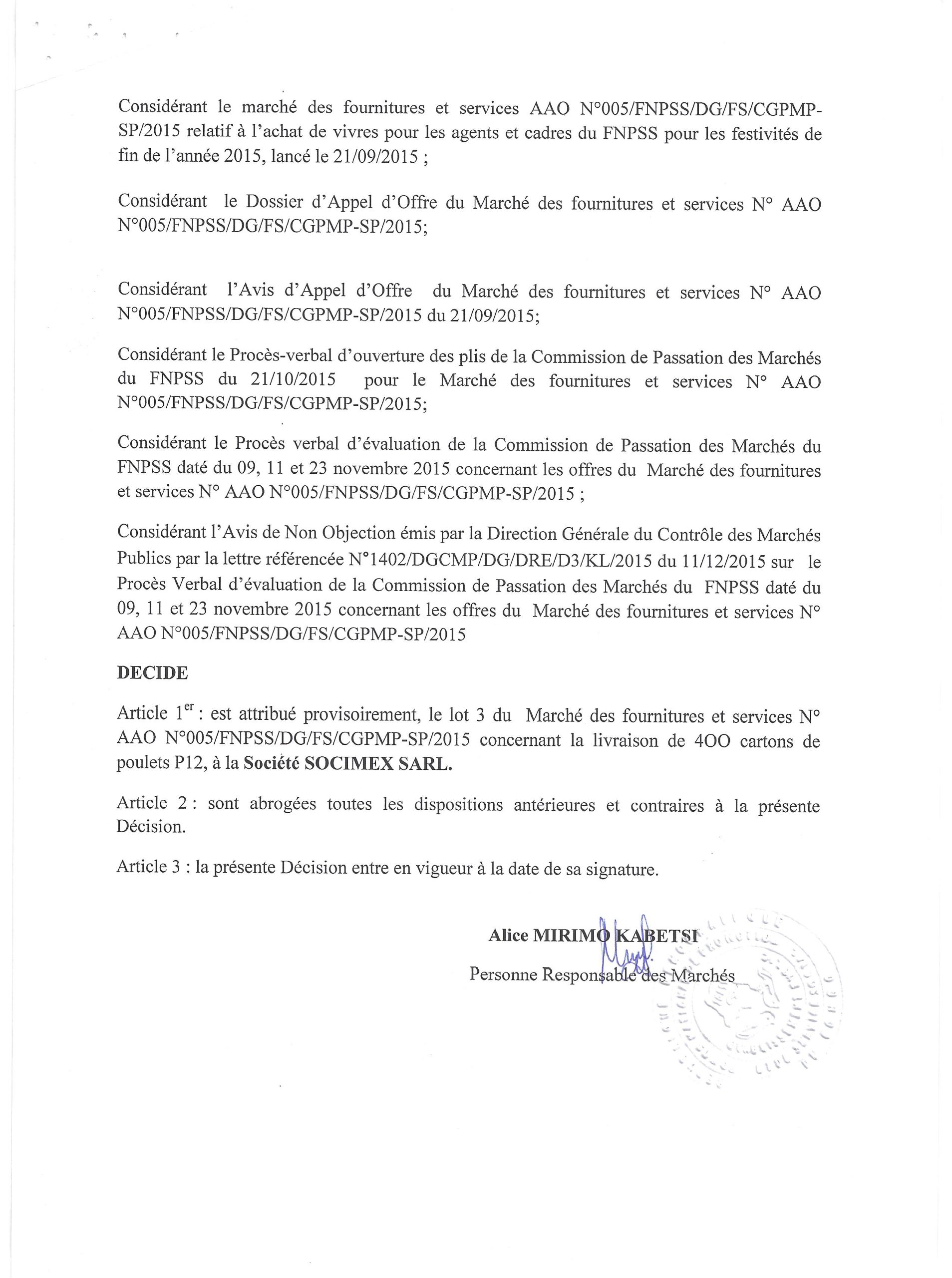 Attribution provisoire du lot 3 du marché des fournitures et services relatif à l’achat de vivres pour les agents et cadres du FNPSS pour les festivités de fin de l’année 2015 à la société SOCIMEX SARL.