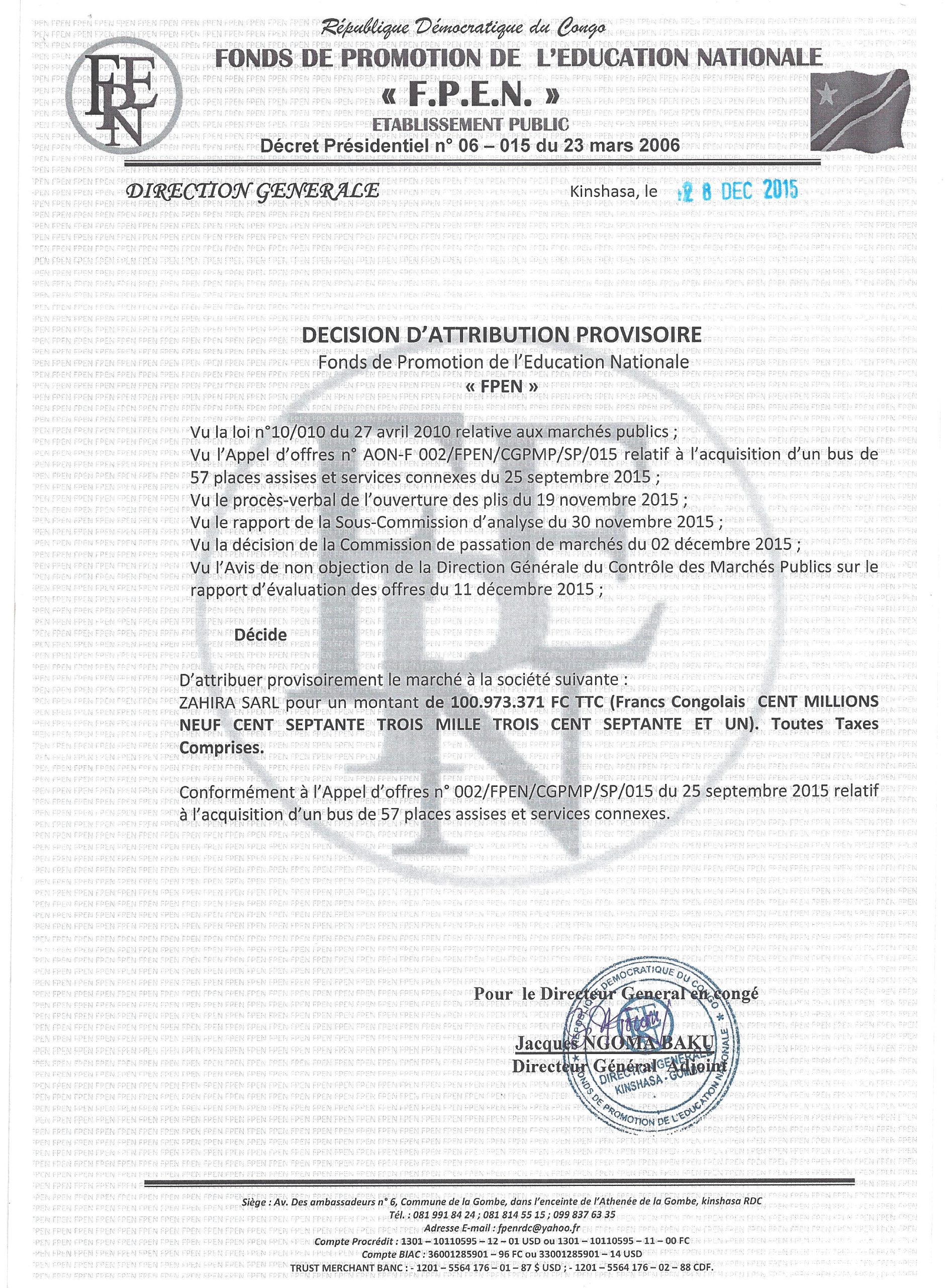 Attribution provisoire du marché relatif à l’acquisition d’un bus de 57 places assises et services connexes du 25 septembre 2015 à LA SOCIÉTÉ ZAHIRA SARL.