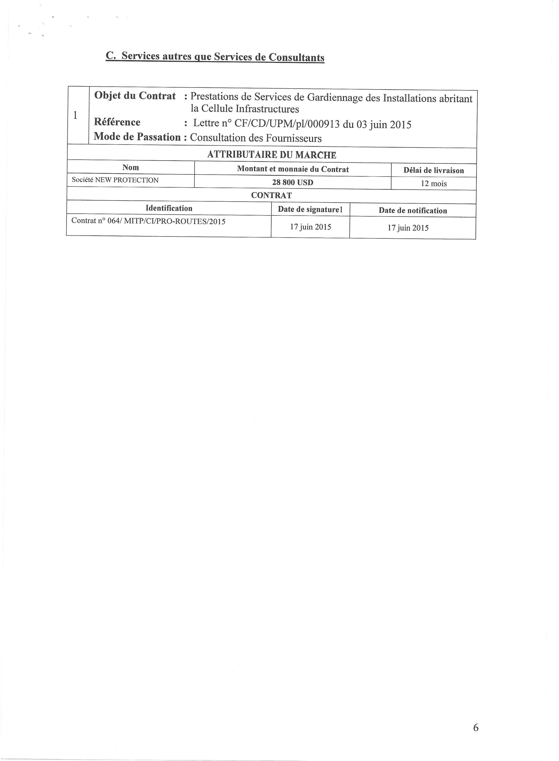 Attribution provisoire à la société expertise services du marché susmentionné de la maintenance préventive et ponctuelle des matériels informatiques du bureau central de coordination