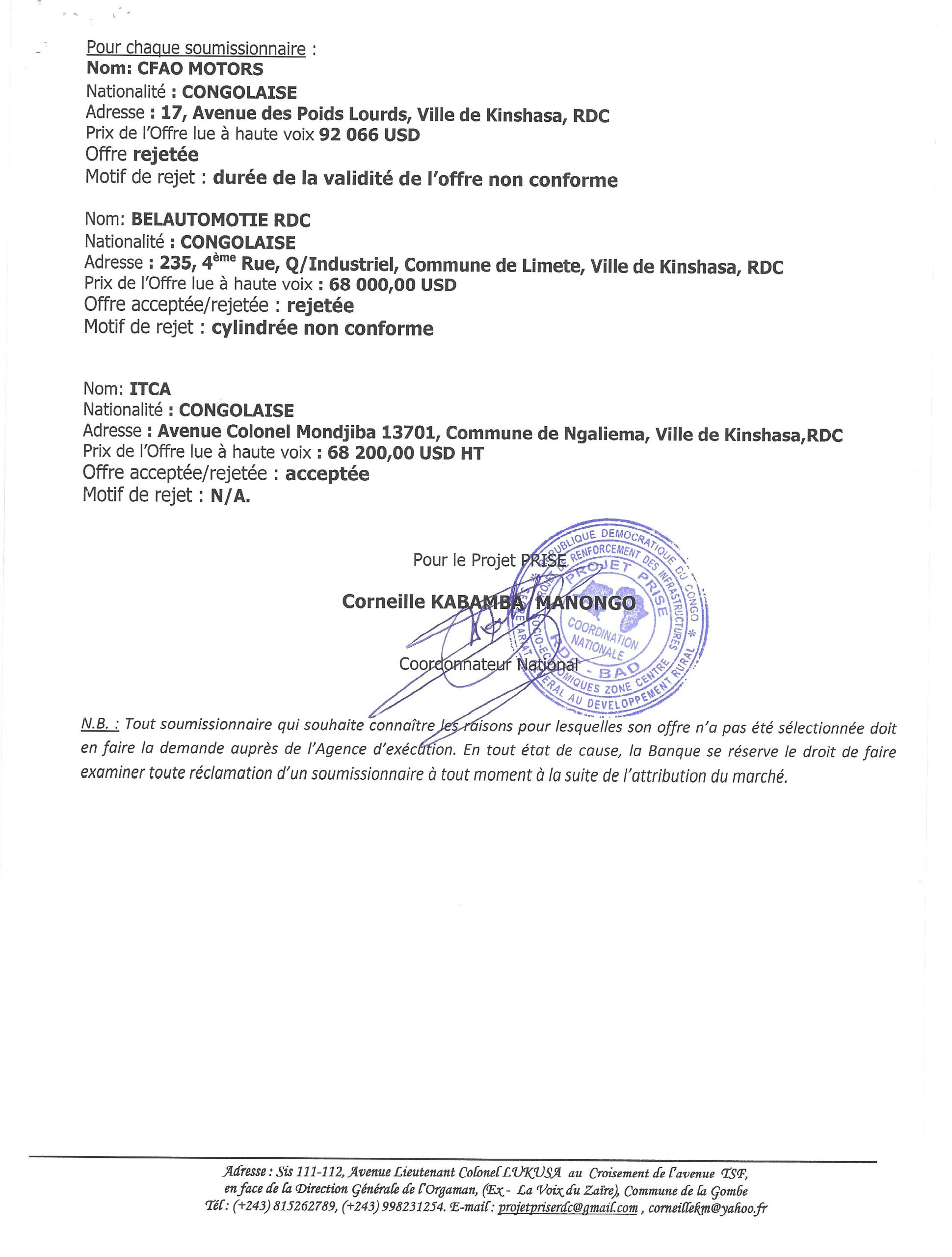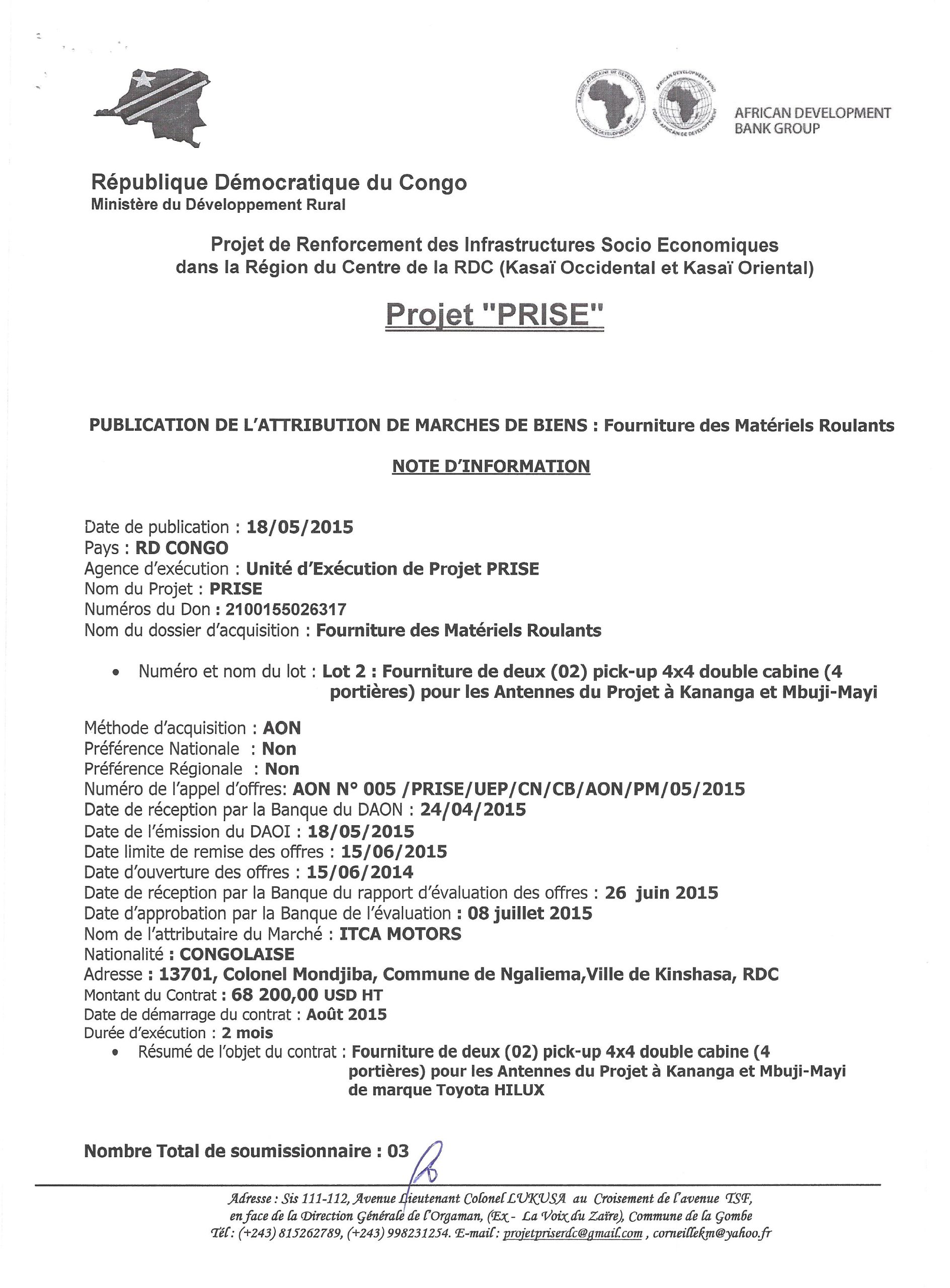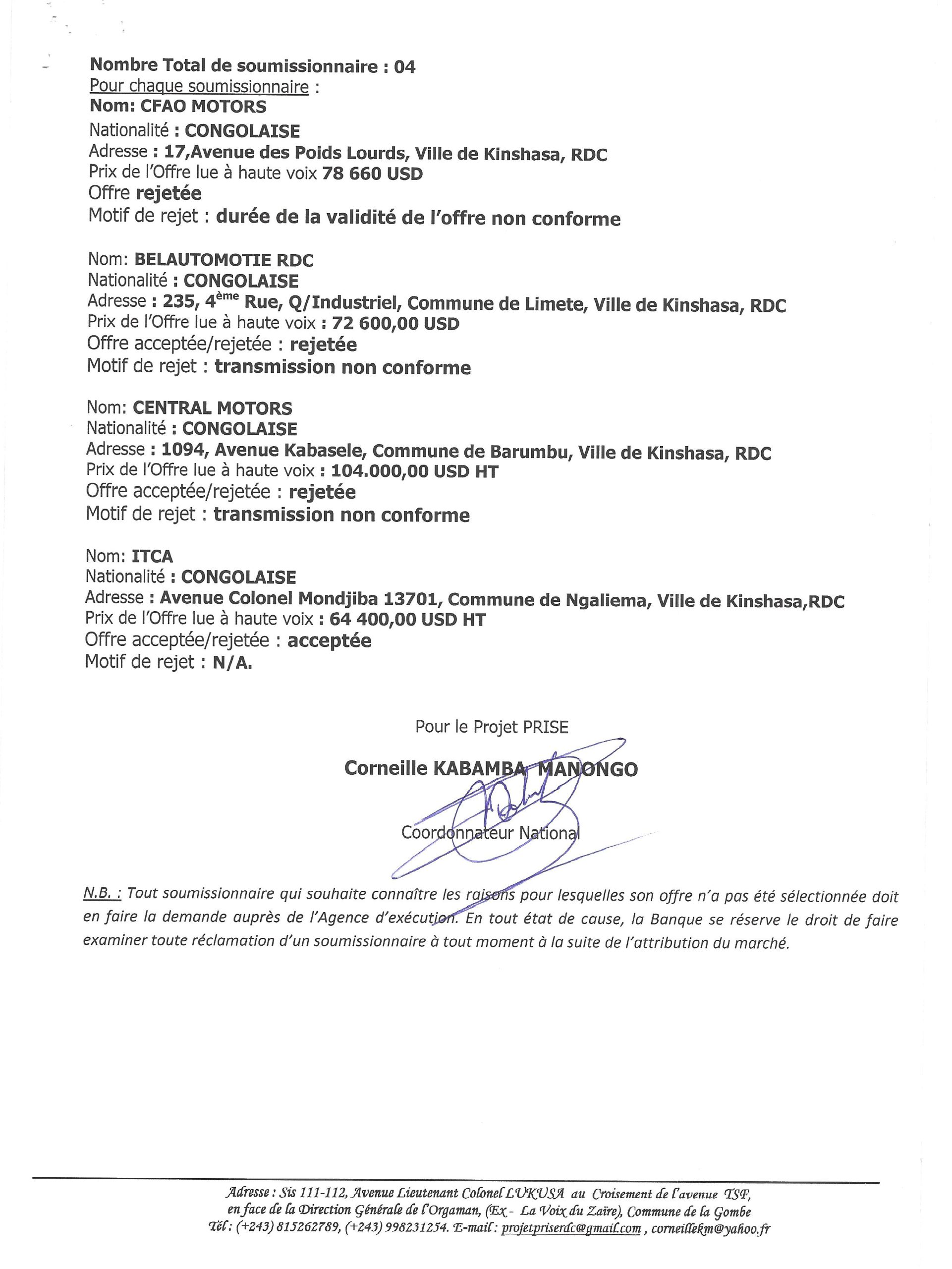 Attribution accordée à ITCA MOTORS relative au fourniture de deux (02) pick-up 4×4 double cabine (4 portières) pour les antennes du projet à Kananga et Mbuji-Mayi.