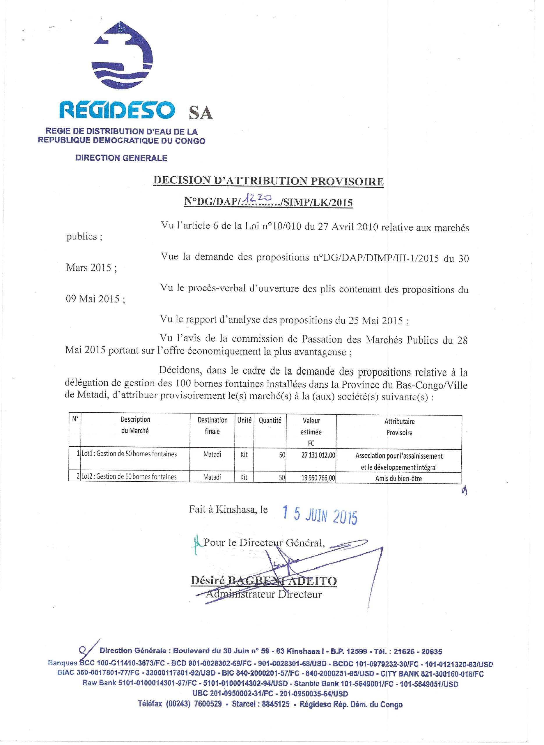 Attribution provisoire aux sociétés : association pour l’assainissement et le développement intégral et amis du bien-être du marché relatif à la délégation de gestion des 100 bornes fontaines installées dans la province du Bas-Congo/ville de Matadi