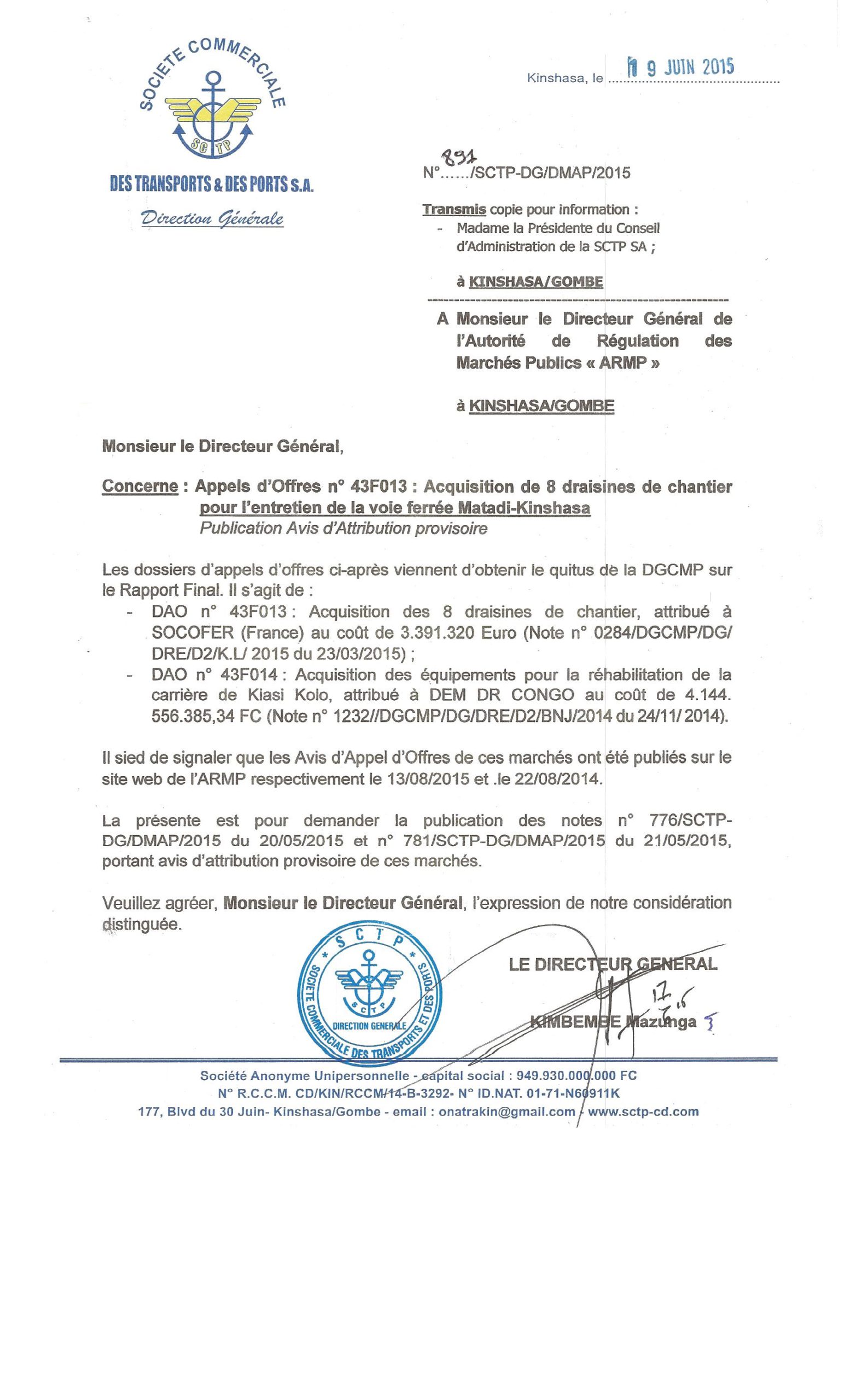 Attribution provisoire accordée aux sociétés suivantes : SOCOFER France et DEM Rd Congo de l’acquisition de 8 draisines de chantier pour l’entretien de la voie ferré MATADI-KINSHASA.