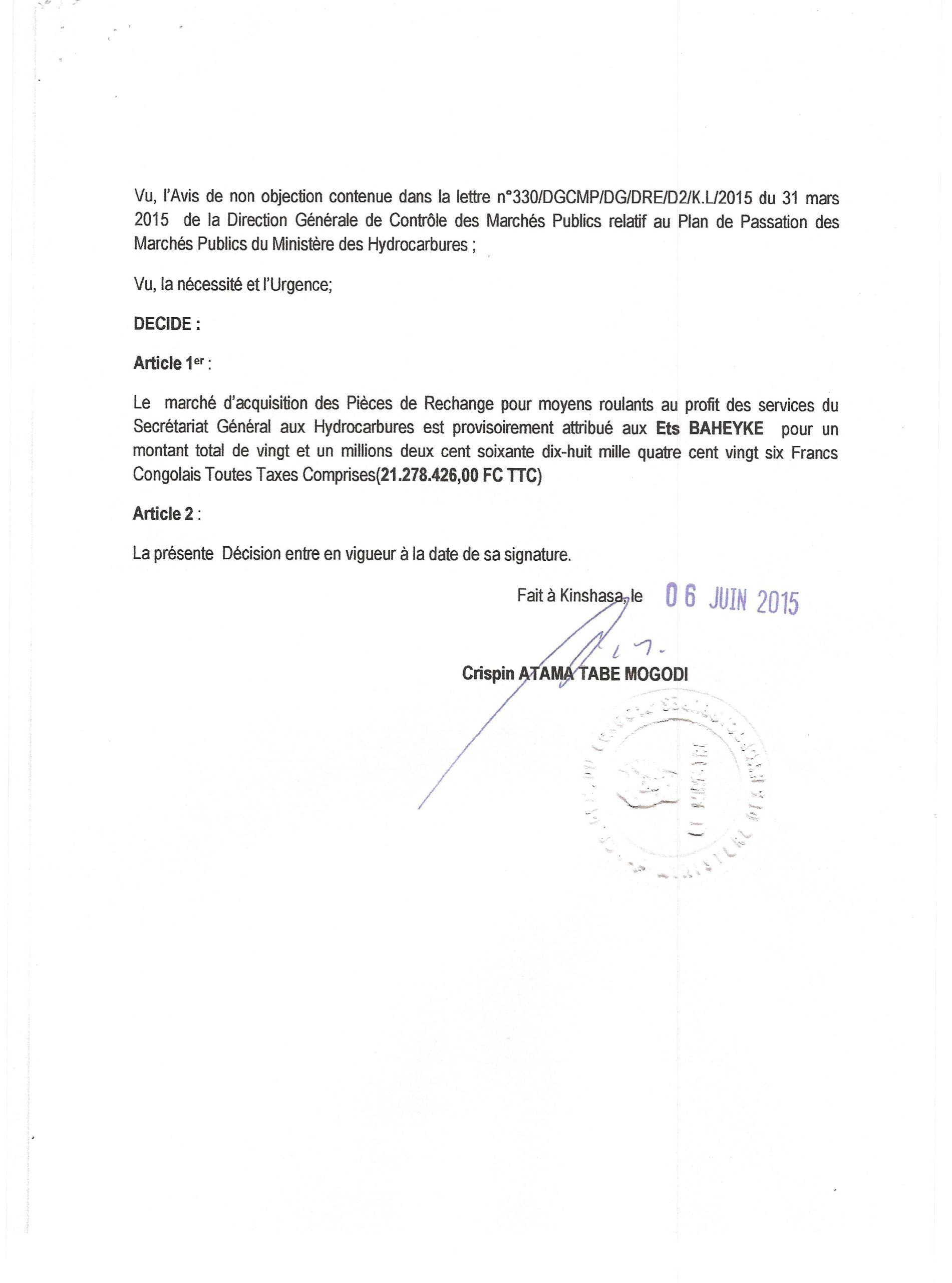Attribution provisoire accordée aux établissements BAHEYKE du marché relatif à l’acquisition des pièces de rechange pour moyens roulants au profit des services du secrétariat général aux HYDROCARBURES.