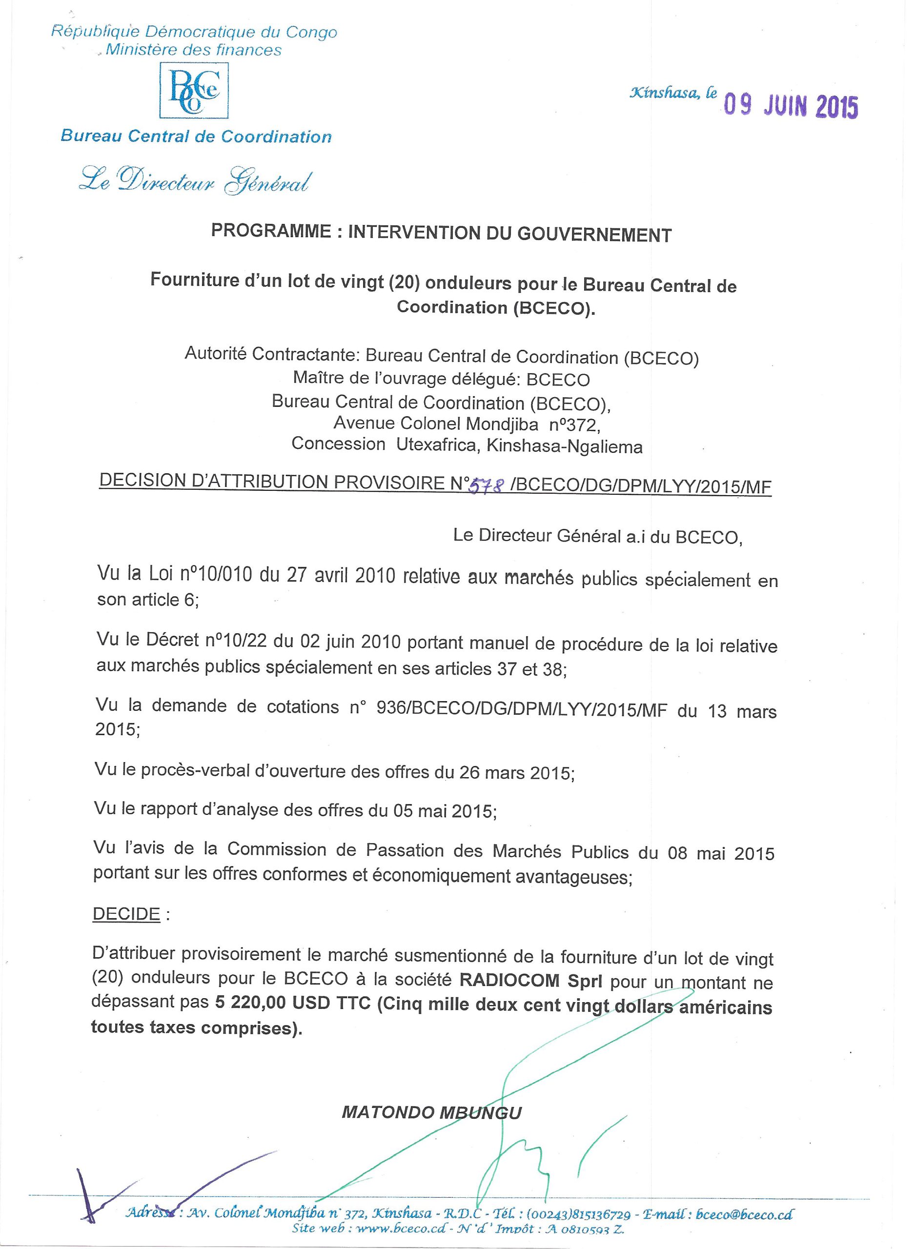 Attribution provisoire accordée à la société RADIOCOM Sarl du marché susmentionné de la fourniture d’un lot de vingt onduleurs pour le BCECO.
