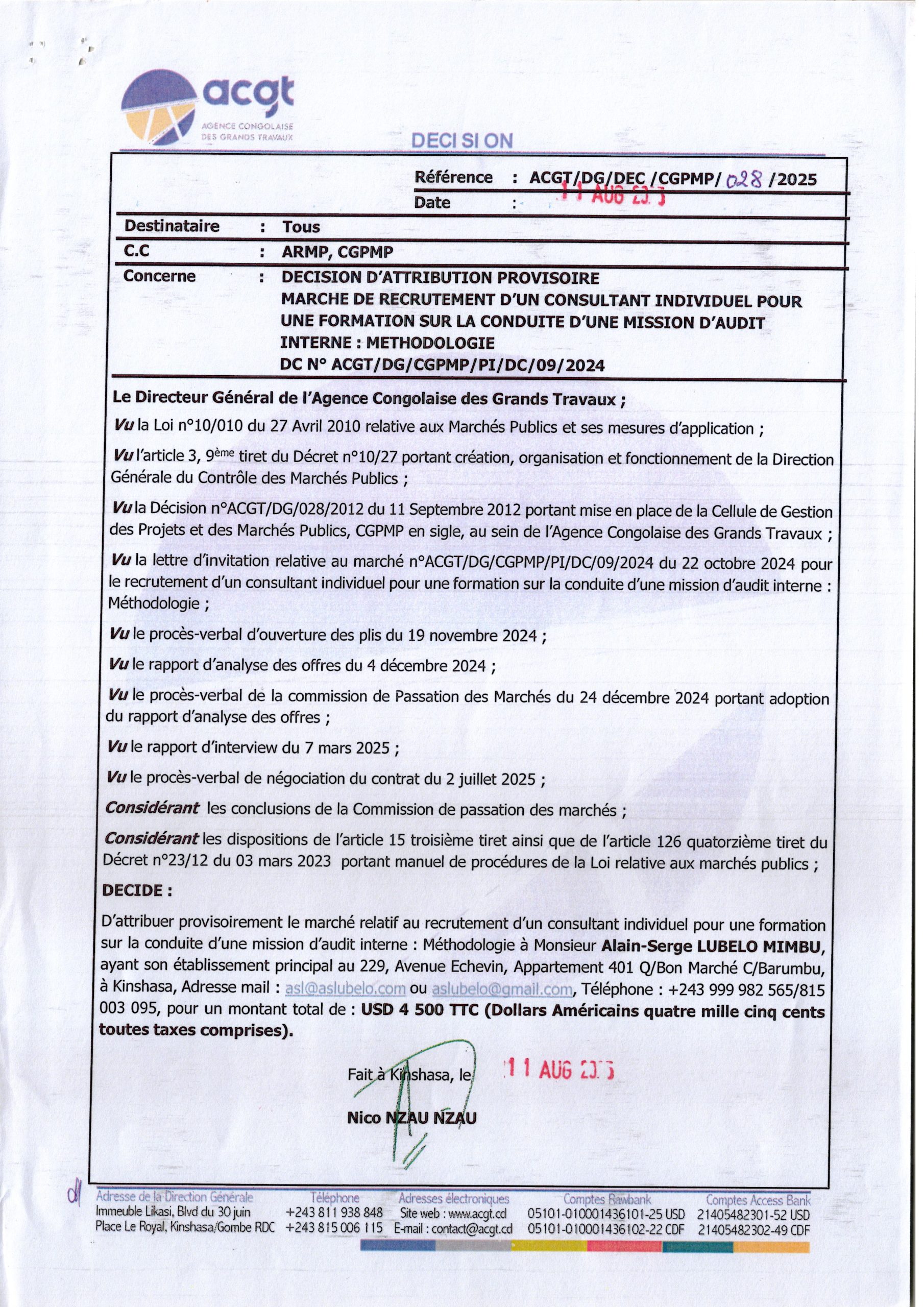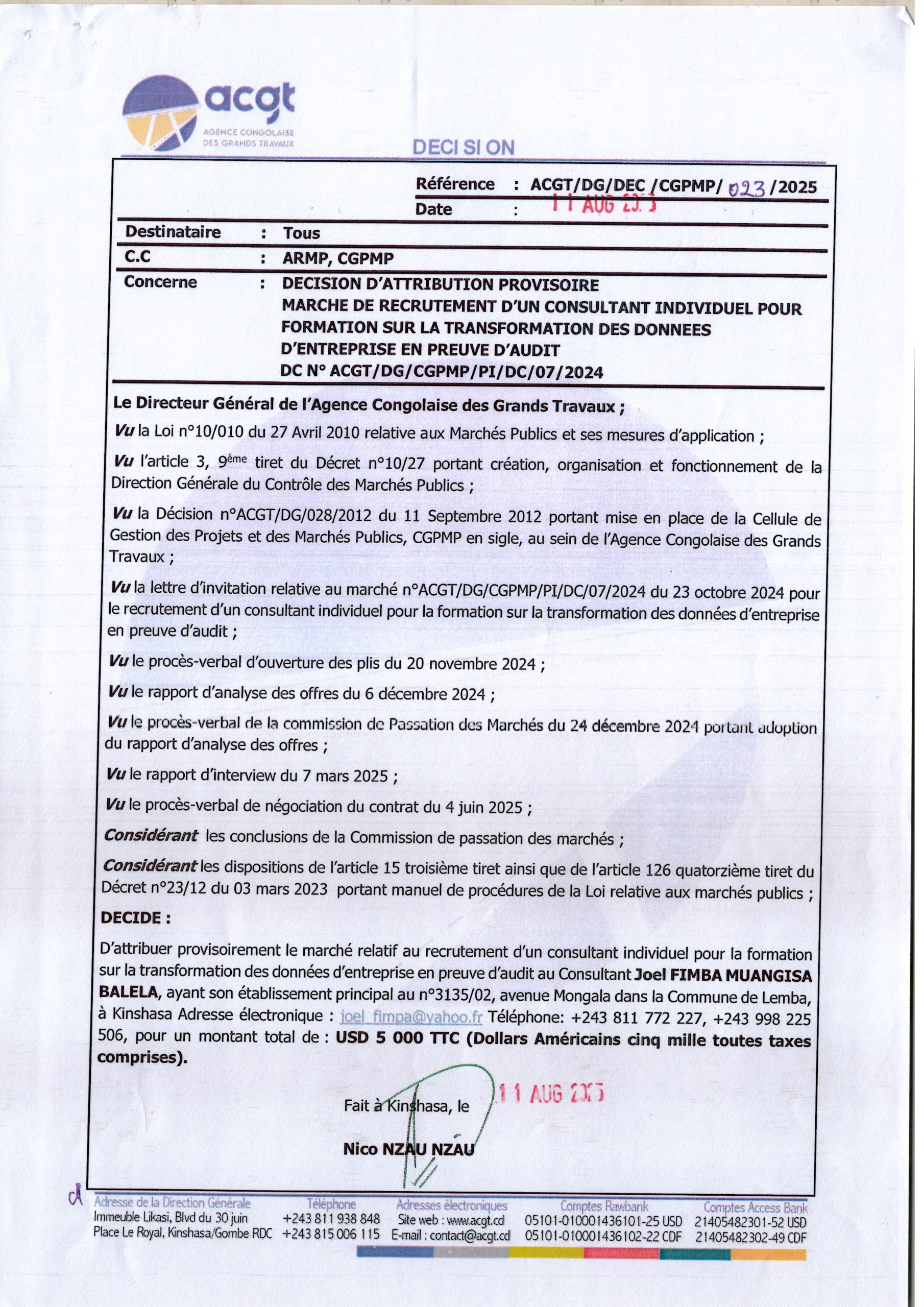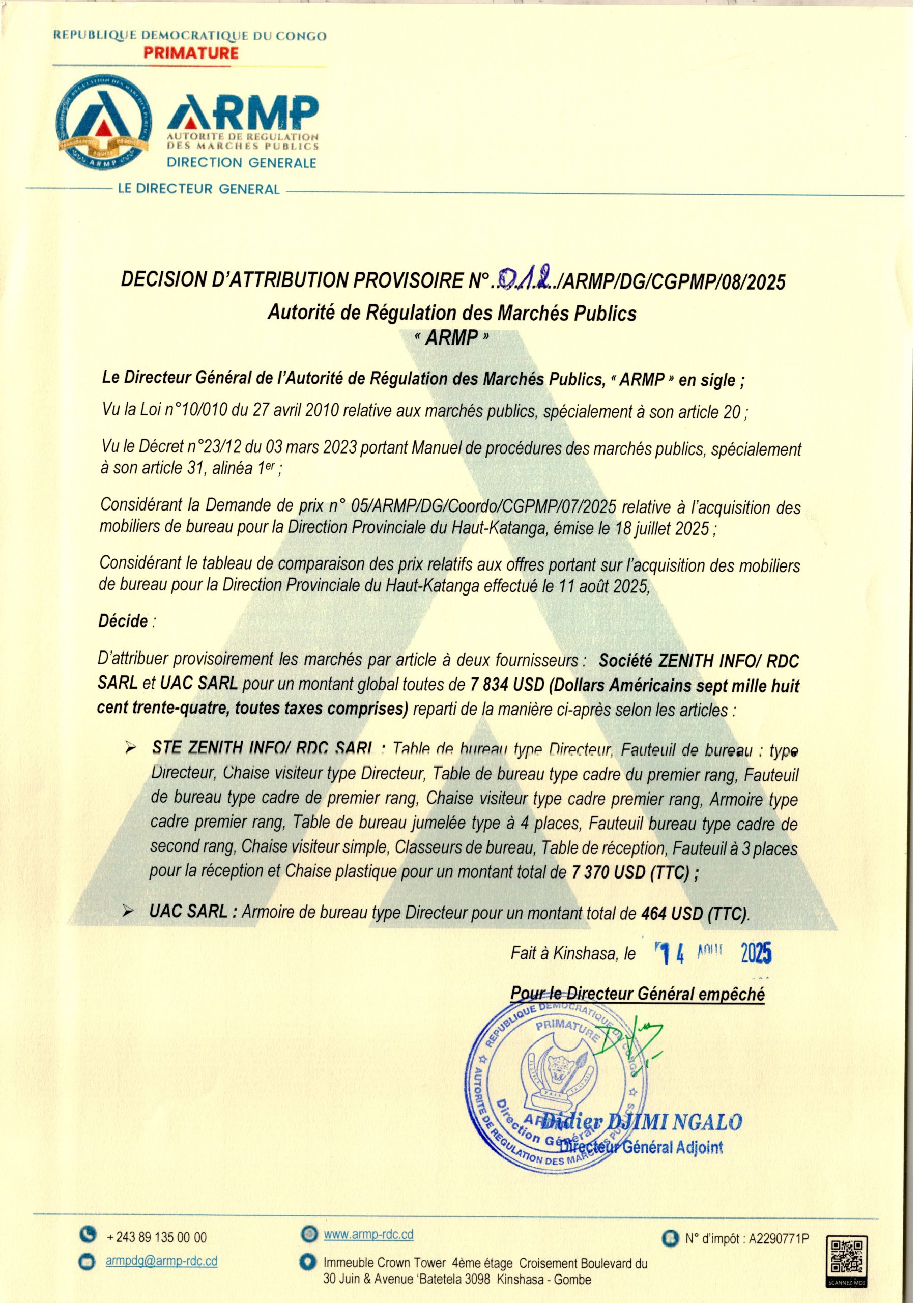 Attribution définitive accordée à la société “SOKIN SARL” le marché relatif à l’acquisition des vivres de fin d’année 2024 en faveur des agents et cadres du Secrétariat Général aux Finances, des membres du Cabinet du Ministère des Finances et des Services connexes (Complément).