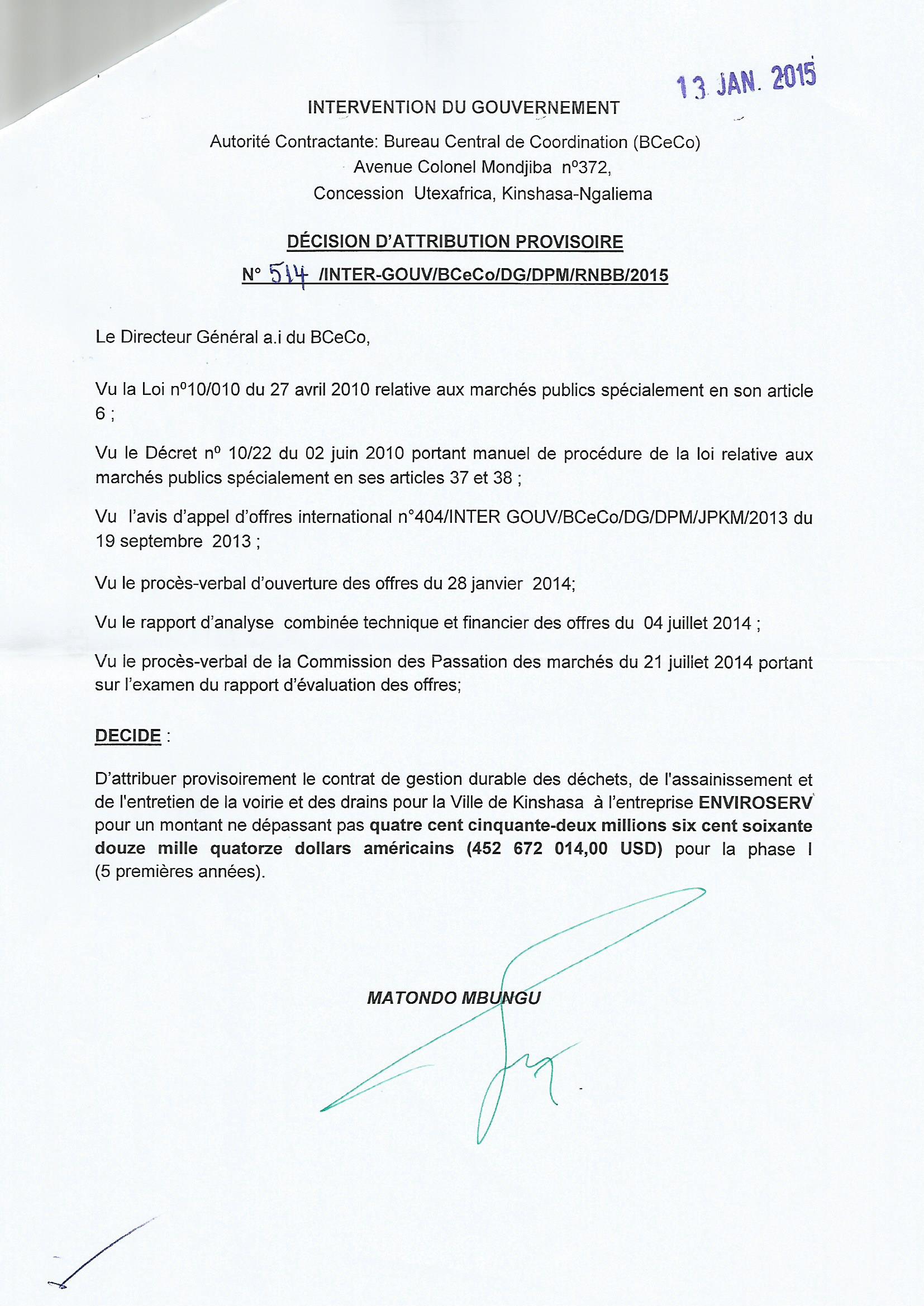 Attribution provisoire à l’entreprise enviroserv du contrat de gestion durable des déchets, de l’assainissement et de l’entretien de la voirie et de drains de la ville de Kinshasa