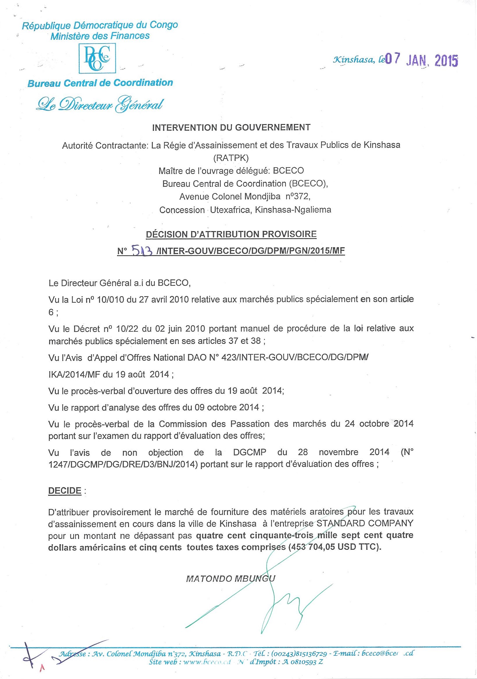ATTRIBUTION PROVISOIRE À L’ENTREPRISE STANDADR COMPANY DU MARCHÉ DE FOURNITURE DES MATÉRIELS ARATOIRES POUR LES TRAVAUX D’ASSAINISSEMENT EN COURS DANS LA VILLE DE KINSHASA.