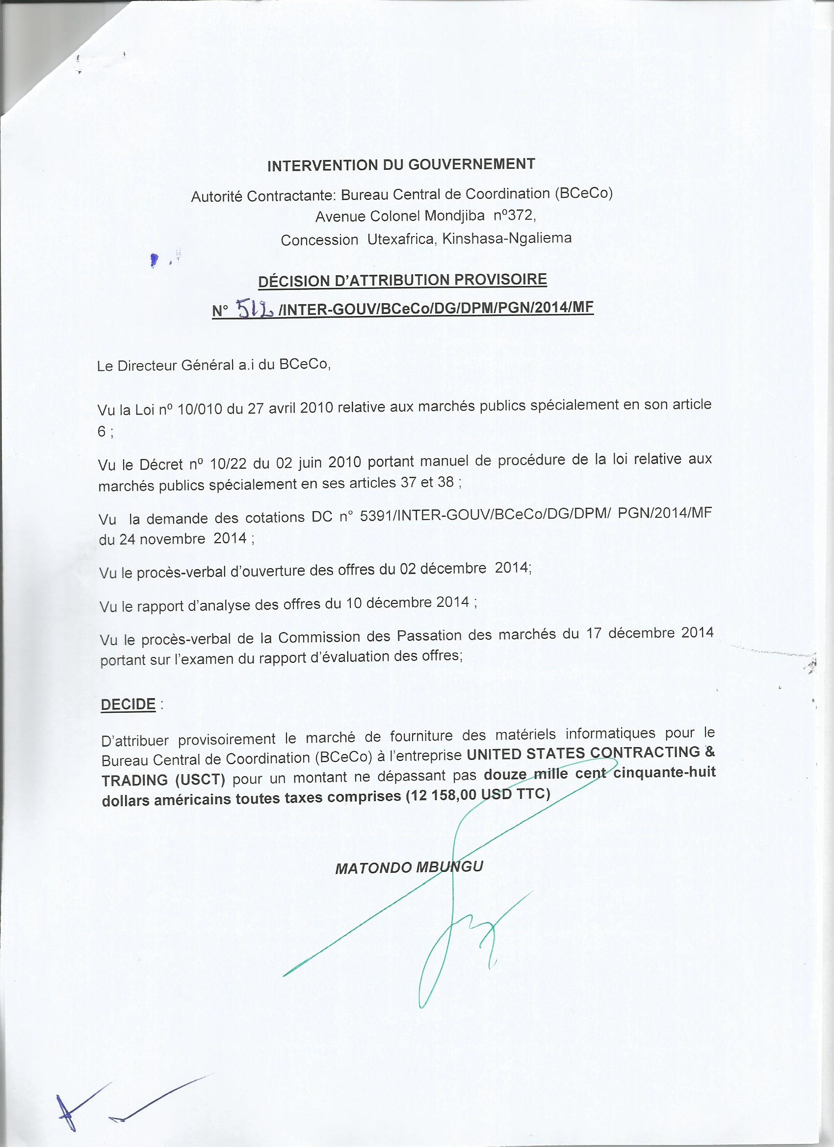 ATTRIBUTION PROVISOIRE DU MARCHÉ DE FOURNITURES DES MATÉRIELS INFORMATIQUES ACCORDEE À L’ENTREPRISE UNITED STATES CONTRACTING & TRADING