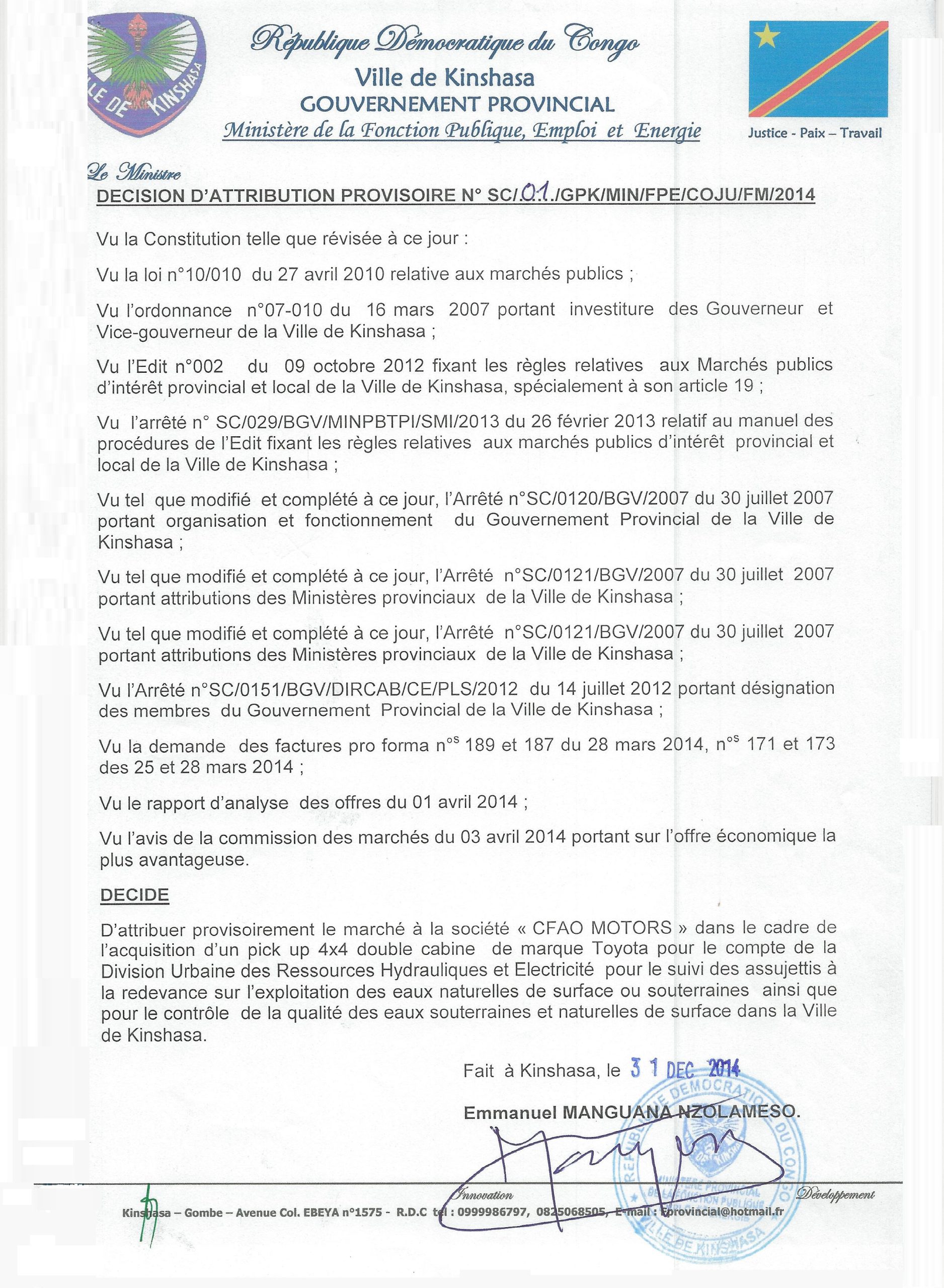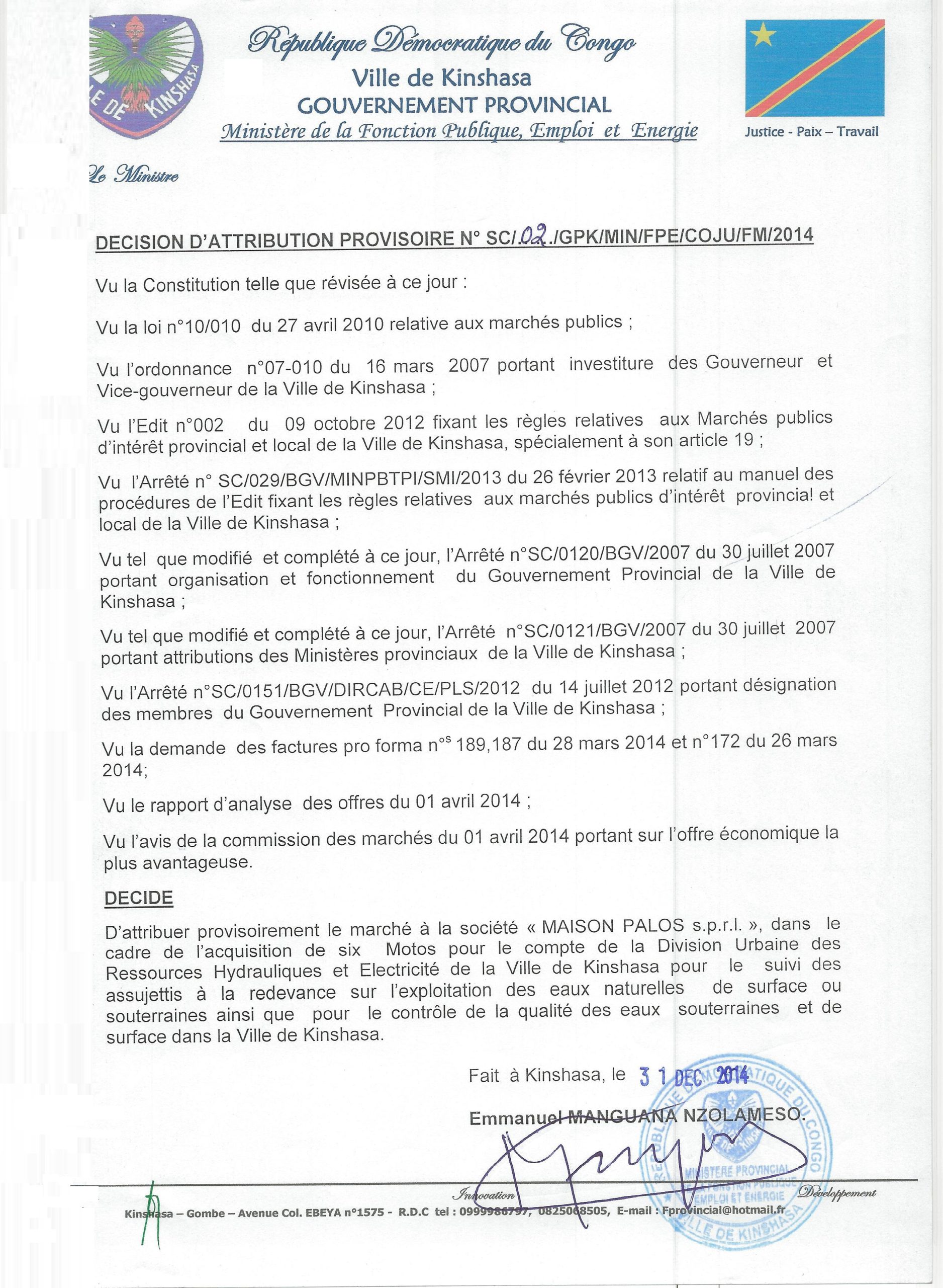 ATTRIBUTION PROVISOIRE À LA SOCIÉTÉ MAISON PALOS S.P.R.L D’ACQUISITION DE SIX MOTOS POUR LE COMPTE DE LA DIVISION URBAINE DES RESSOURCES HYDRAULIQUES ET ELECTRICITÉ DE LA VILLE DE KINSHASA POUR LE SUIVI DES ASSUJETTIS À LA REDEVANCE…