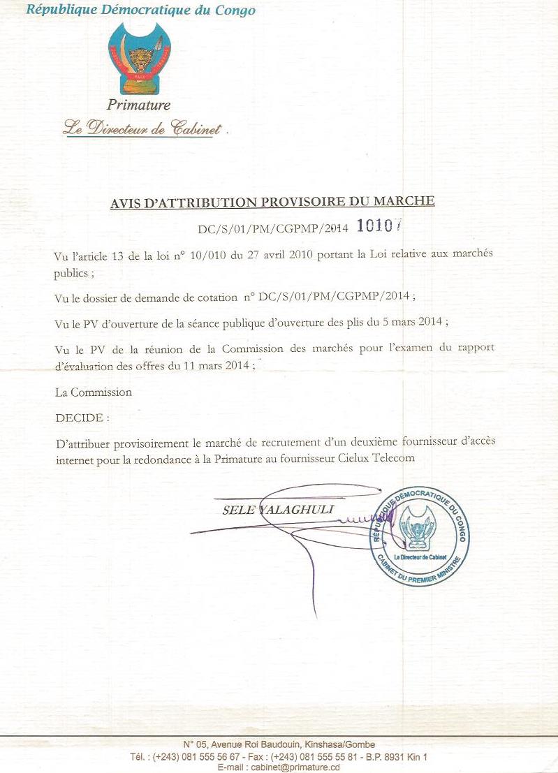 Attribution Provisoire du marché de recrutement d’un deuxième fournisseur d’accès internet pour la redondance à la Primature au fournisseur Cie lux Telecom