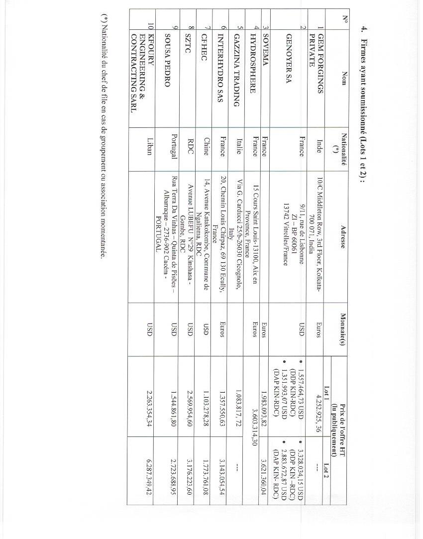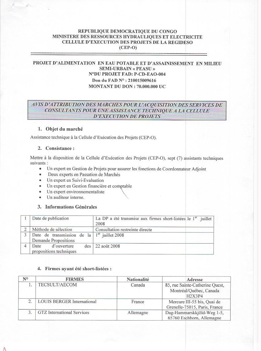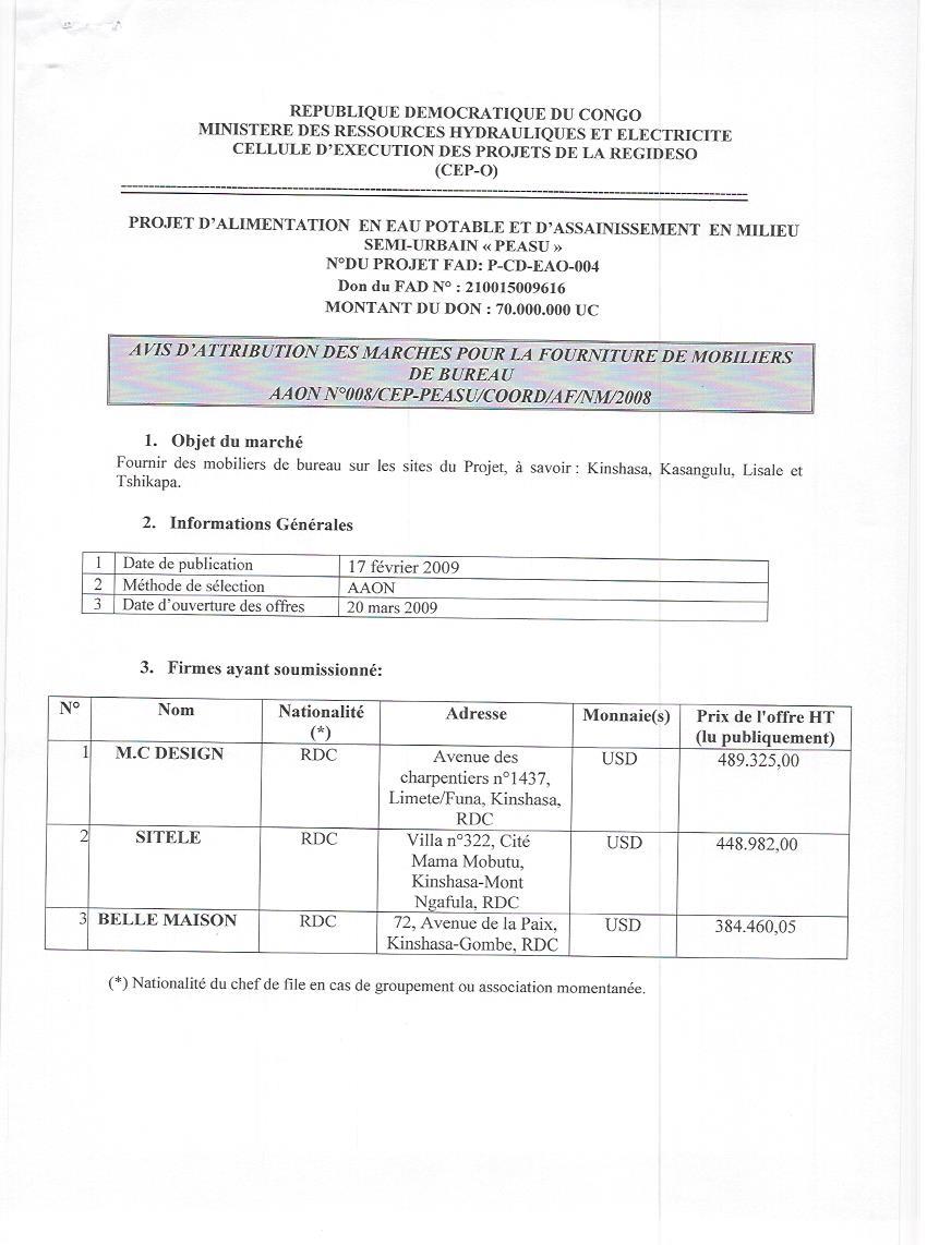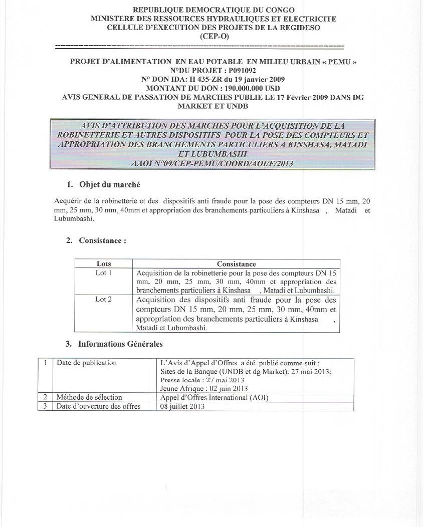 Attribution des Marchés pour l’Acquisition de la Robinetterie et autre dispositifs pour la pose des compteurs et Appropriation des Branchements Particuliers à KINSHASA, MATADI et LUBUMBASHI.