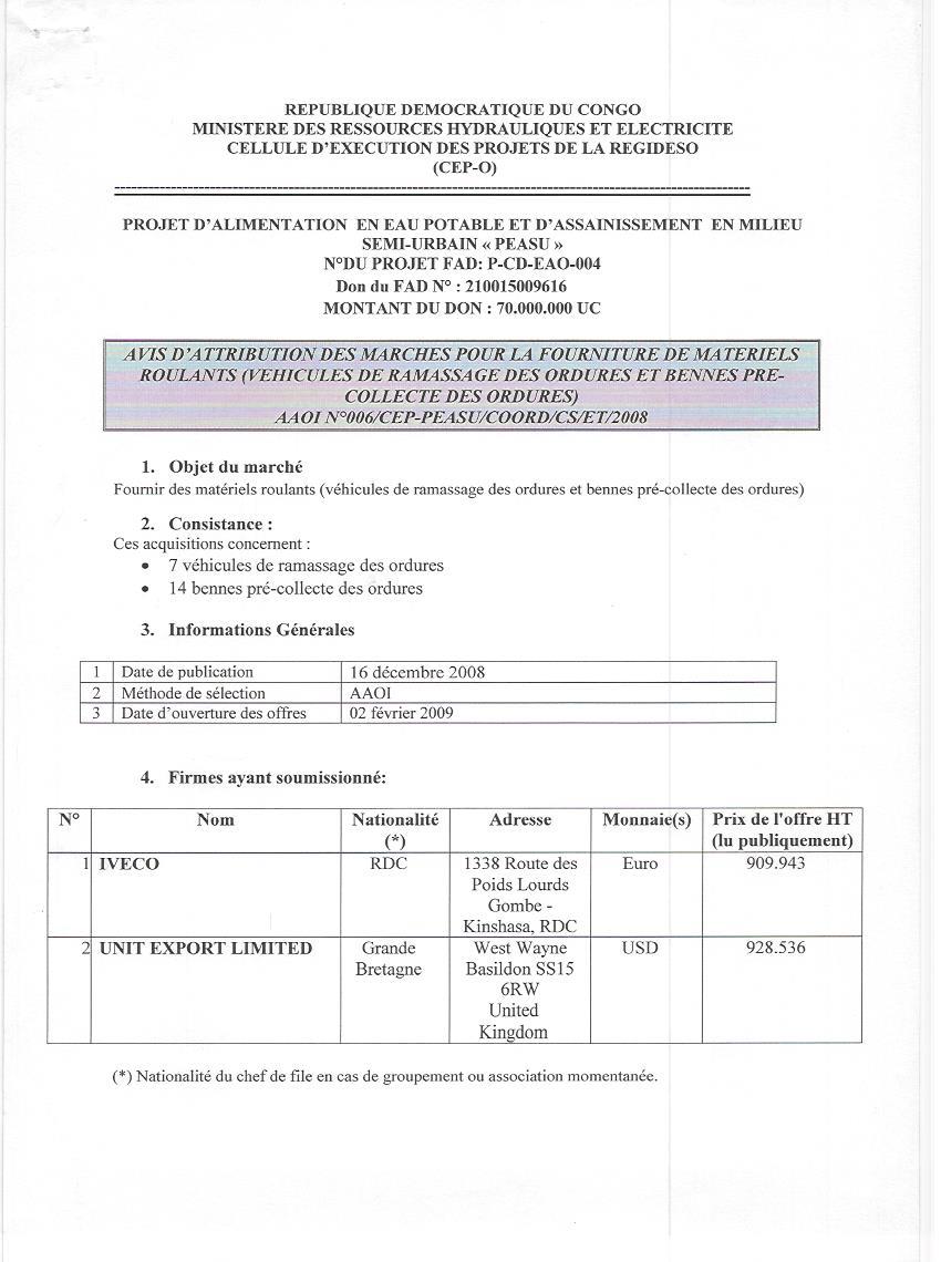 Attribution du marché pour l’Acquisition d’Outillage pour la pose des Compteurs et Appropriation des Branchements Particuliers à KINSHASA, MATADI et LUBUMBASHI.