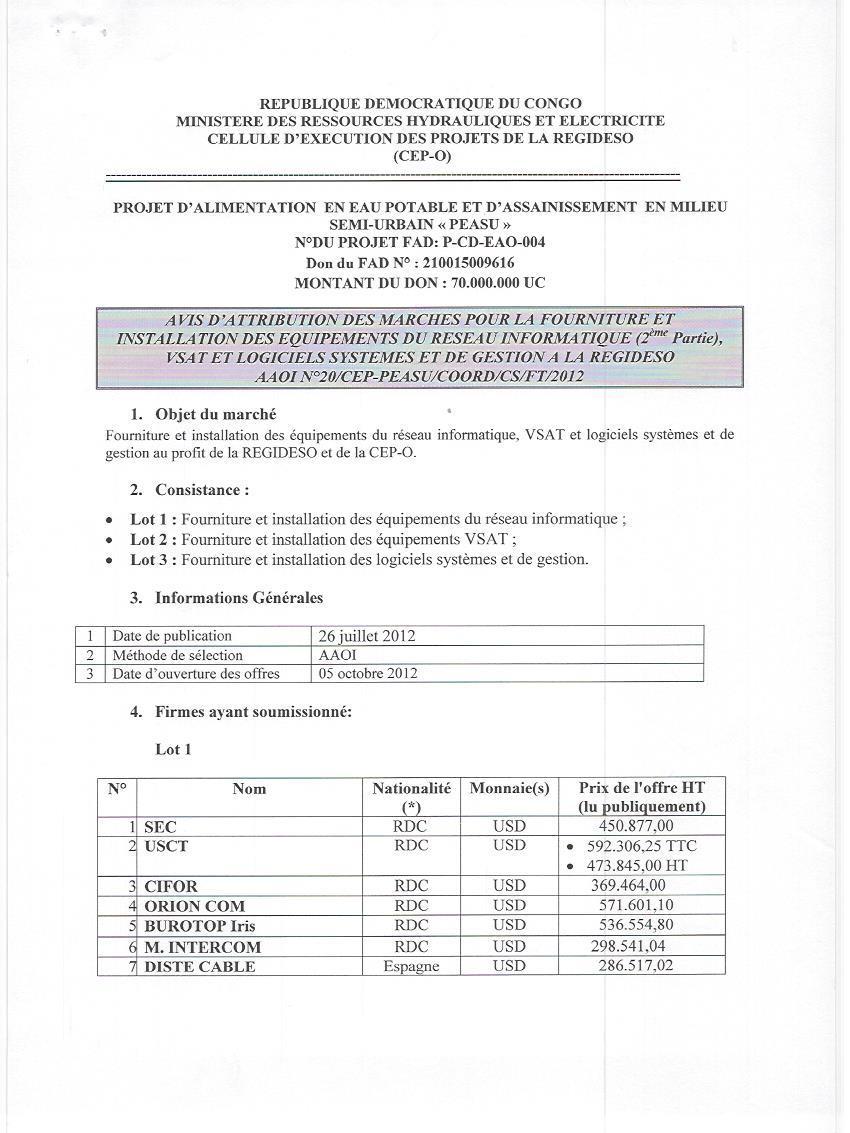 Attribution des Marchés pour la Fourniture et Installation des Equipements du Réseaux Informatique (2ème Partie), VSAT et Logiciels Systèmes et de Gestion à la REGIDESO