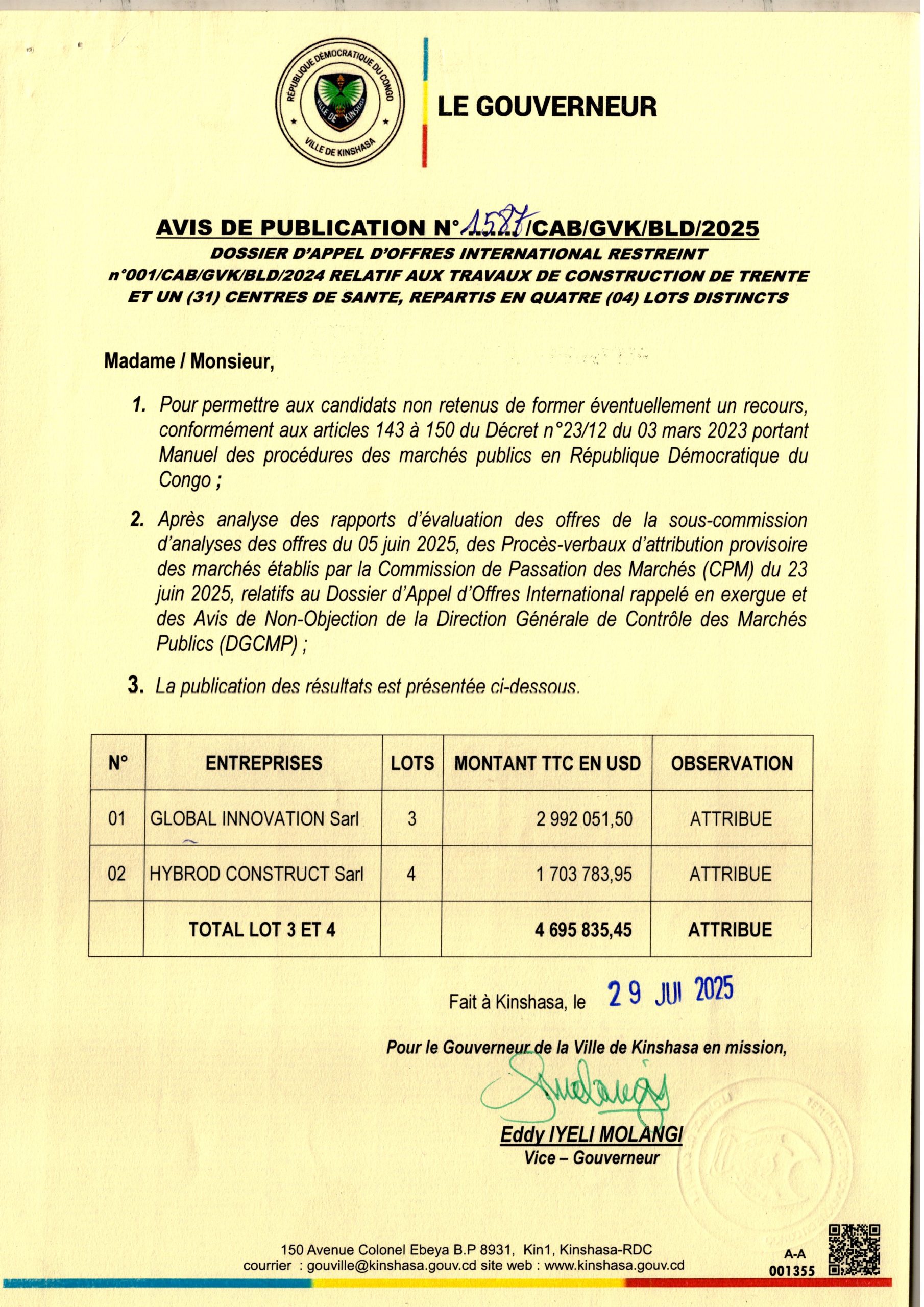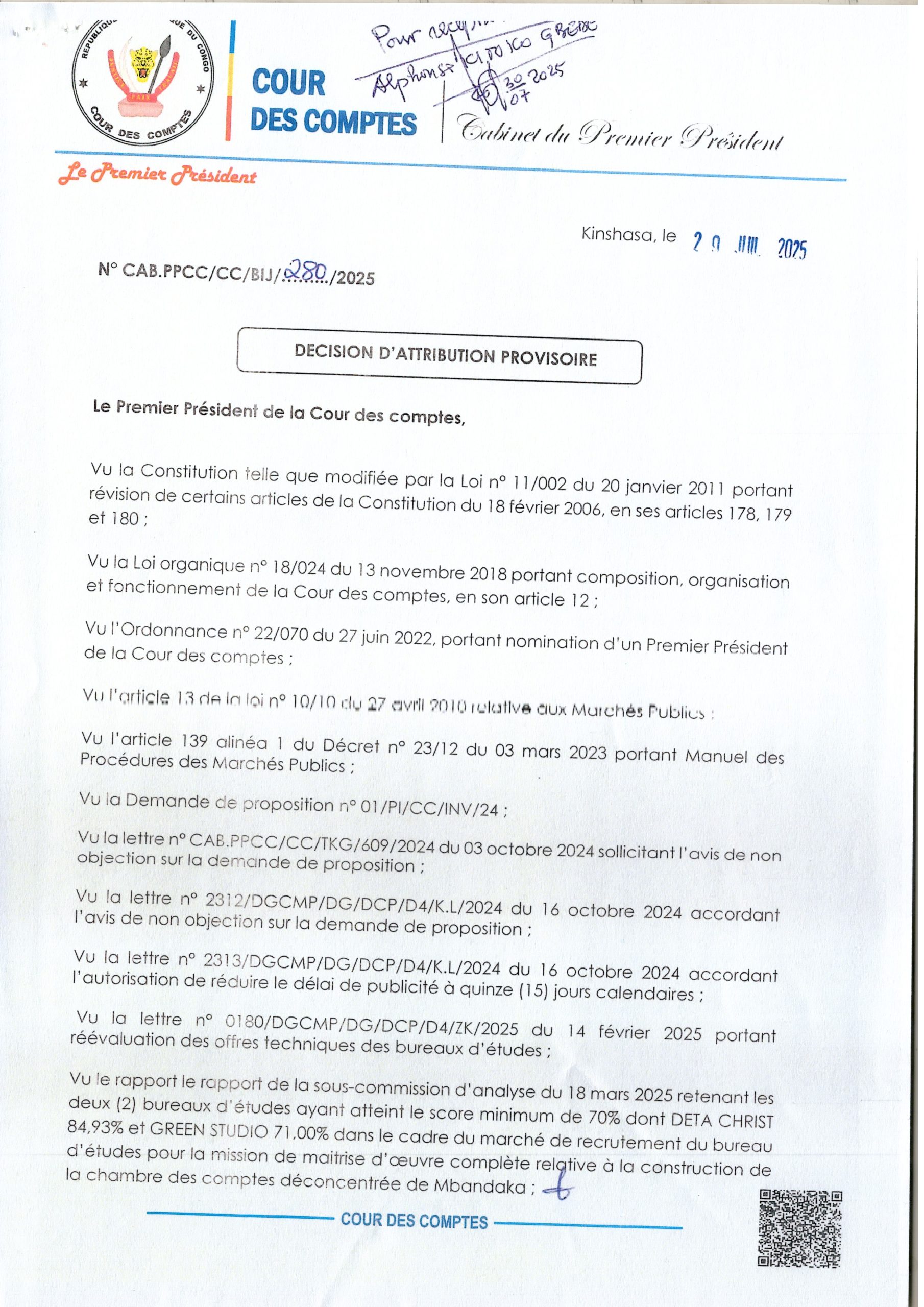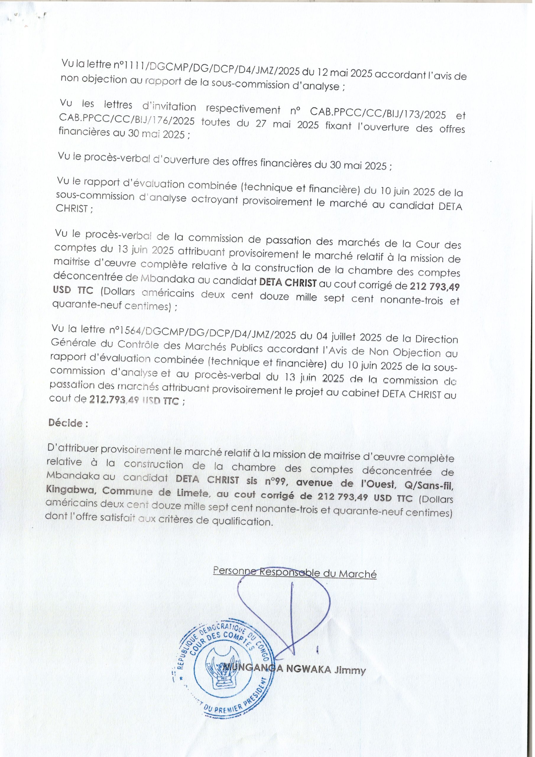 Attribution provisoire accordée à DETA CRIST relative à la construction de la chambre des comptes déconcentrée de Mbandaka