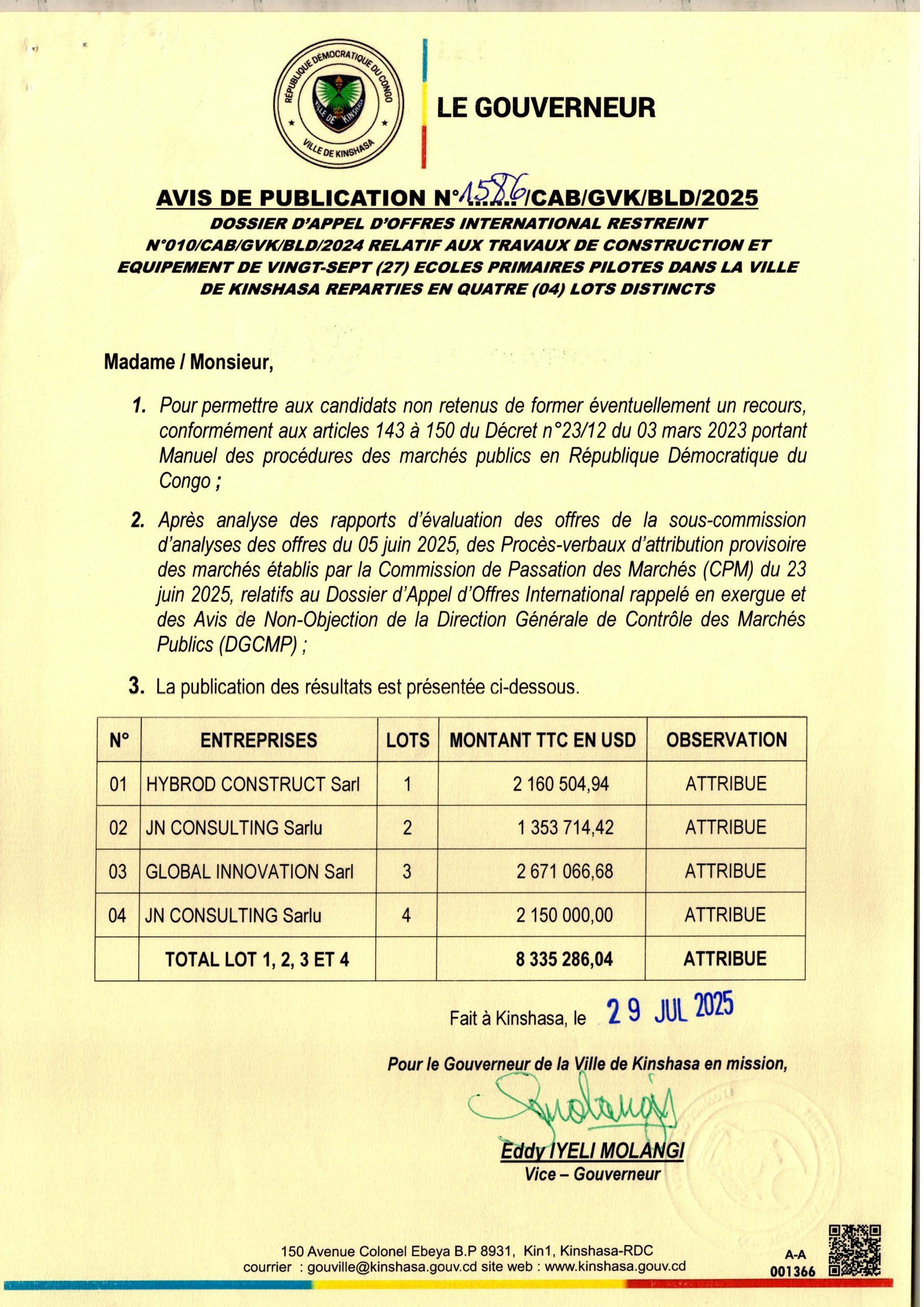 Liste restreinte relatif au marché de travaux de construction et équipement de vingt-sept (27) écoles primaires pilotes dans la Ville de Kinshasa en quatre (4) lots distincts.