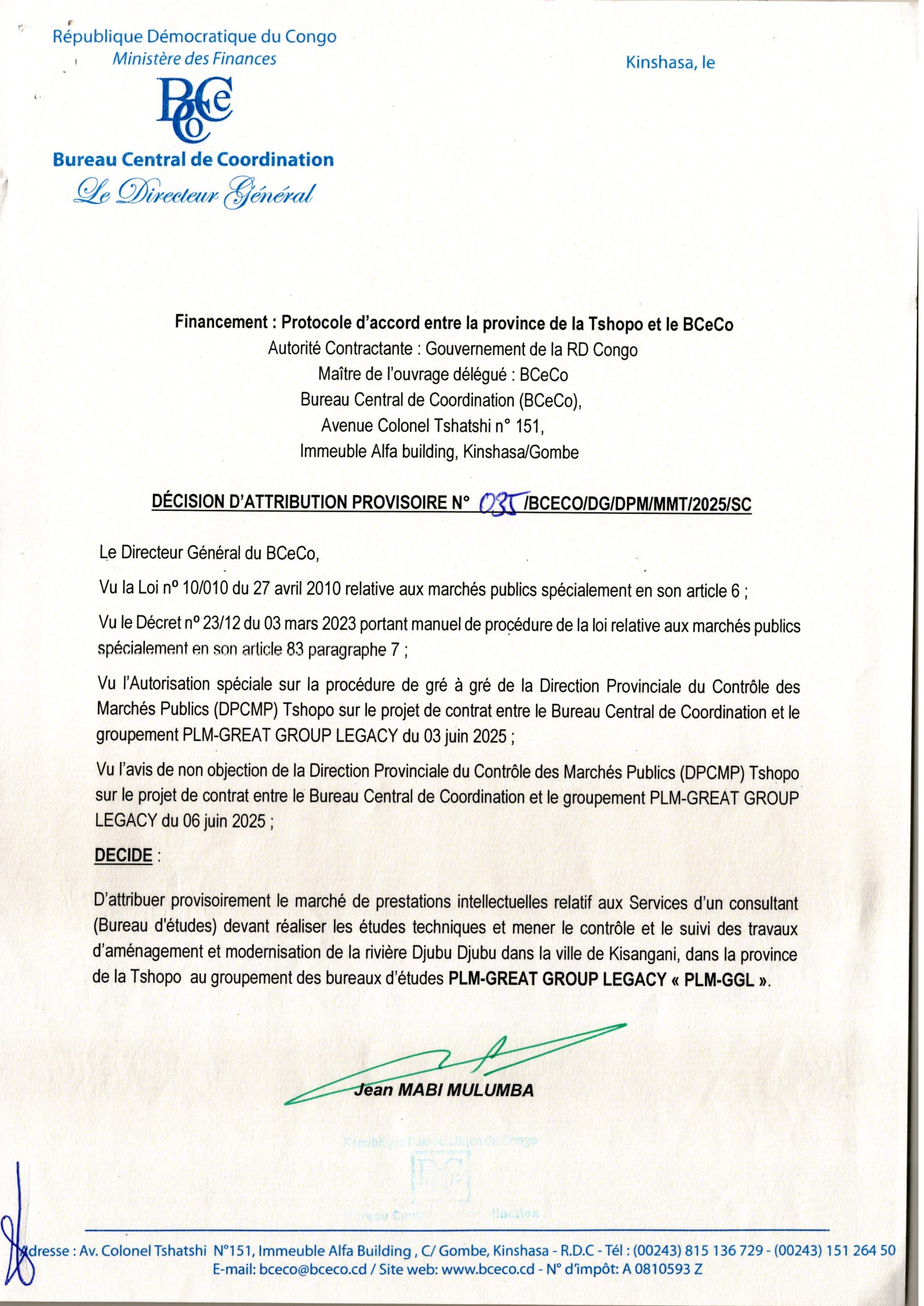 Attribution Provisoire du marché de prestation Intellectuelles relatif aux Services d’un Consultant devant réaliser les études techniques et mener le contrôle et suivi des travaux d’aménagement et modernisation de la rivière Djubu dans la ville de Kinshasa, dans la province de la Tshopo au groupement des bureaux d’études PLM-GRAET GROUP LEGACY « PLM-GGL »