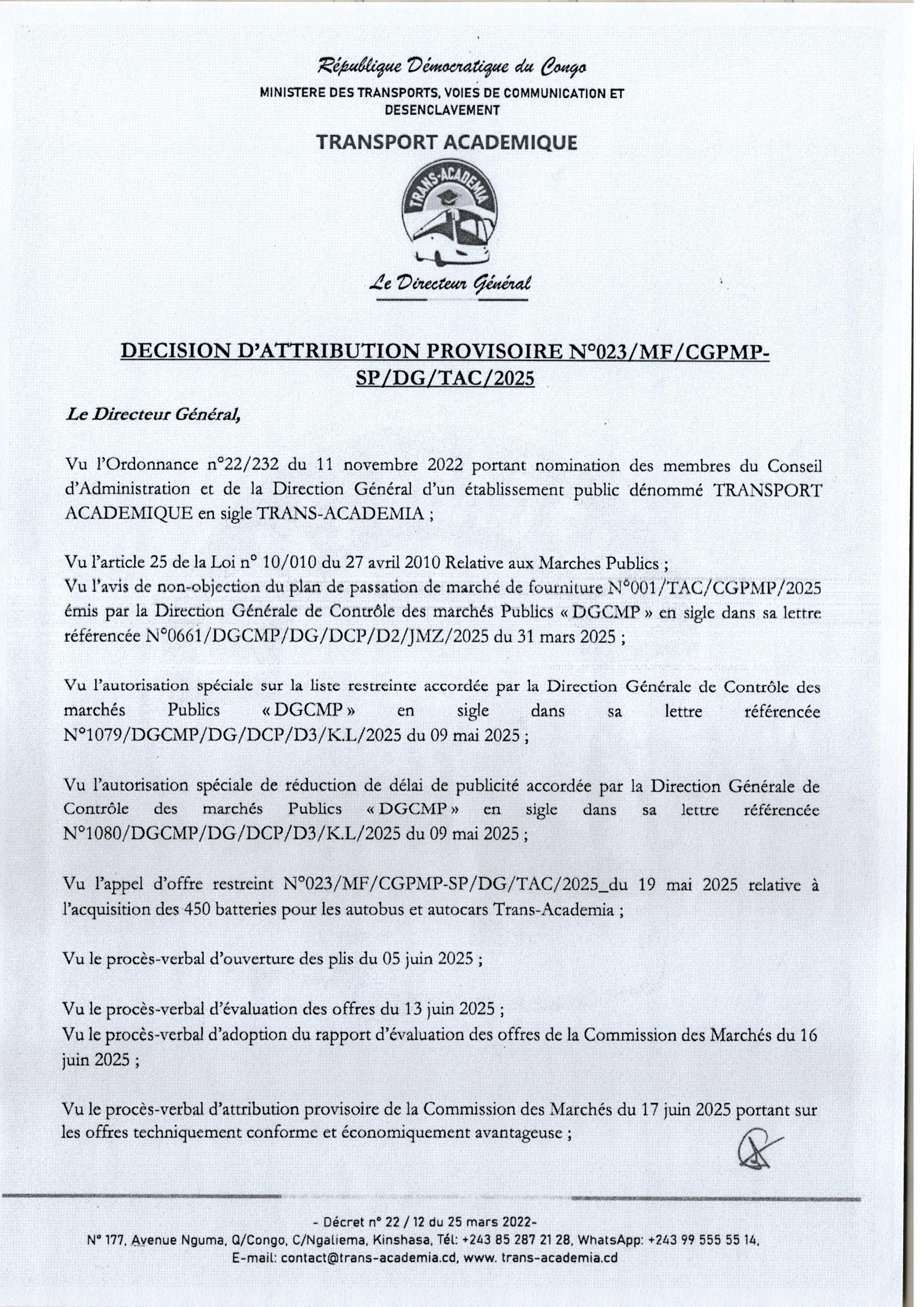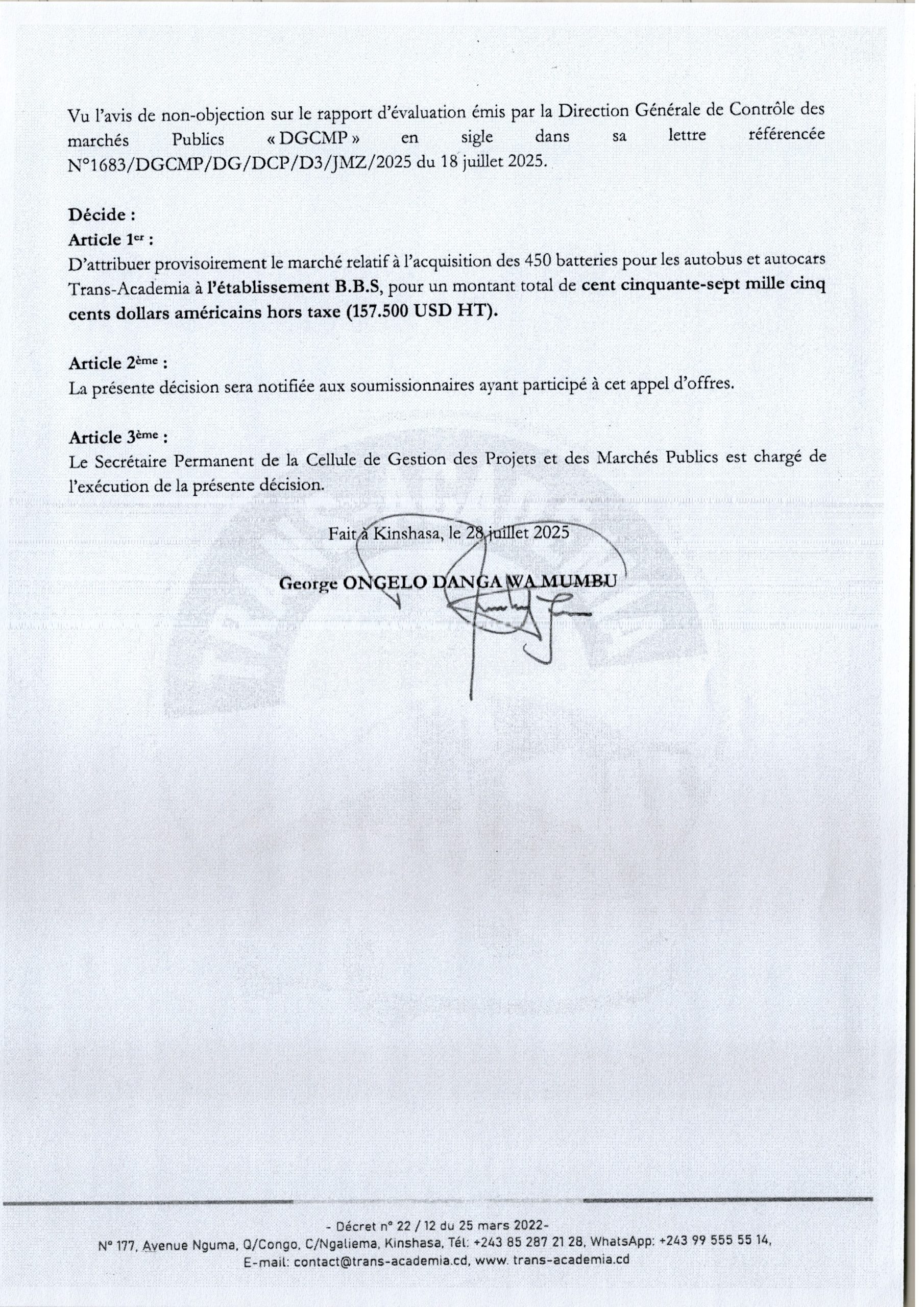 Attribution provisoire accordée à l’Établissement B.B.S, relatif à l’acquisition des 450 batteries pour les autobus et autocars Trans-Academia.