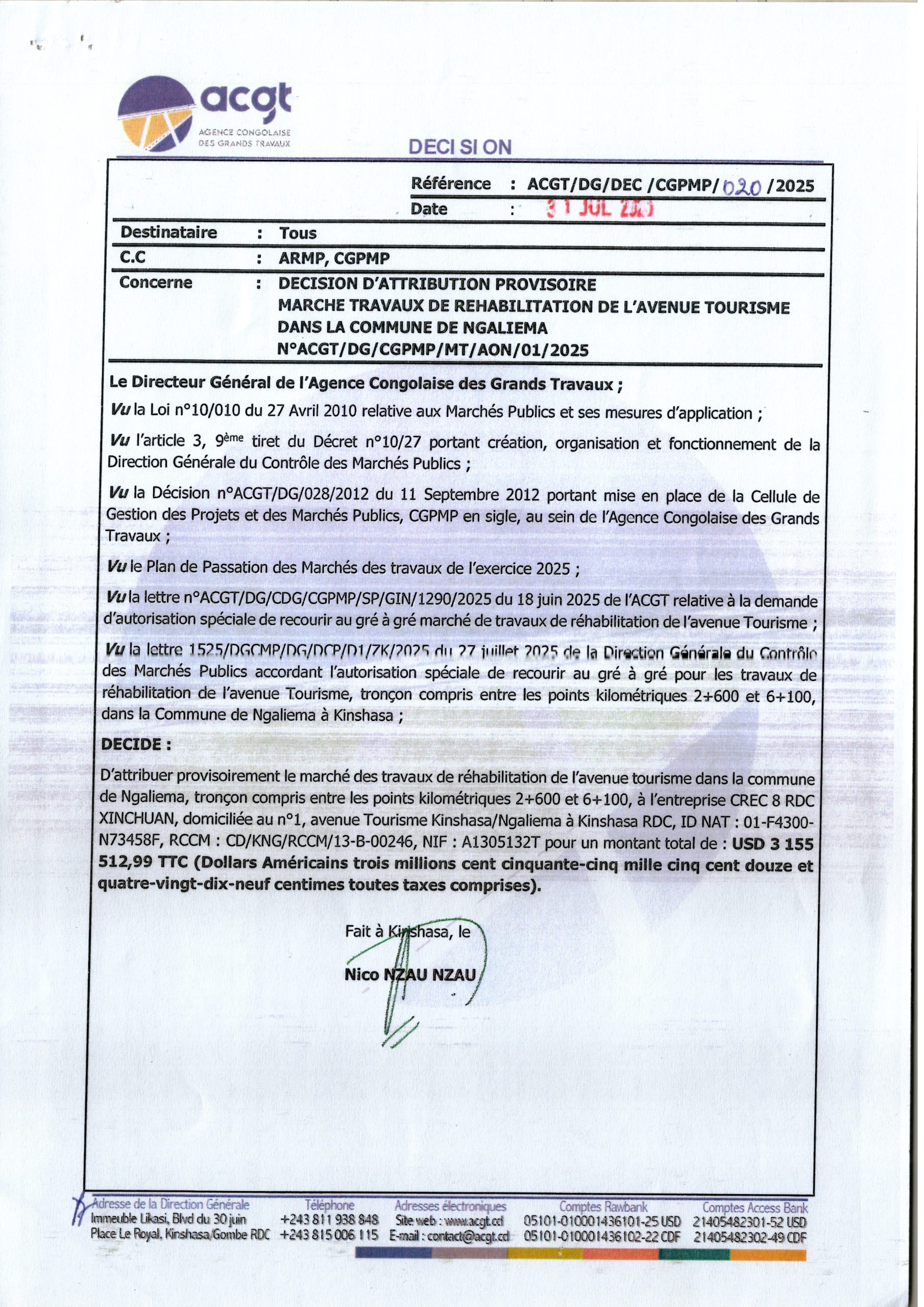 Attribution provisoire accordée à la société “CREC 8 RDC XINCHUAN” le marché relatif aux travaux de réhabilition de l’avenue TOURISME dans la commune de Ngaliema.