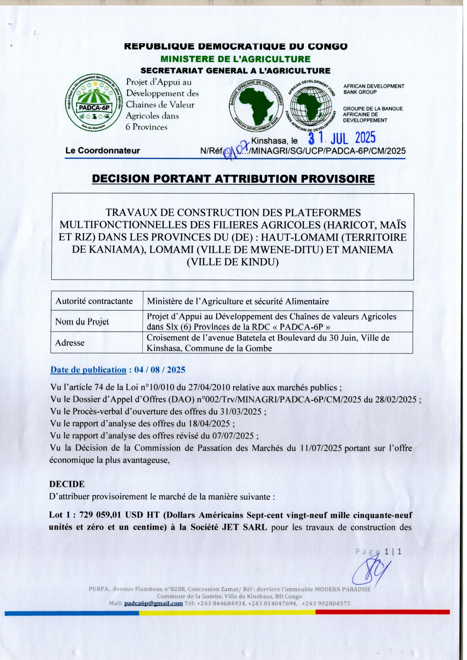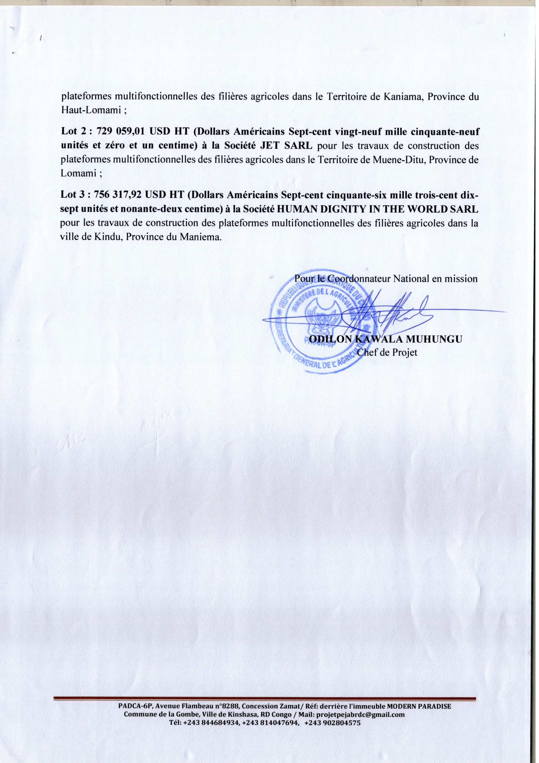 Attribution provisoire du marché relatif aux travaux de construction des plateformes multifonctionnels des filières agricoles (Haricot, Mais et Riz) dans les provinces du de Haut-Lomami (Territoire de Kaniama), Lomami (Ville de Mwene-Ditu) et Maniema (Ville de Kindu).