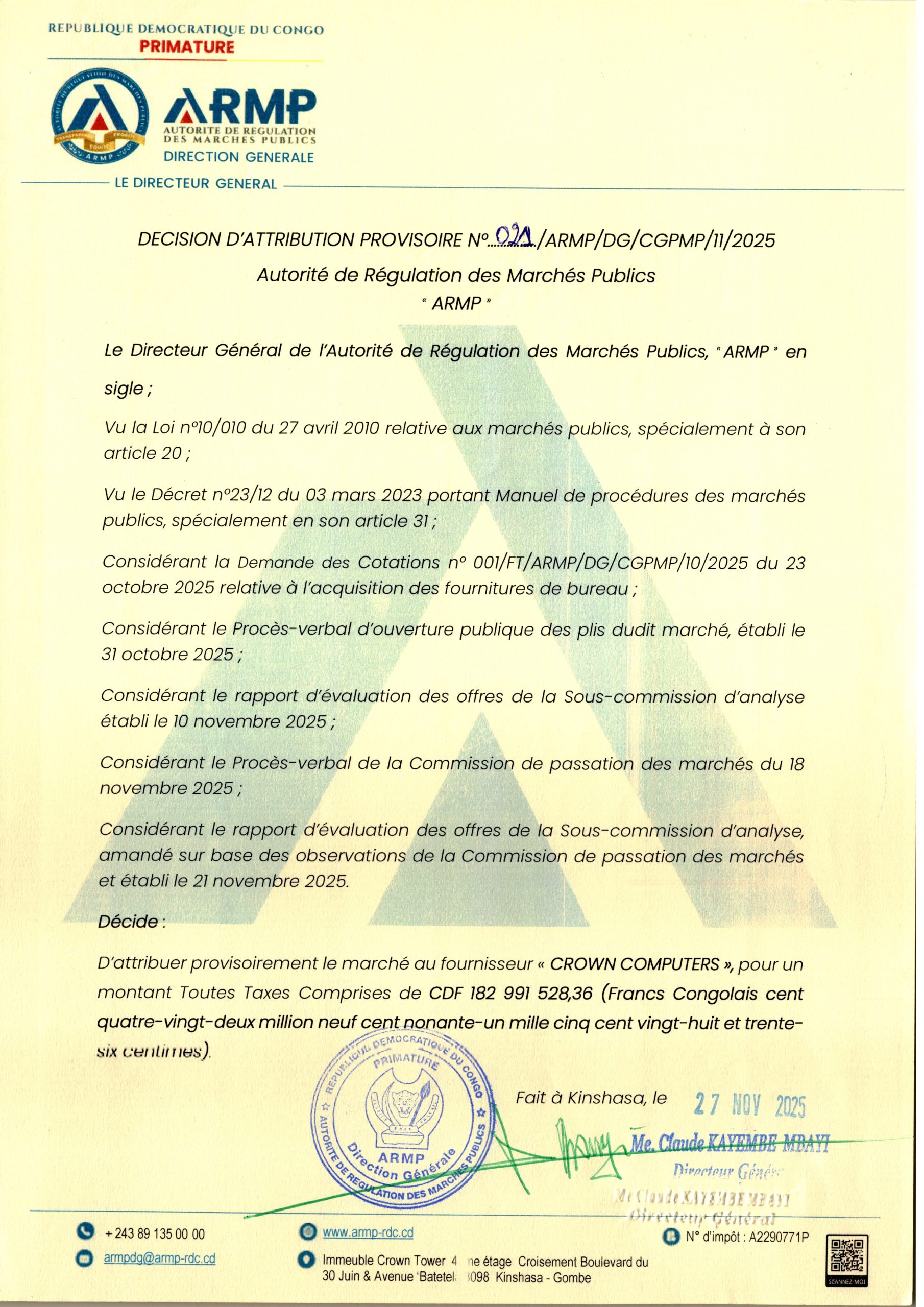 Attribution provisoire accordée à la société “CROWN COMPUTERS” relative au marché d’acquisition des fournitures de bureau.