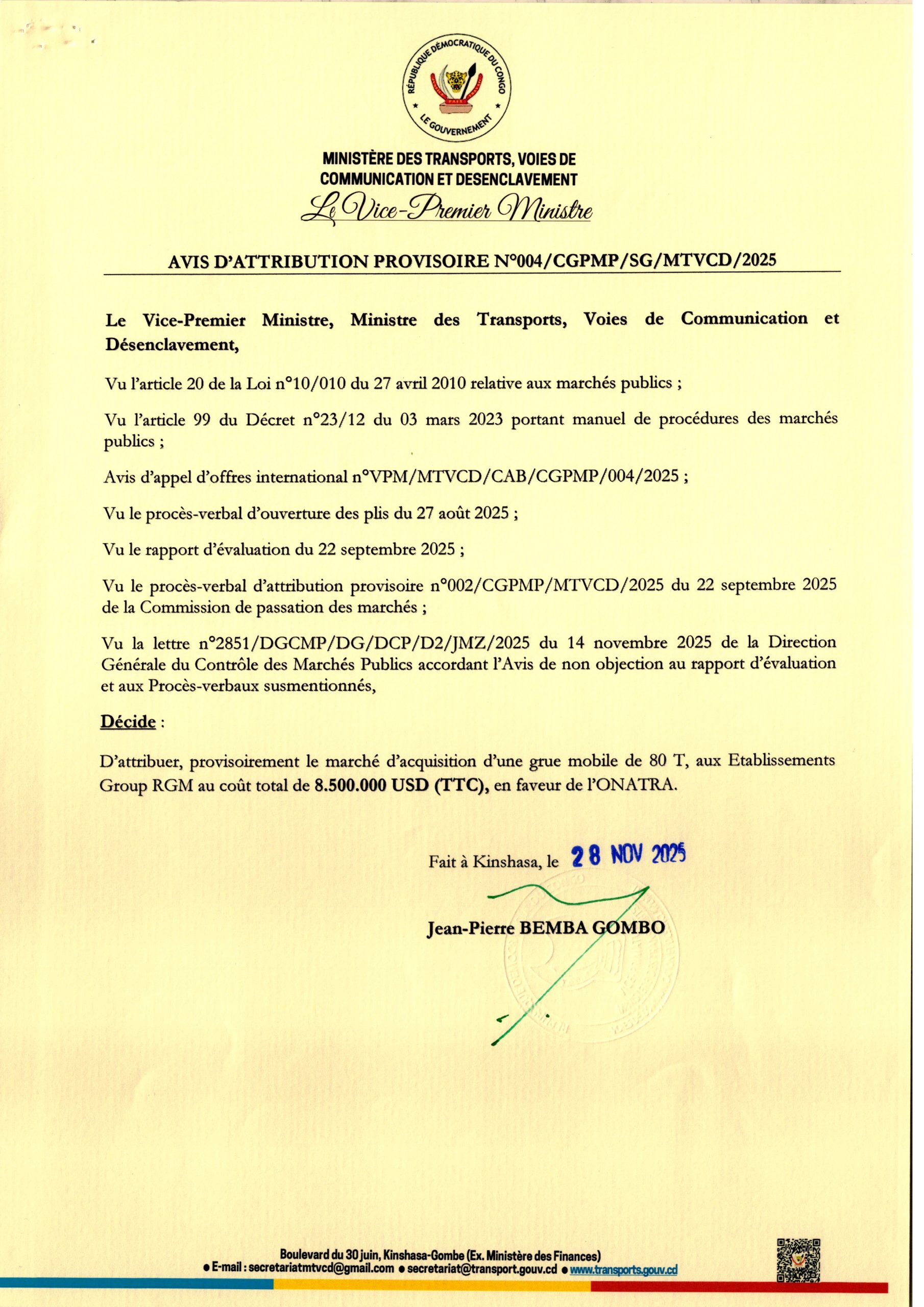 Attribution provisoire accordée à l’Etablissement “GROUP RGM” relatif au marché d’acquisition d’une grue de 80T en faveur de l’ONATRA.