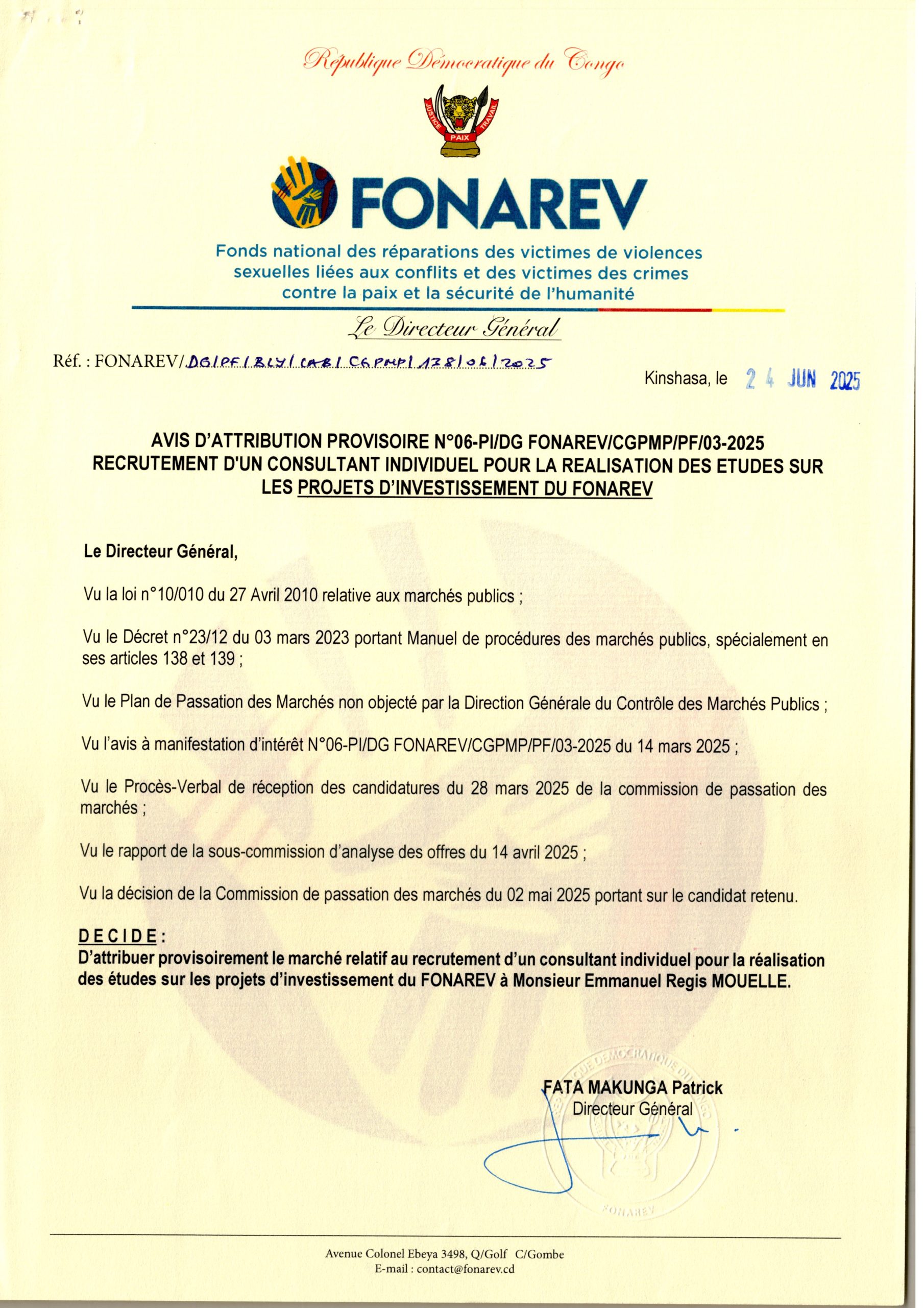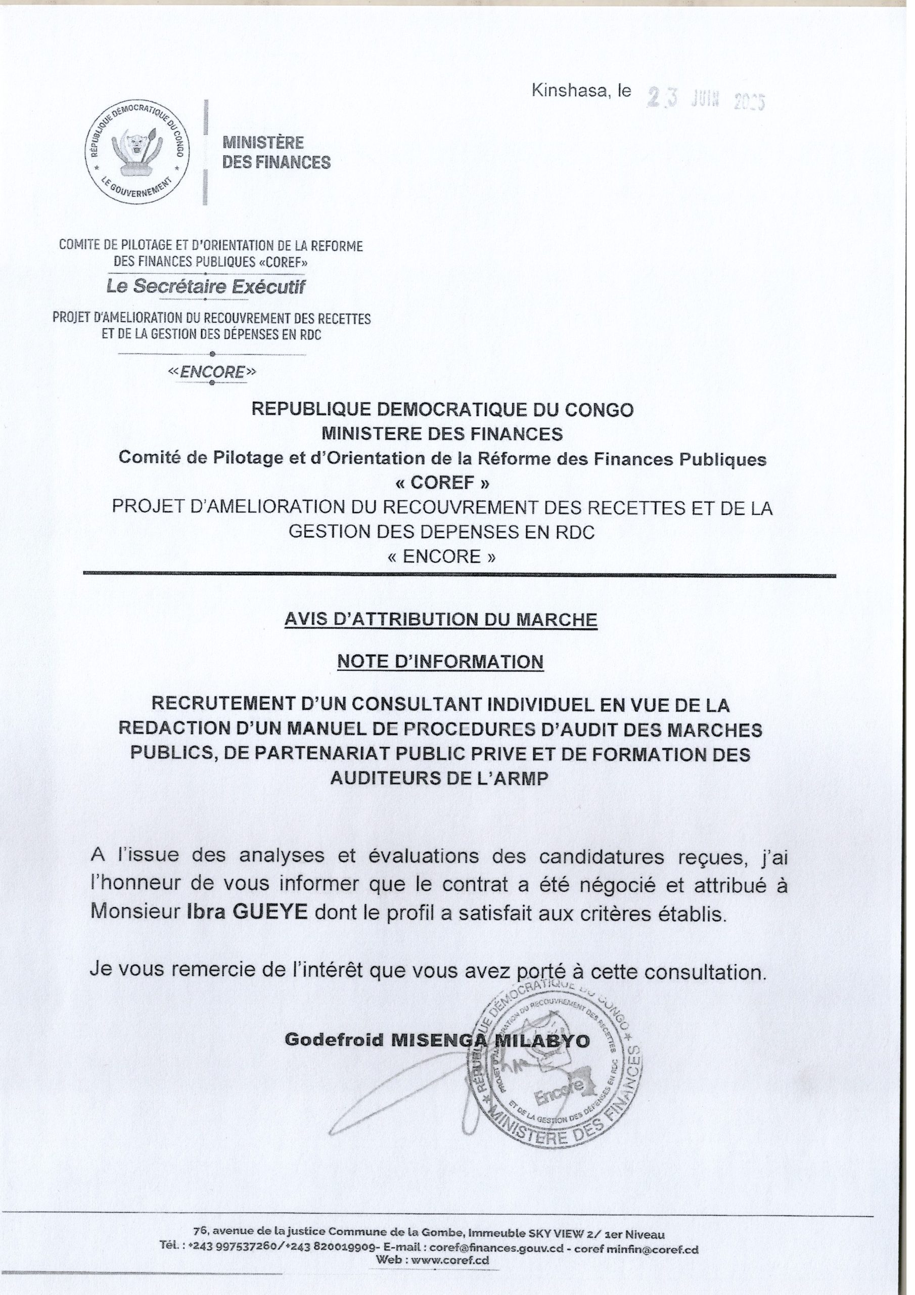 Attribution provisoire accordée à Monsieur Ibra GUEYE relative au recrutement d’un consultant Individuel en vue de la rédaction d’un Manuel de Procédures d’Audit des marchés Publics, de Partenariat Public et Privé et de Formation des Auditeurs de l’ARMP