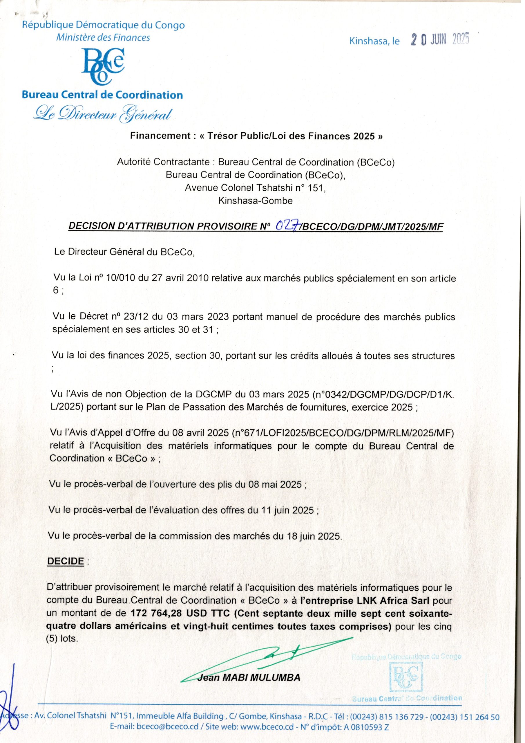 Attribution provisoire accordée à l’Entreprise LNK Africa relative à l’acquisition des matériels informatiques pour le compte du Bureau Central de Coordination (BCECO)