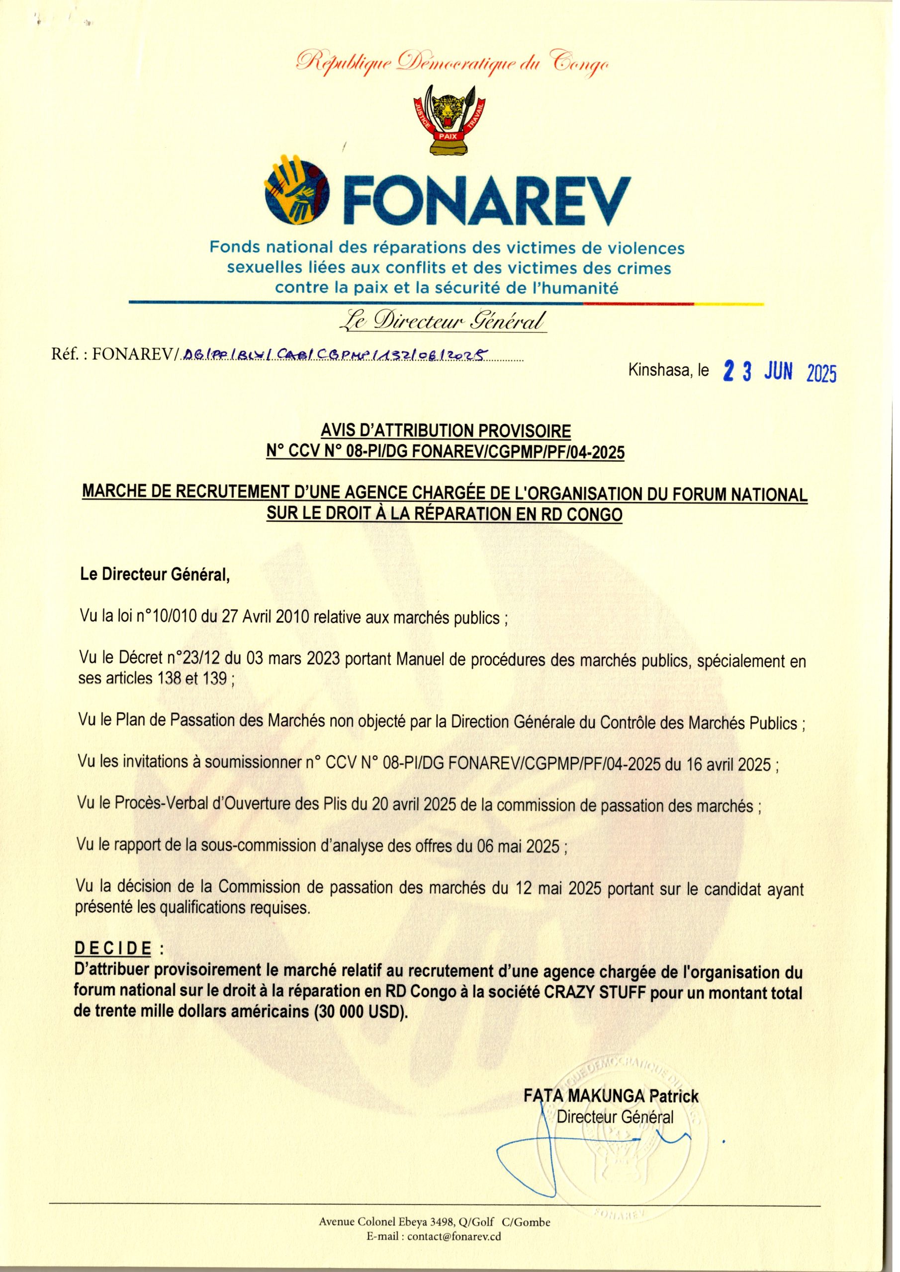 Attribution provisoire accordée à la société CRAZY STUFF relative au recrutement d’une agence chargée de l’organisation du forum national sur le droit à la réparation en RDC.