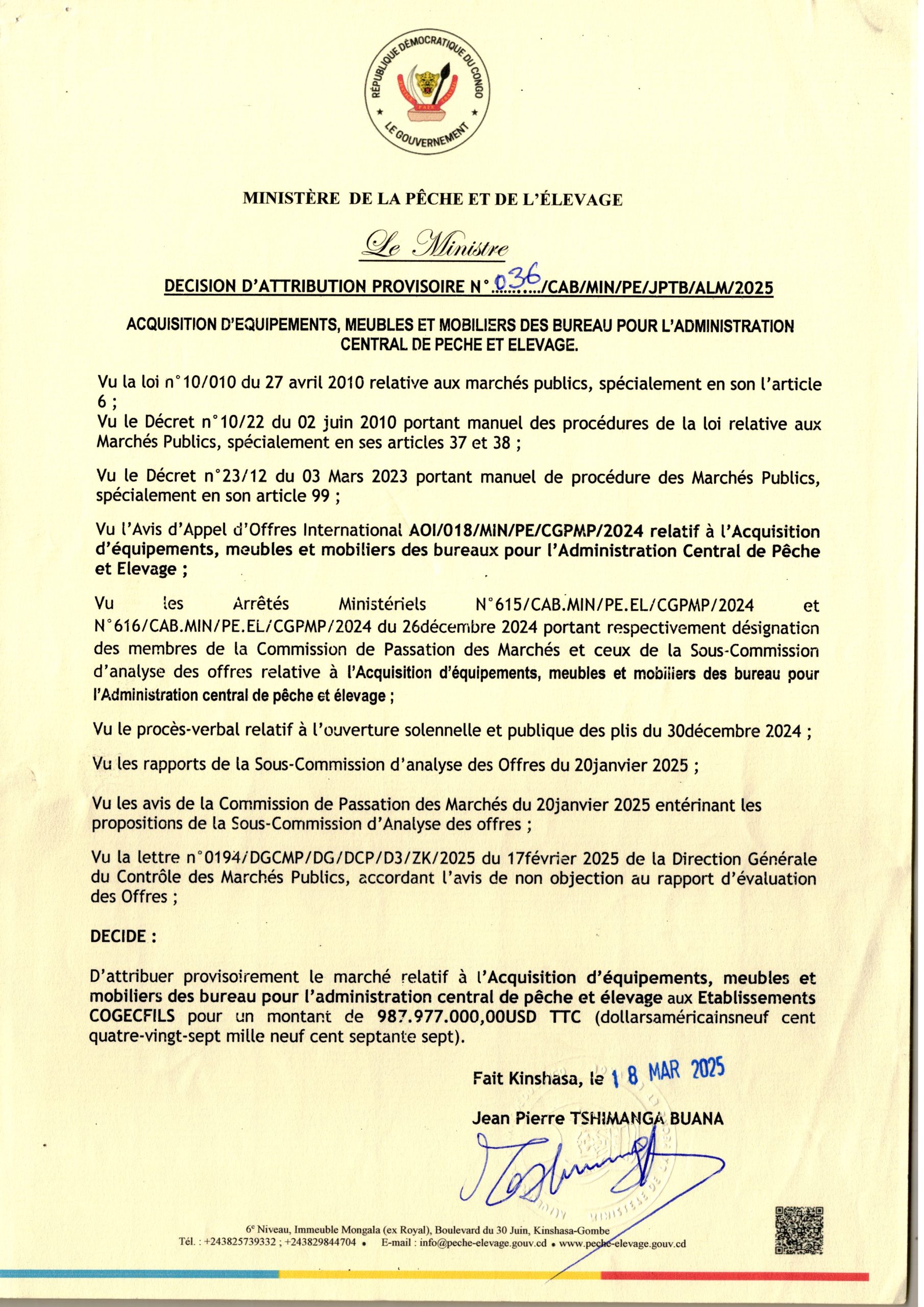 Attribution provisoire accordée aux Etablissements COGECFILS relative à l’acquisition d’équipements, meubles et mobiliers des bureau pour l’administration central de pêche et élevage.