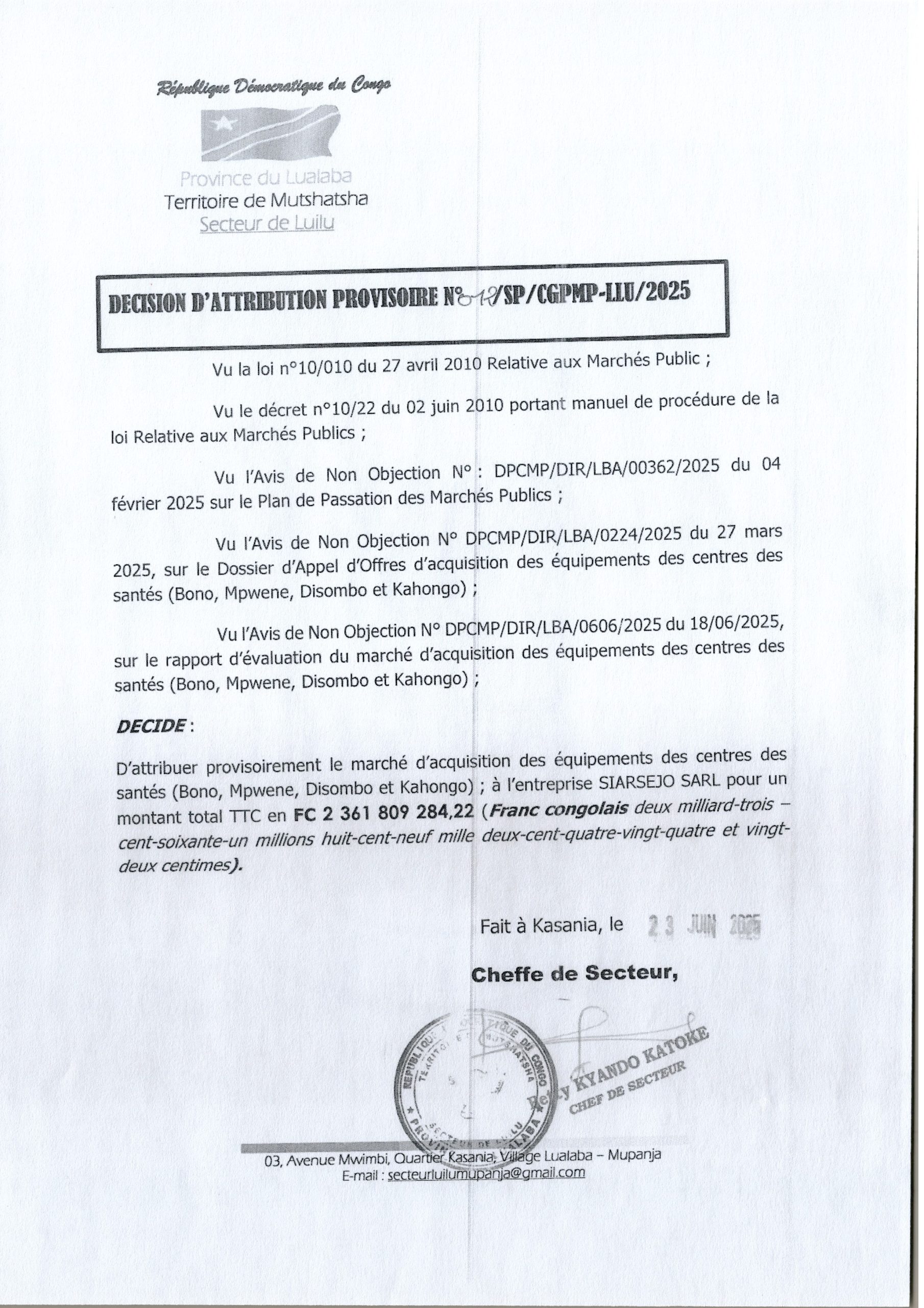 Attribution provisoire accordée à l’Entreprise SIARSEJO relative à l’acquisition des équipements des centres des santés (Bono, Mpwene, Disombo, et Kahongo).