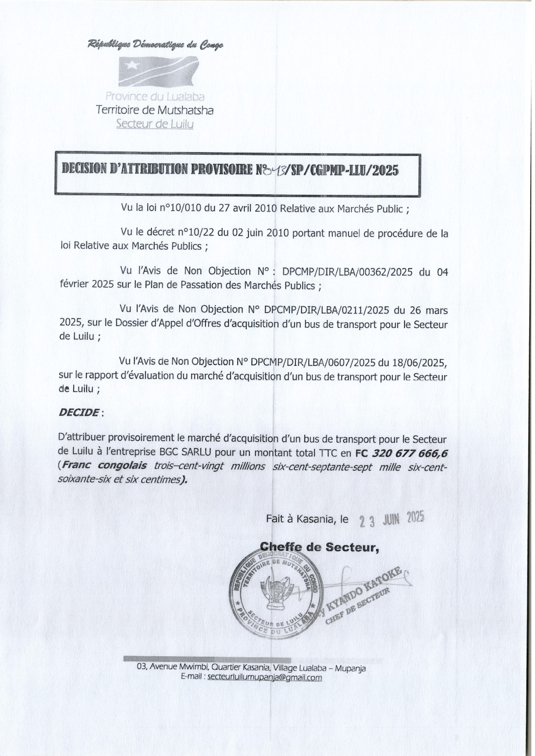 Attribution provisoire accordée à l’Entreprise BGC SARLU relative à l’acquisition d’un bus de transport pour le Secteur de Luilu.