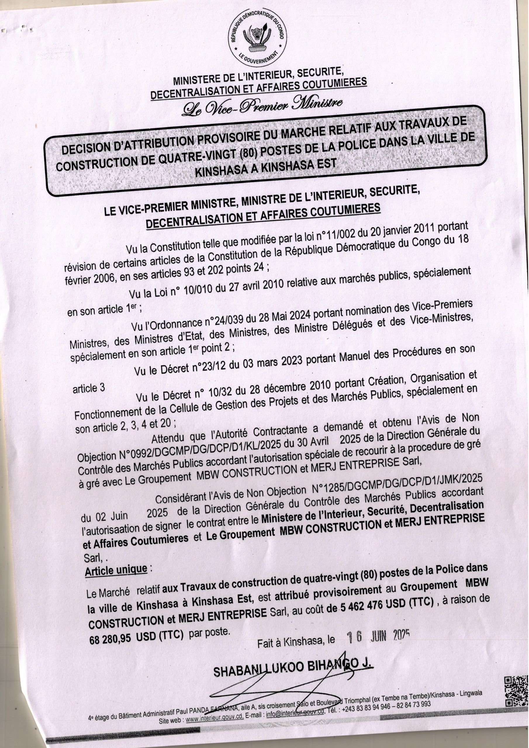 Attribution provisoire accordée au groupement “MBW CONSTRUCTION ET MERJ ENTREPRISE” aux travaux de construction de 80 postes de la police dans la ville de Kinshasa à Kinshasa Est.
