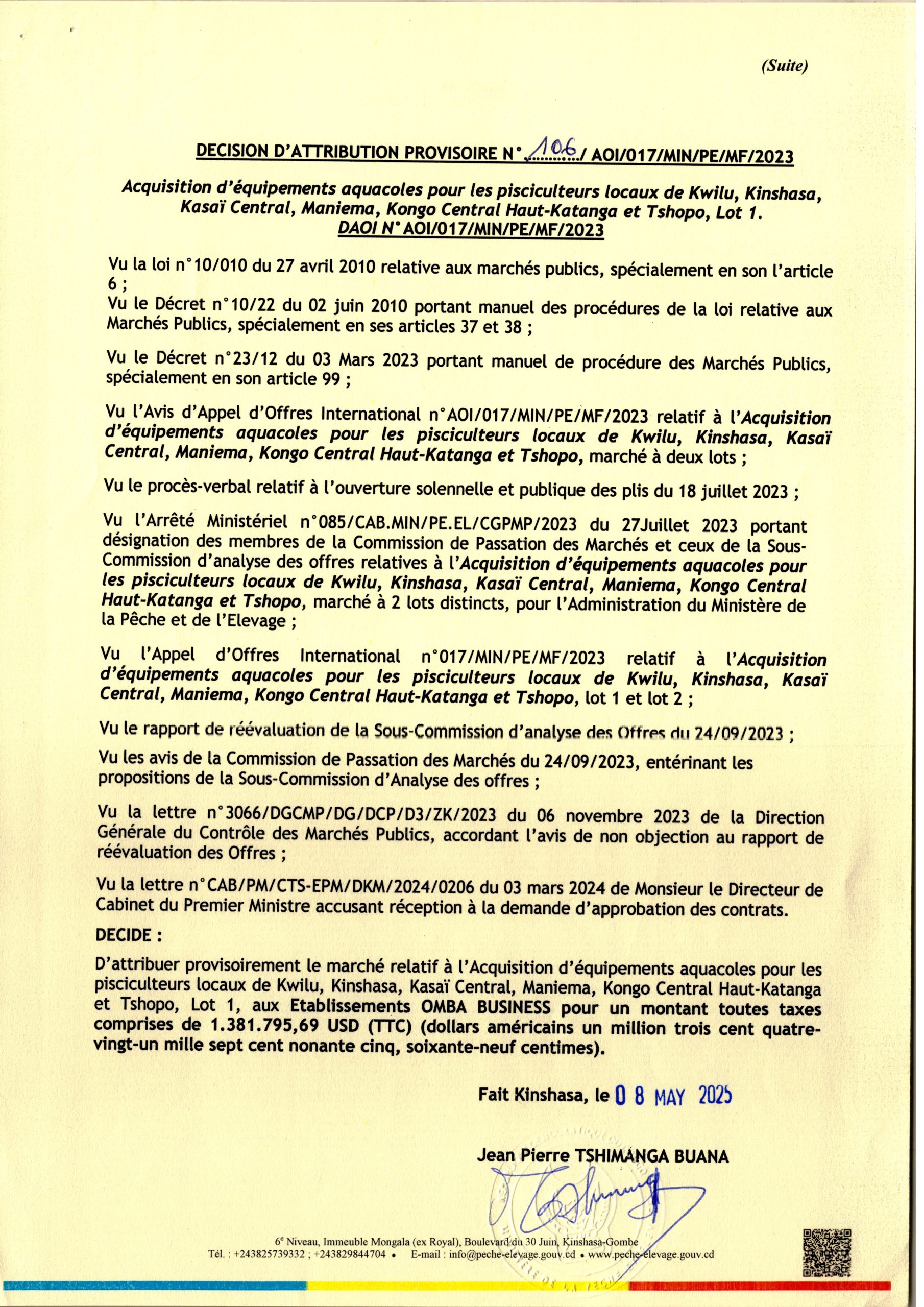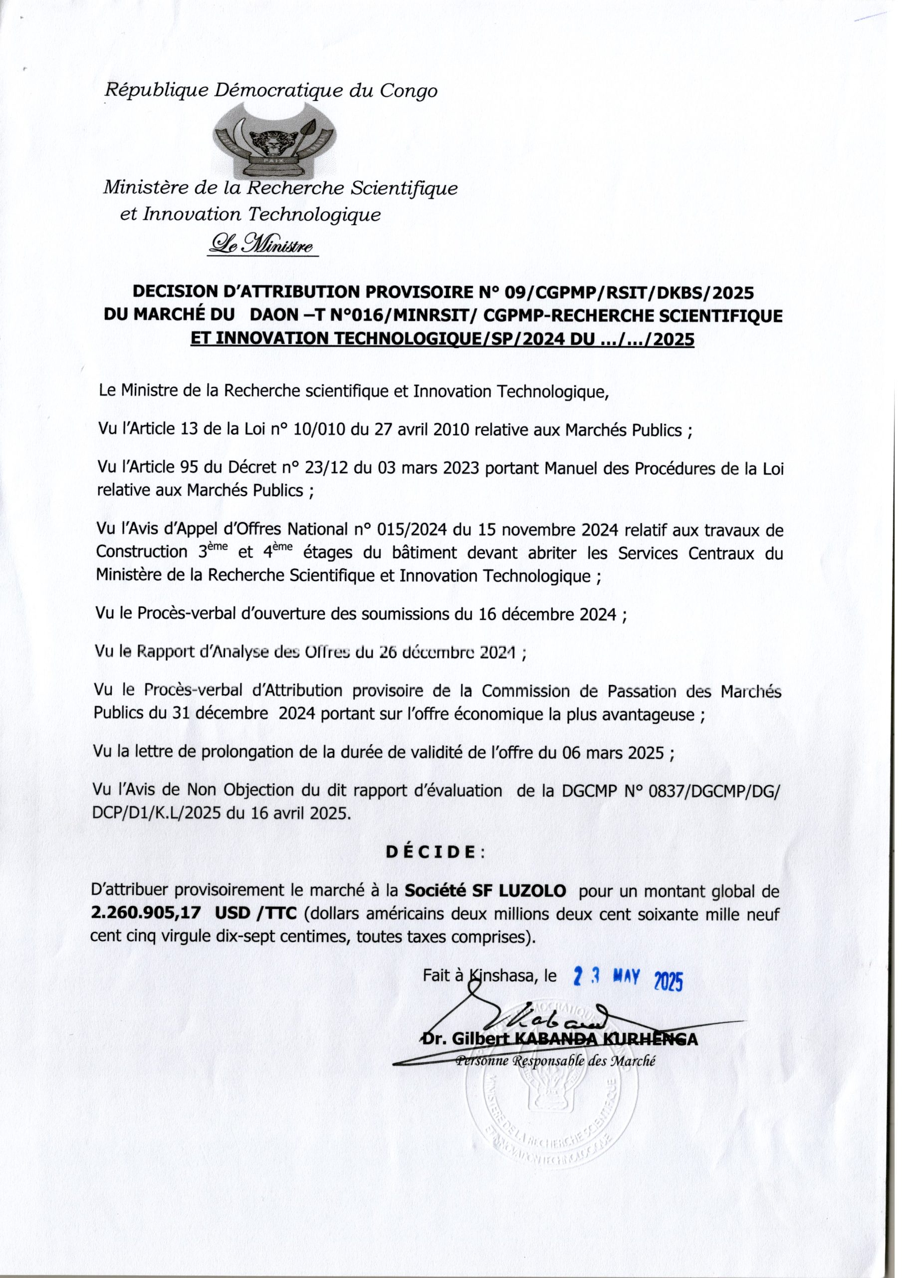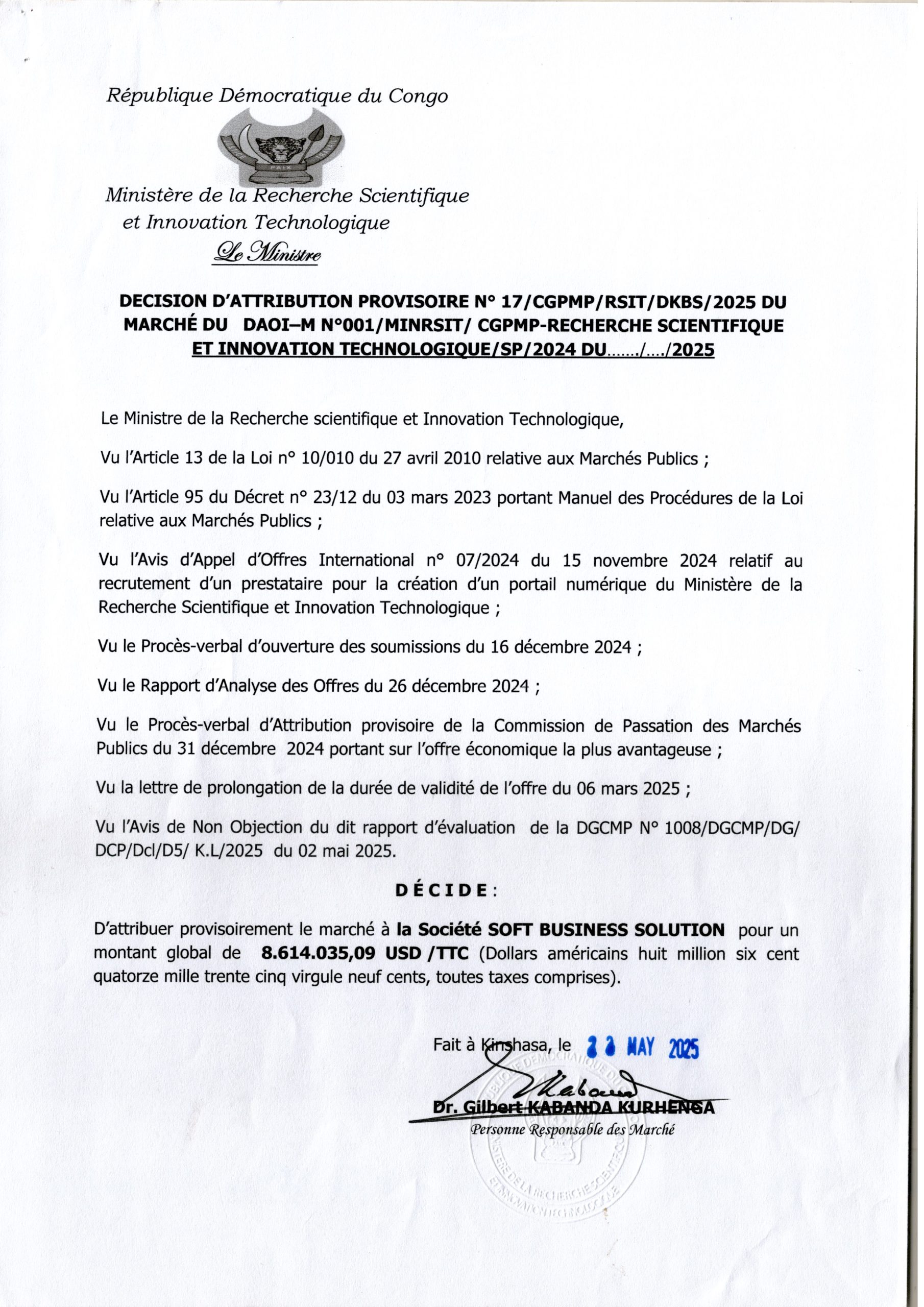 Attribution Provisoire du marché des services d’un consultant chargés de réaliser des études techniques et mener le contrôle des travaux de réhabilitation et modernisation de 17 axes de la voirie urbaine dans les districts de Lukunga et Mont-Amba dans la ville de Kinshasa, Lot 2, au Bureau d’Etudes SOCICOM Sarl