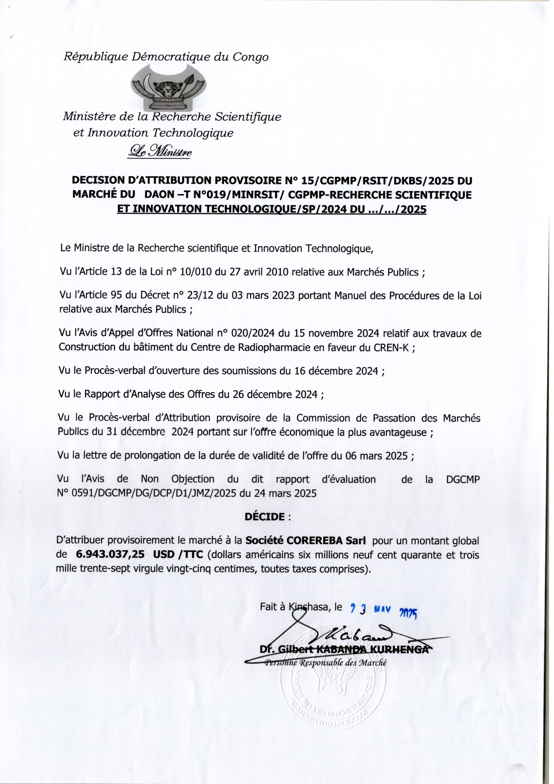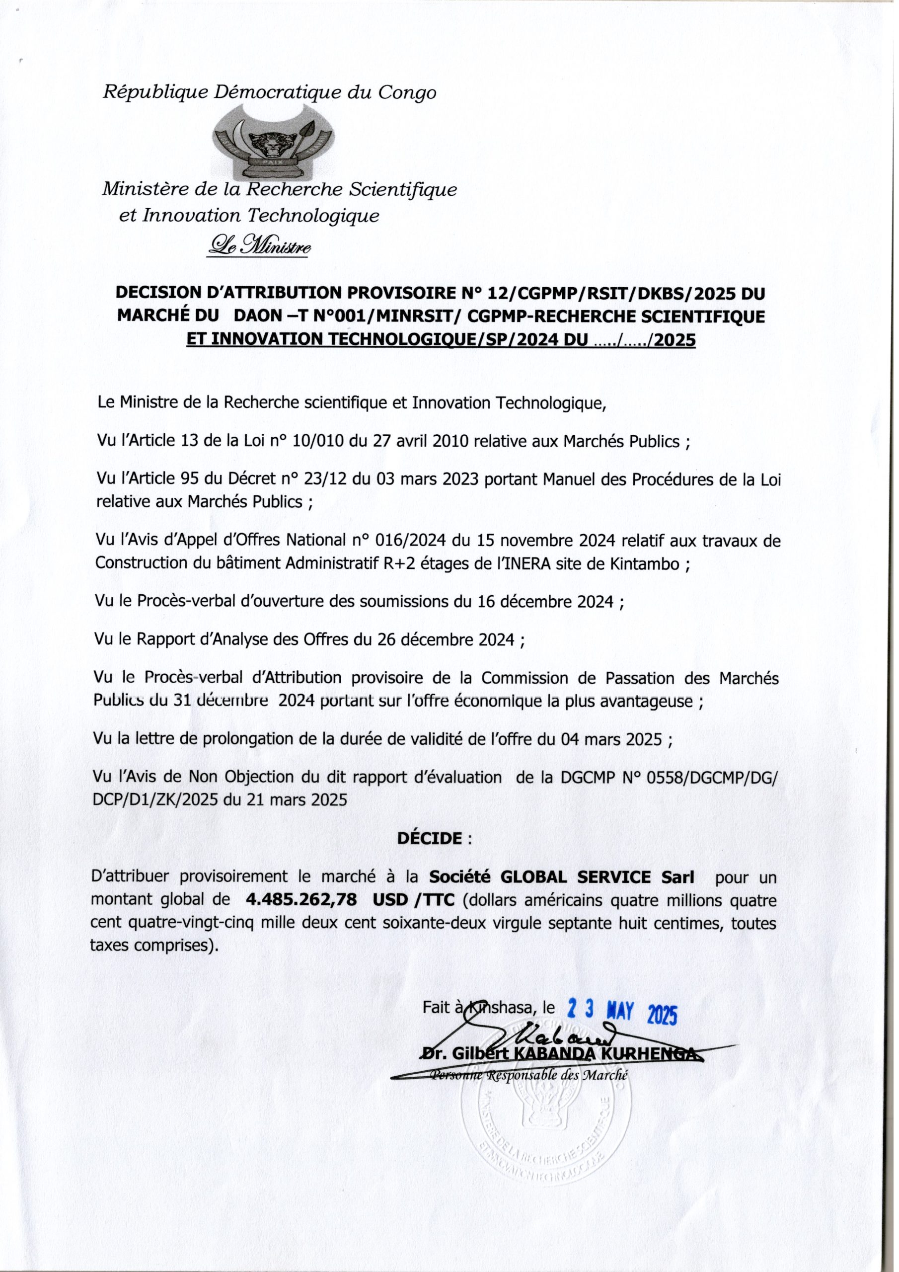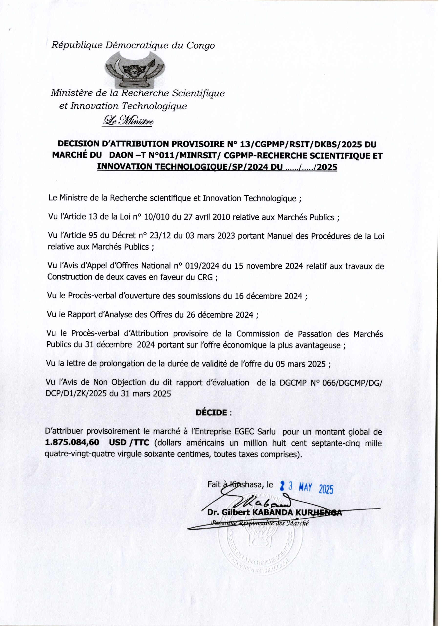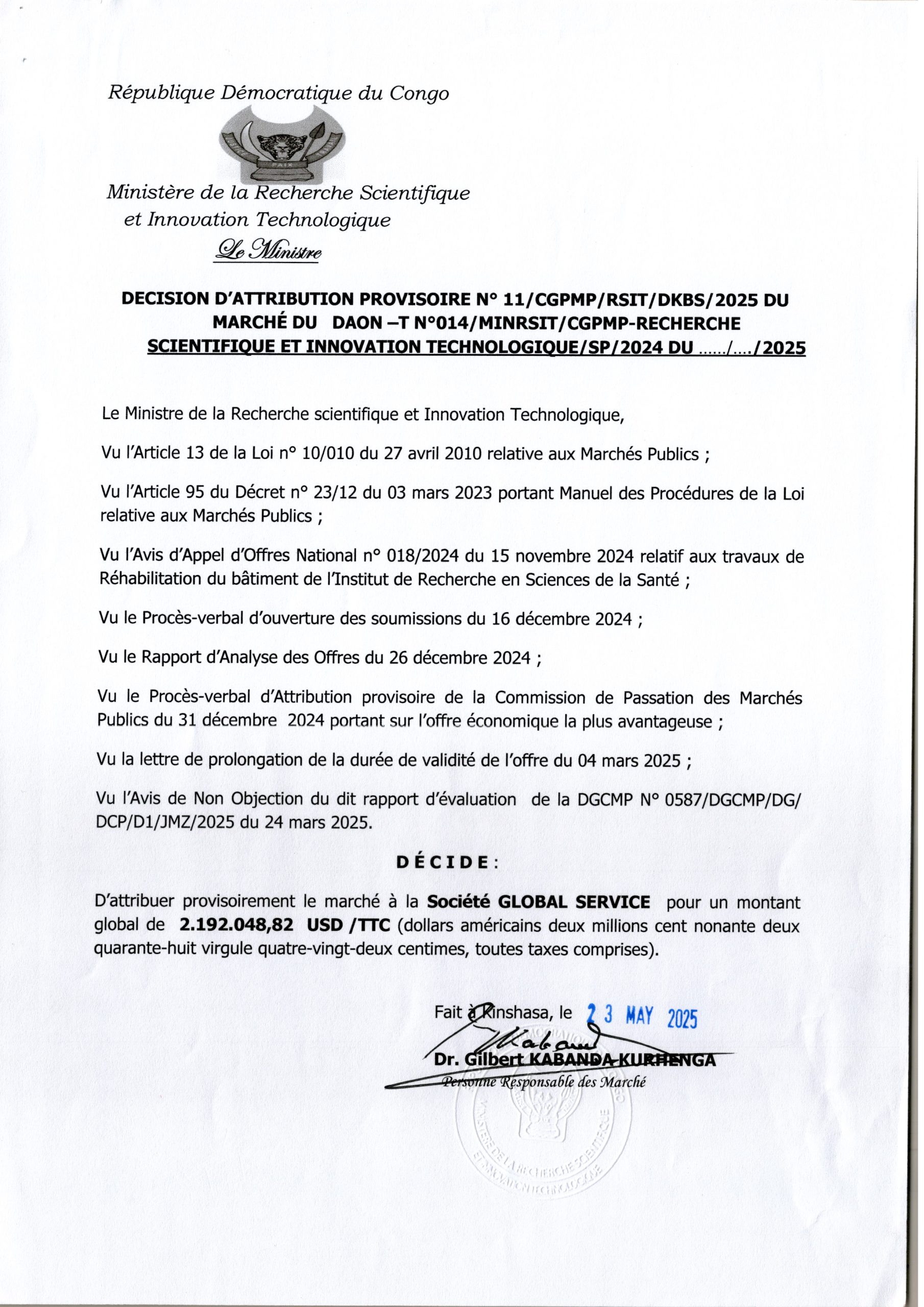 Attribution Provisoire du marché des services d’un consultant chargés de réaliser des études techniques et mener le contrôle des travaux de réhabilitation et modernisation de 17 axes de la voirie urbaine dans les districts de Lukunga et Mont-Amba dans la ville de Kinshasa, Lot 2, au Bureau d’Etudes SOCICOM Sarl