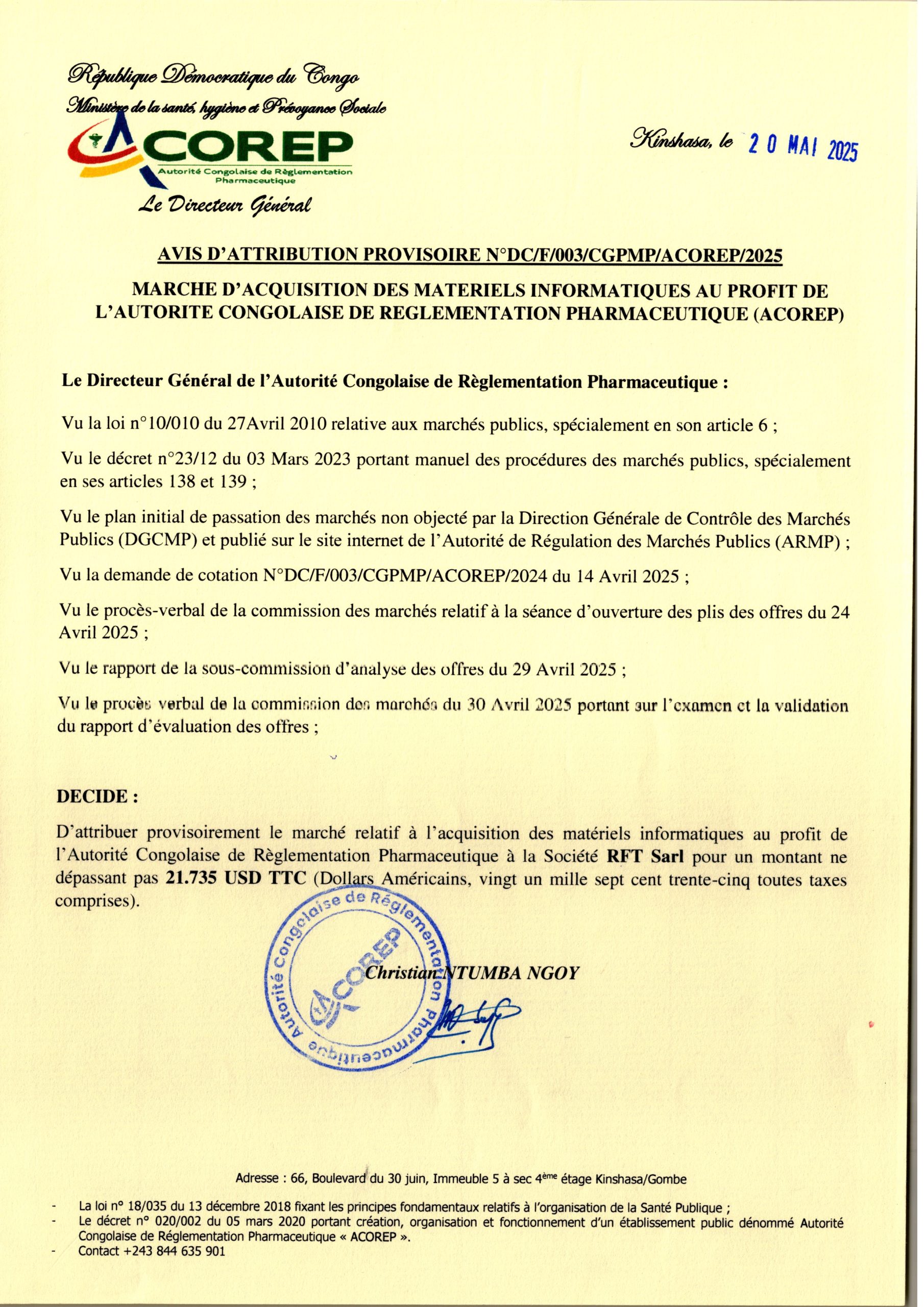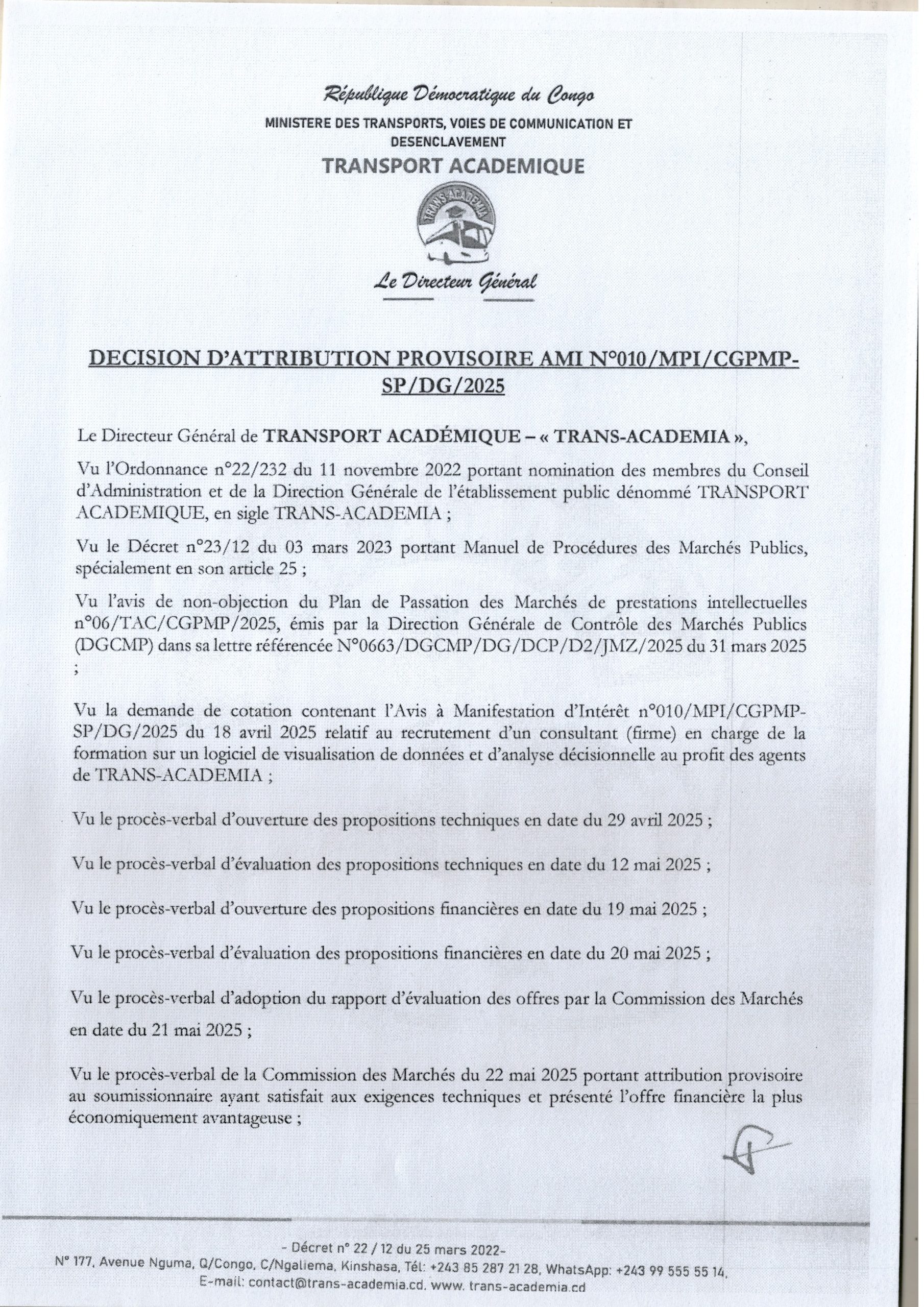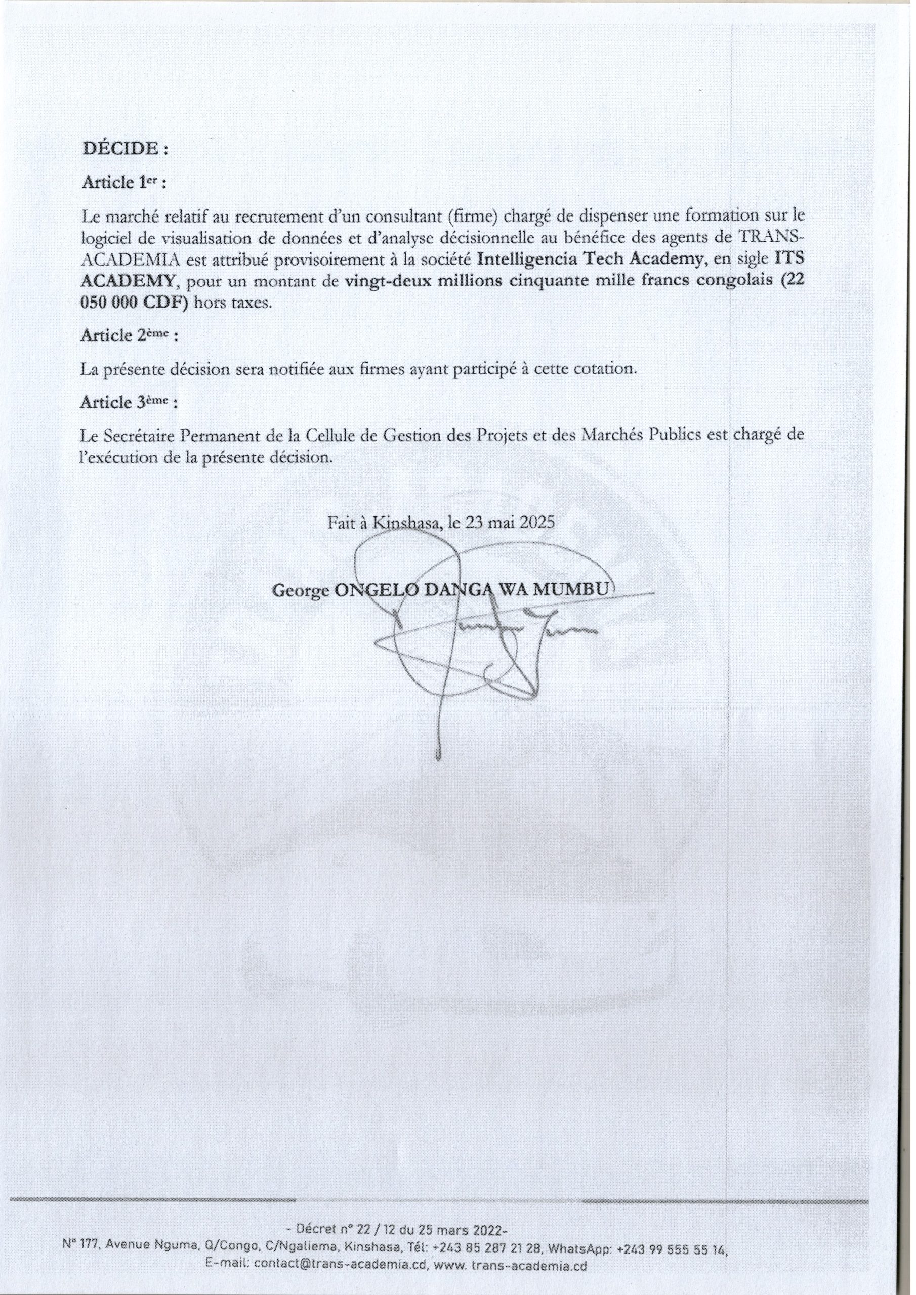 Attribution provisoire accordée à la société Intelligencia Tech Academy, en sigle ITS ACADEMY relative au recrutement d’un consultant (firme) chargé de dispenser une formation sur le logiciel de visualisation de données et d’analyse décisionnelle au bénéfice des agents de TRANS-ACADEMIA.